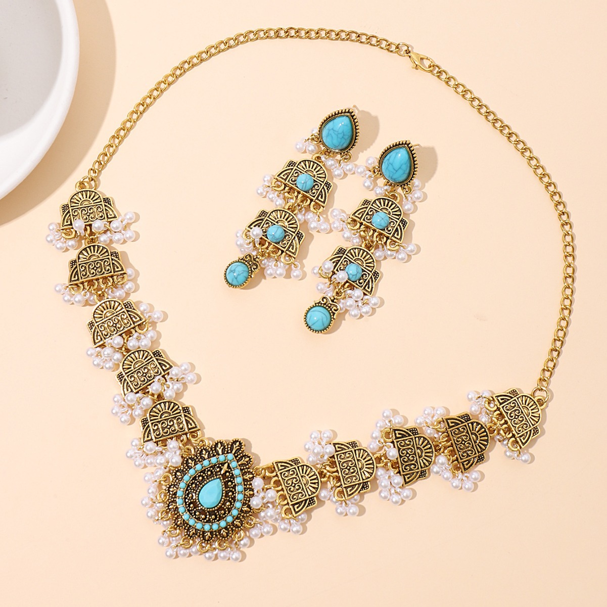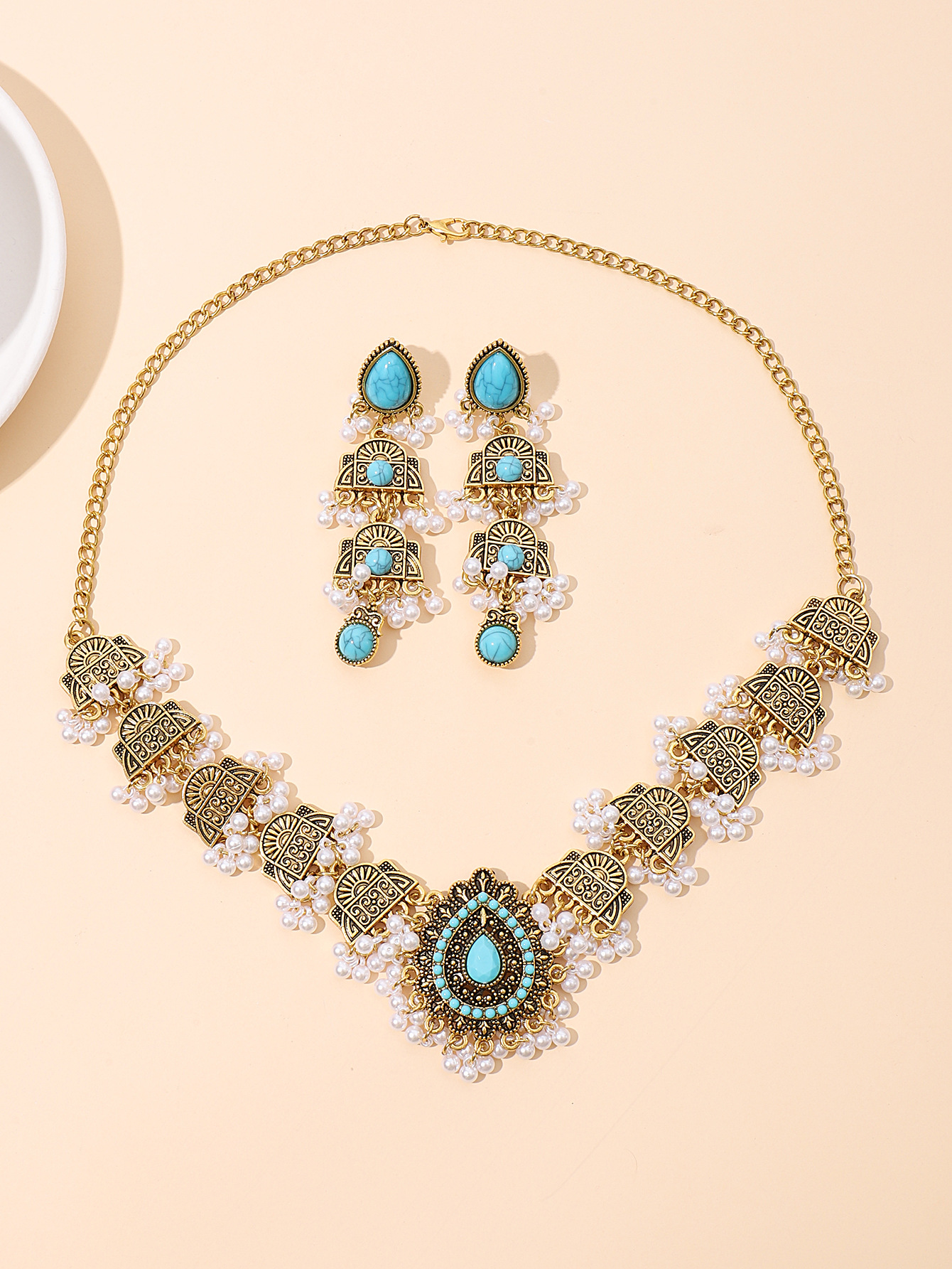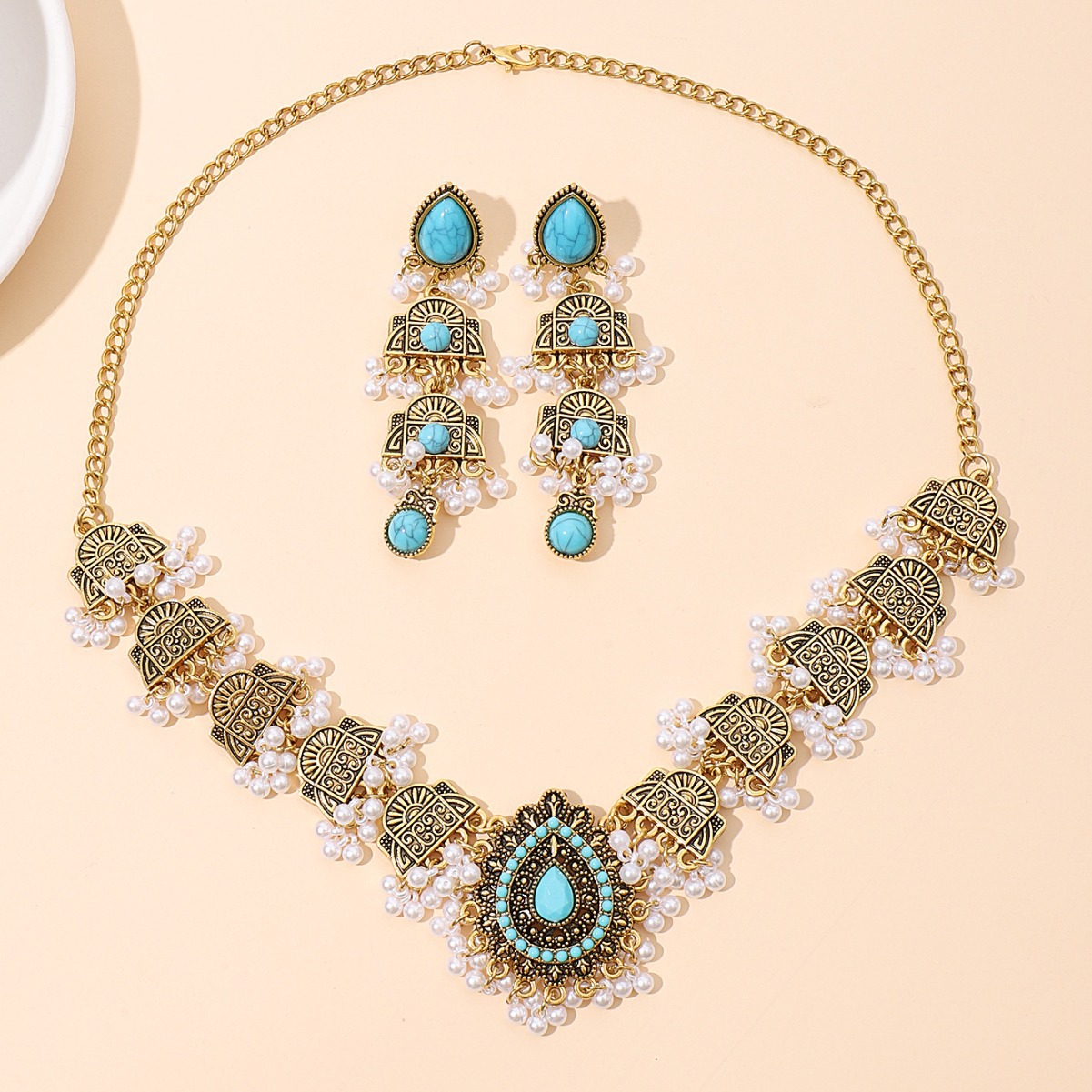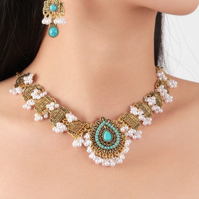 跨境欧美民族风波西米亚印度风复古金松石套装项链耳环中东套装