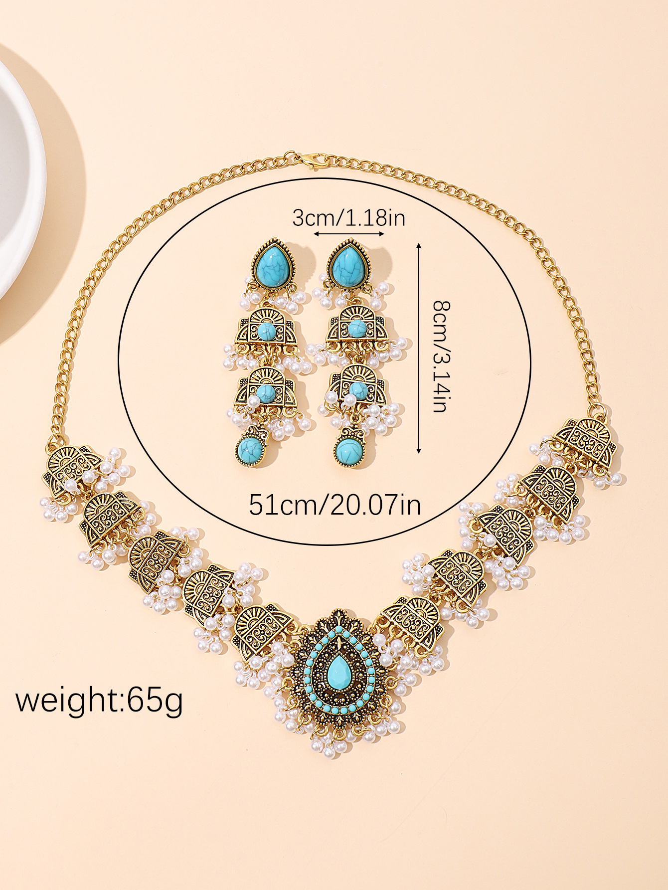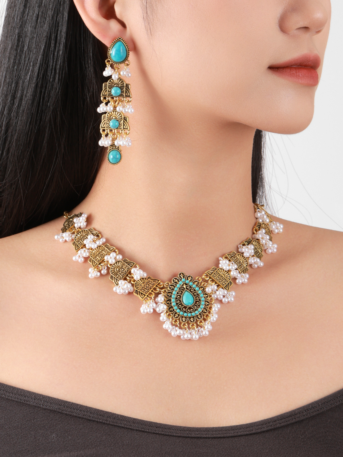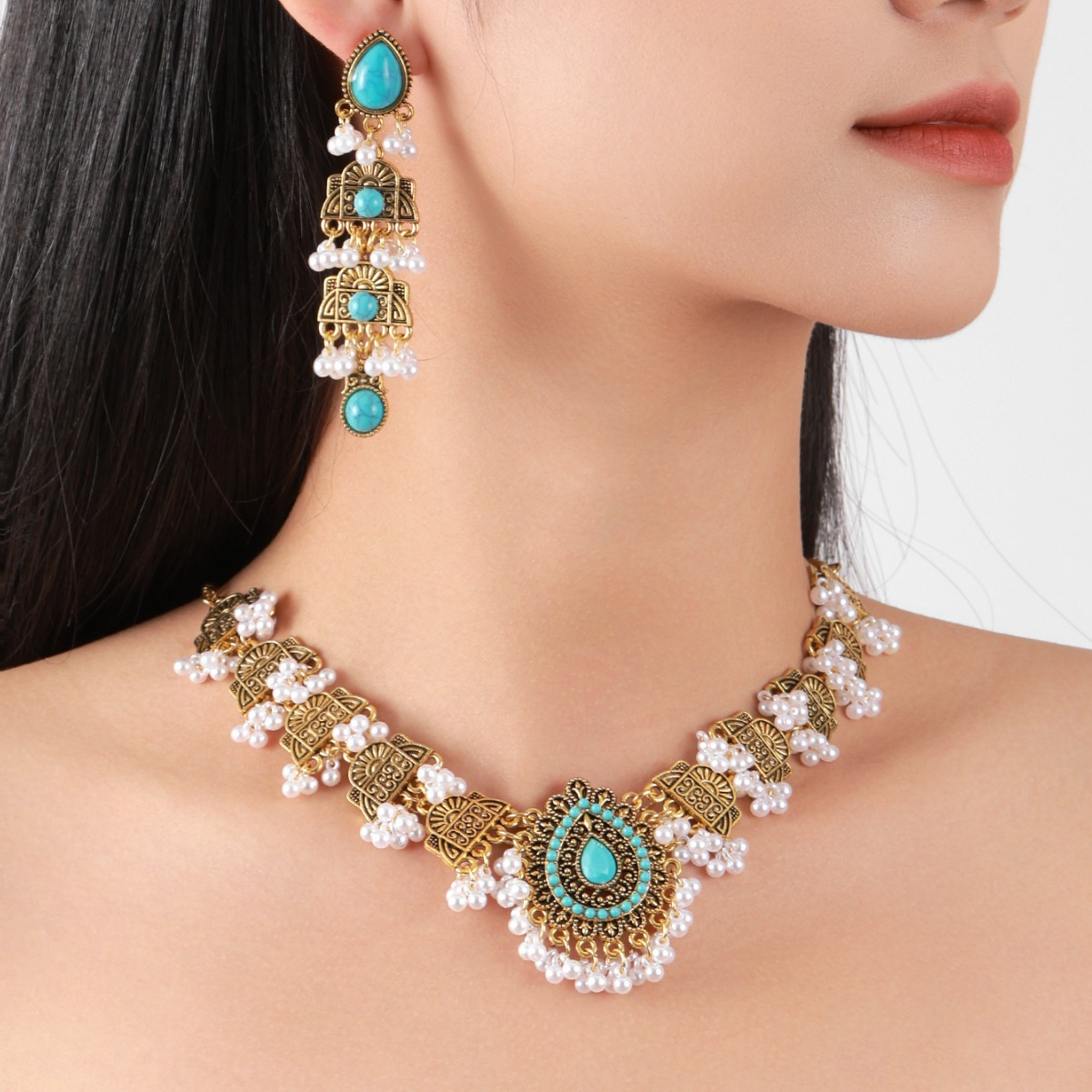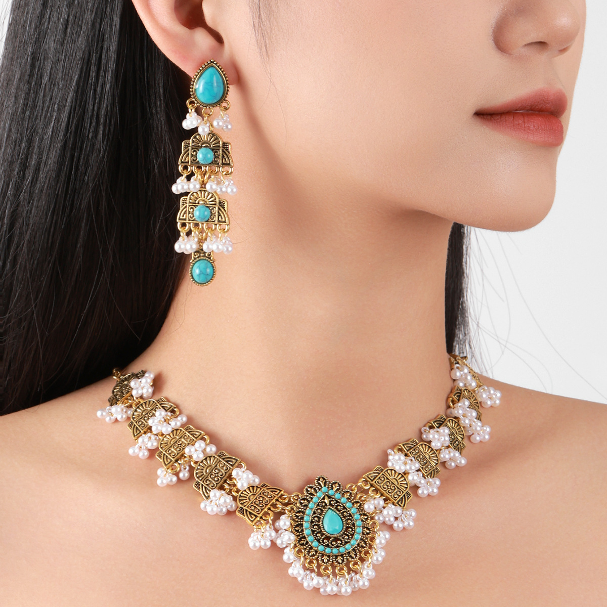 跨境欧美民族风波西米亚印度风复古金松石套装项链耳环中东套装