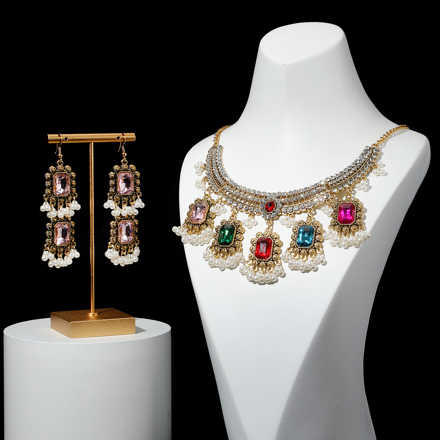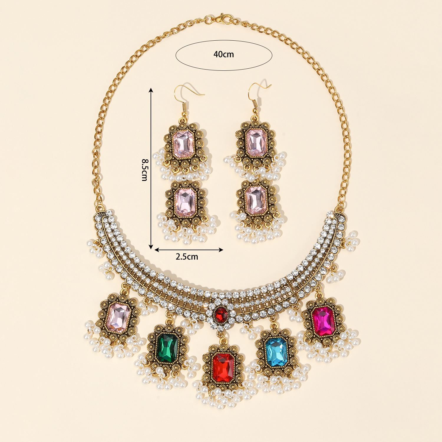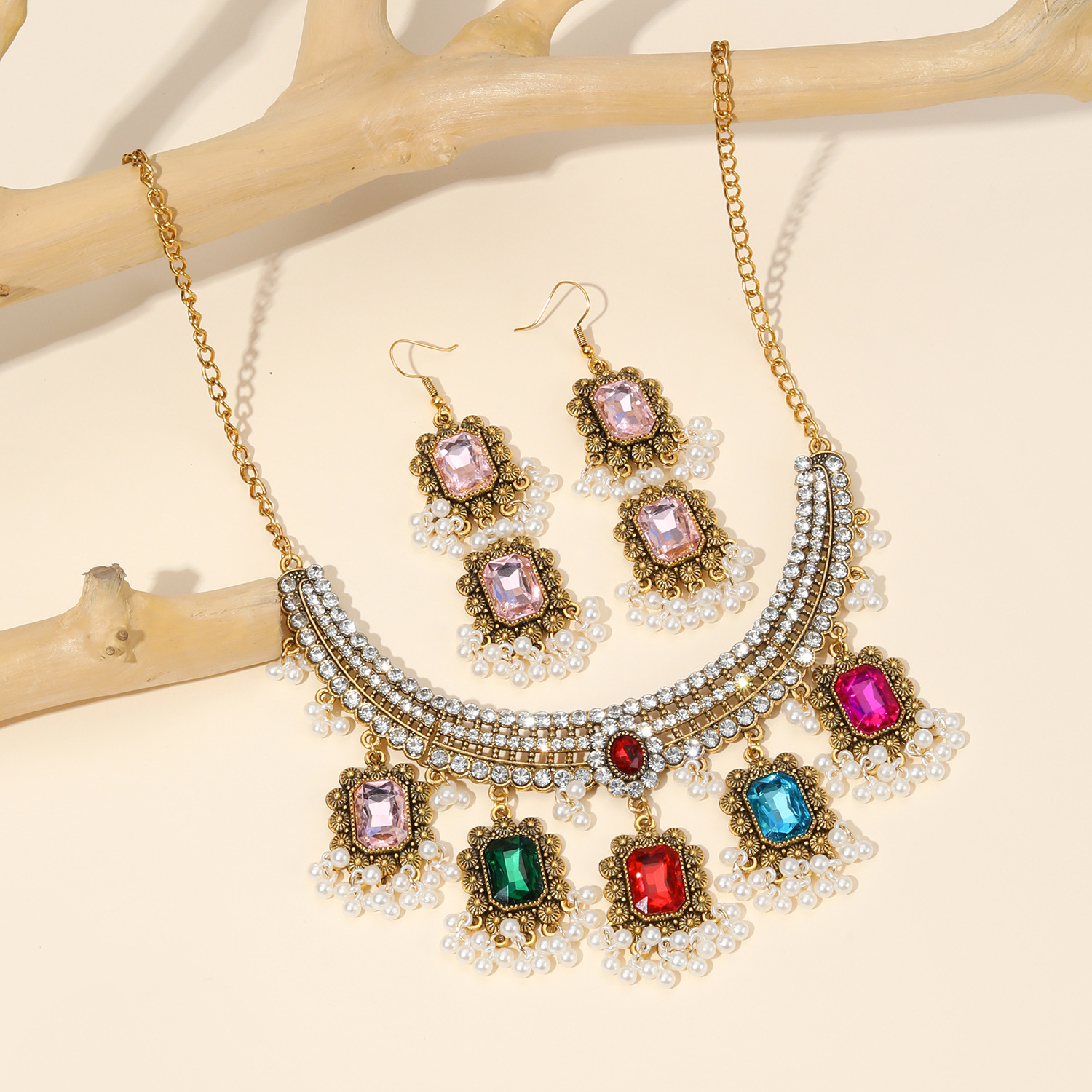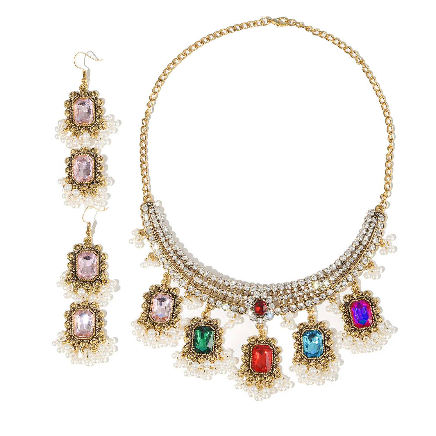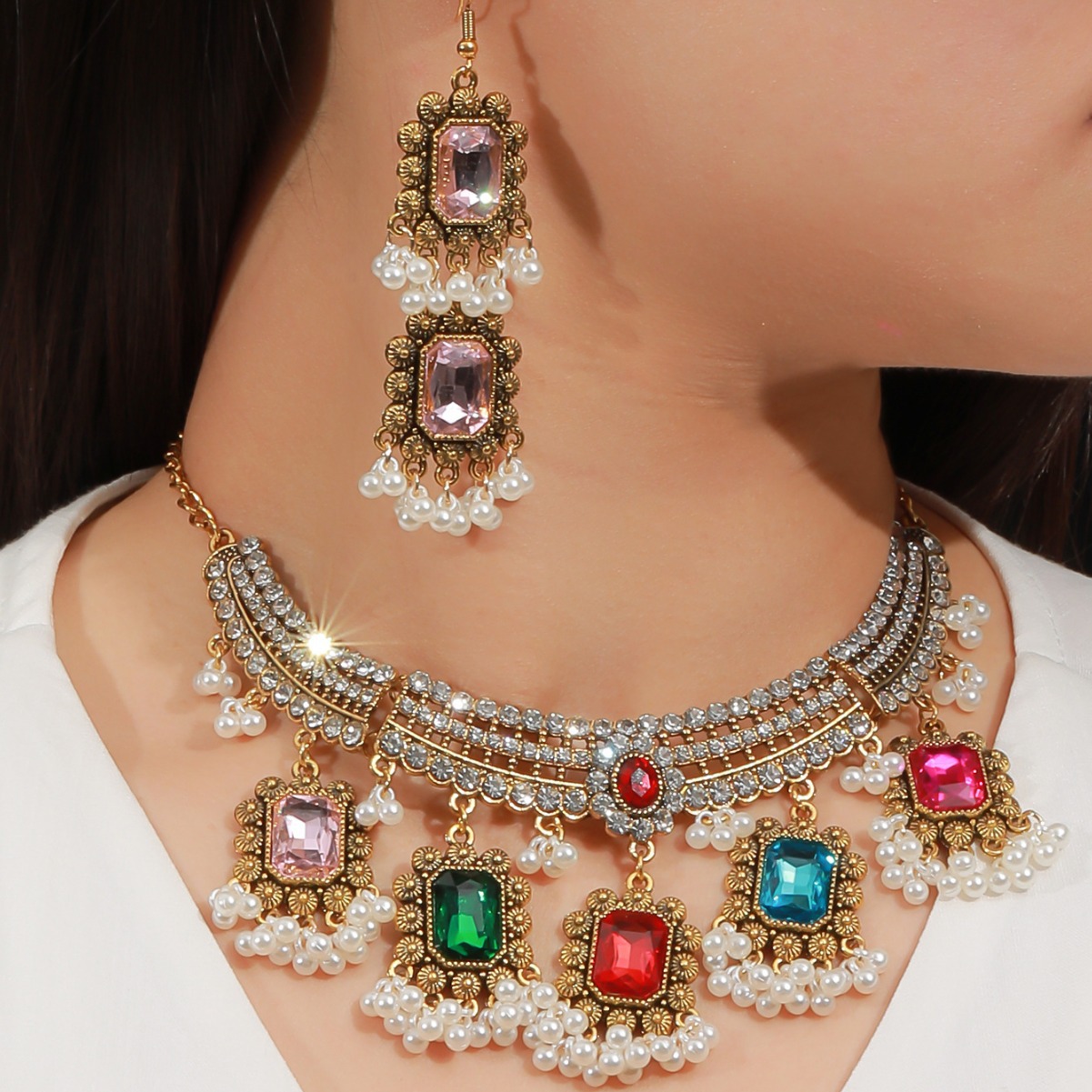 2023欧美复古新款波西米亚民族风珠金属美式项链带耳钉