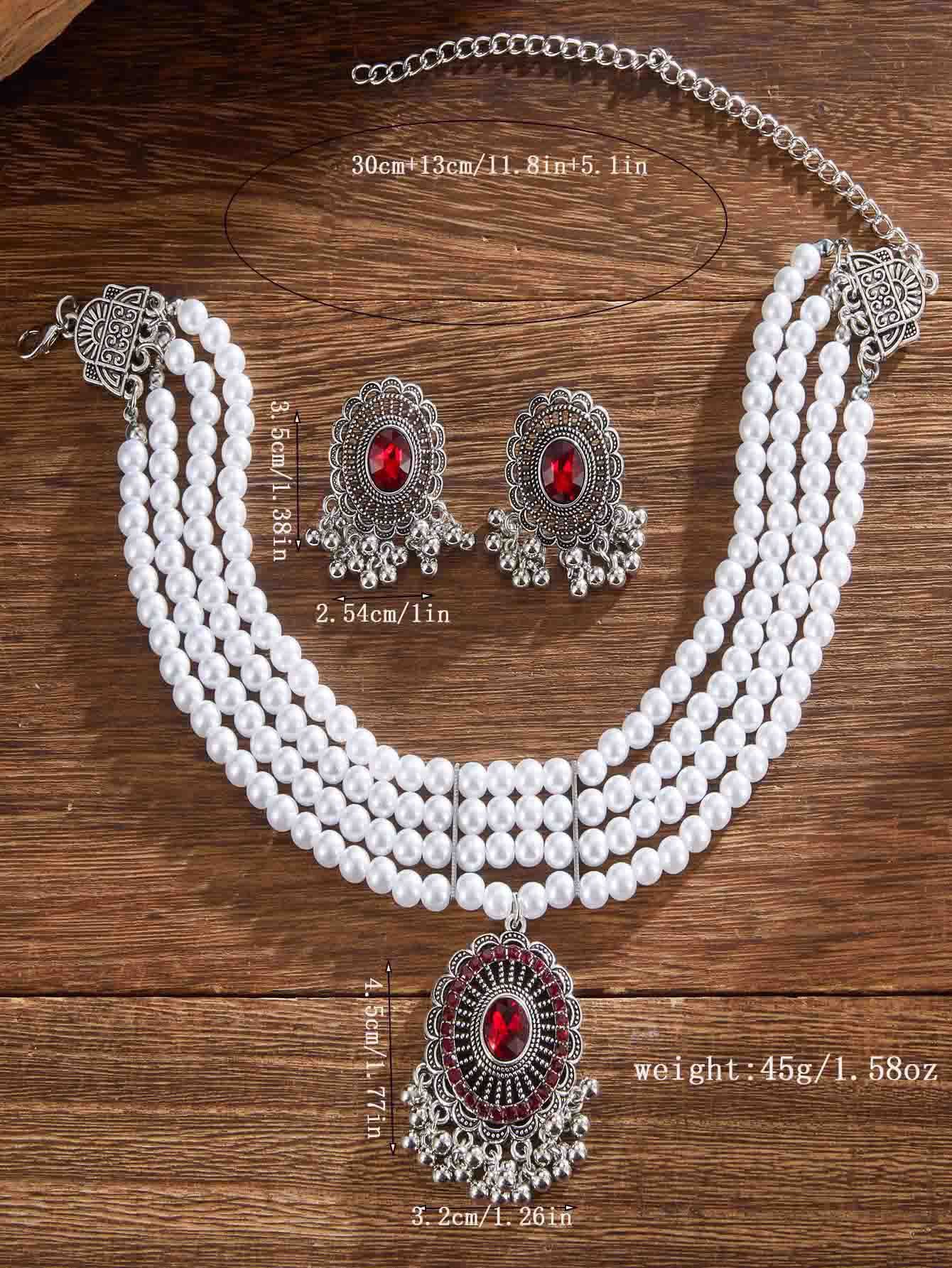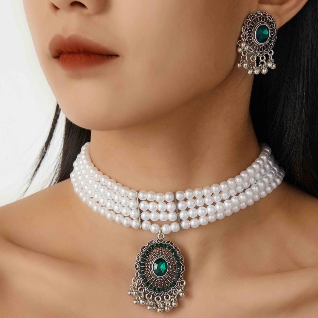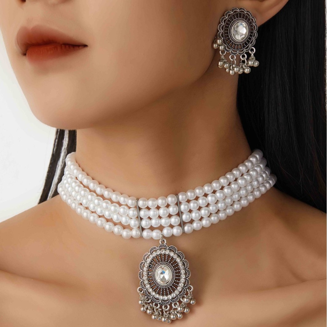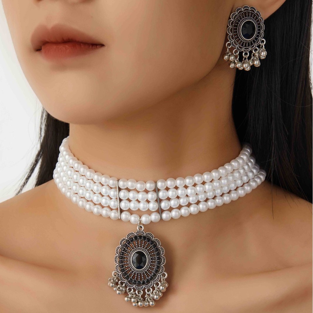 跨境热卖欧美复古民族风多层珍珠椭圆形项链耳环 跨境波西米亚首