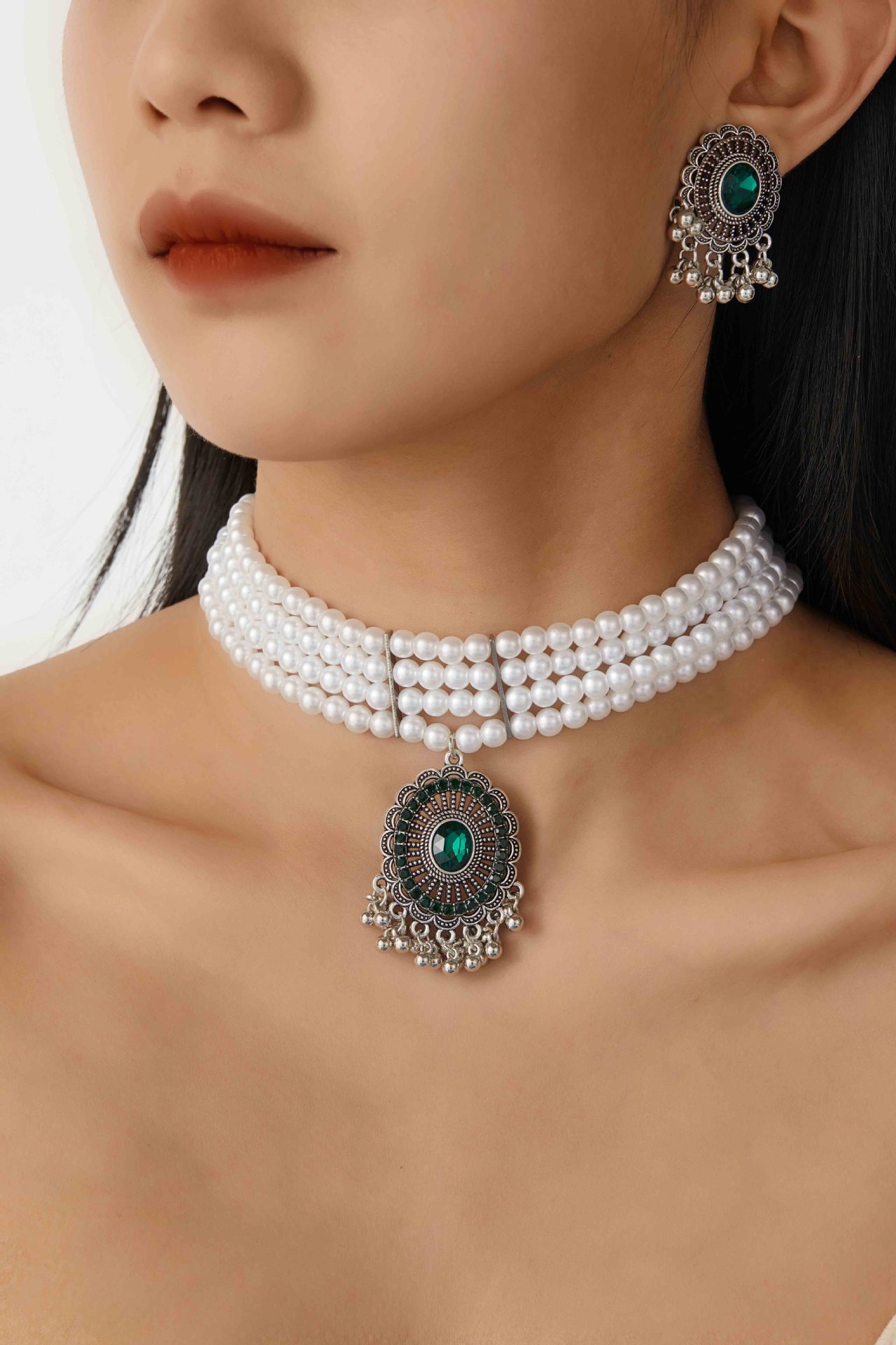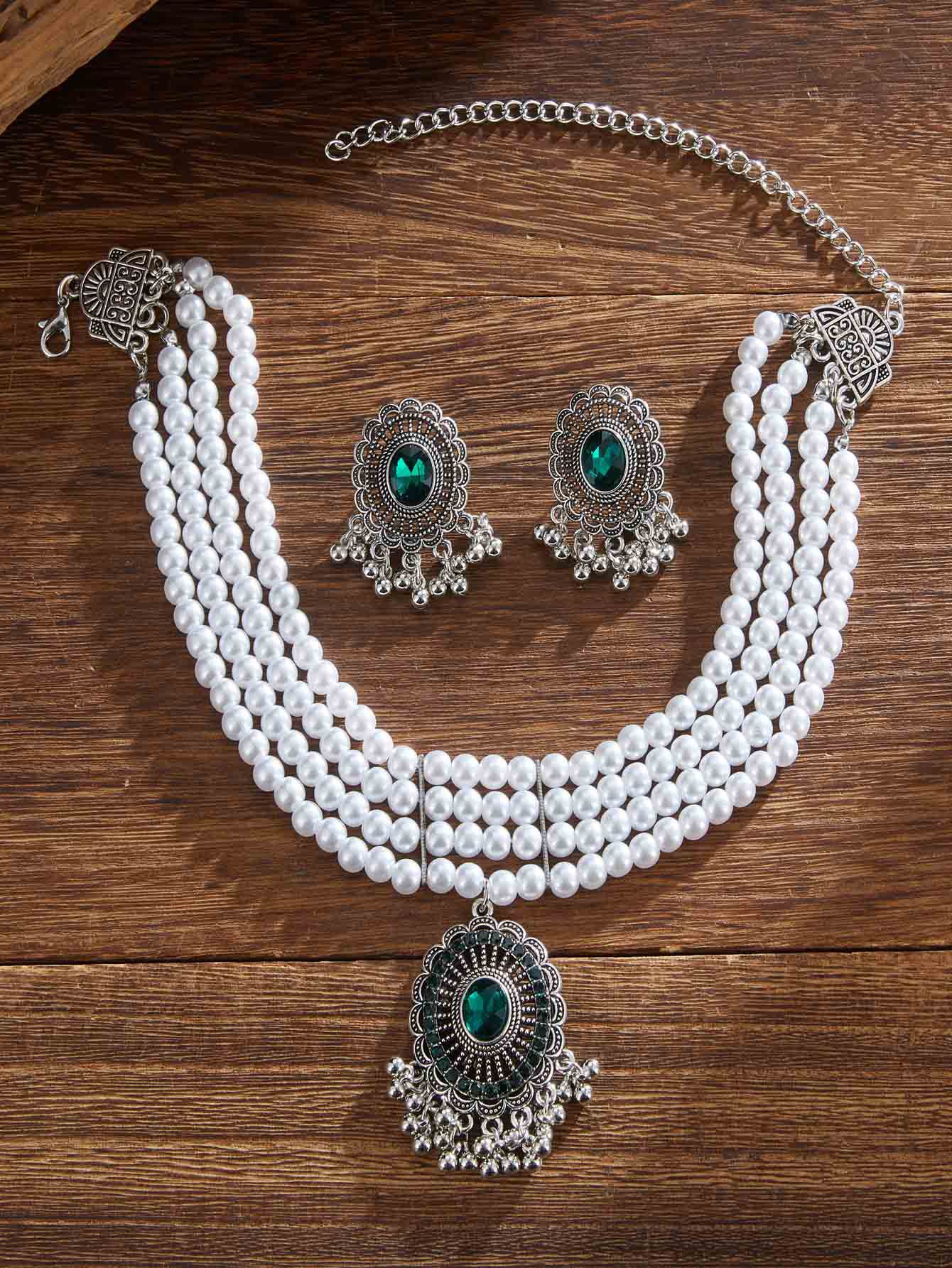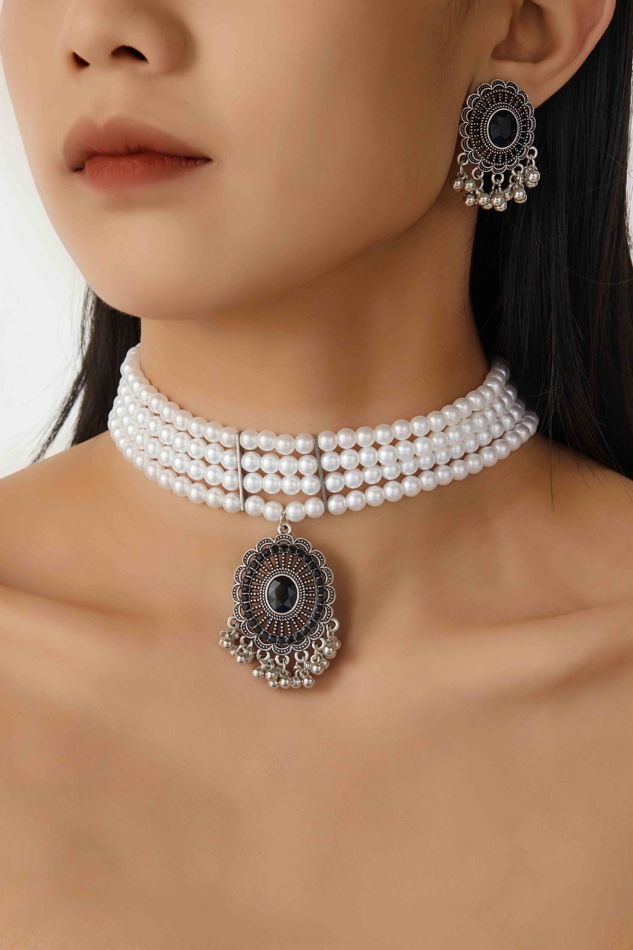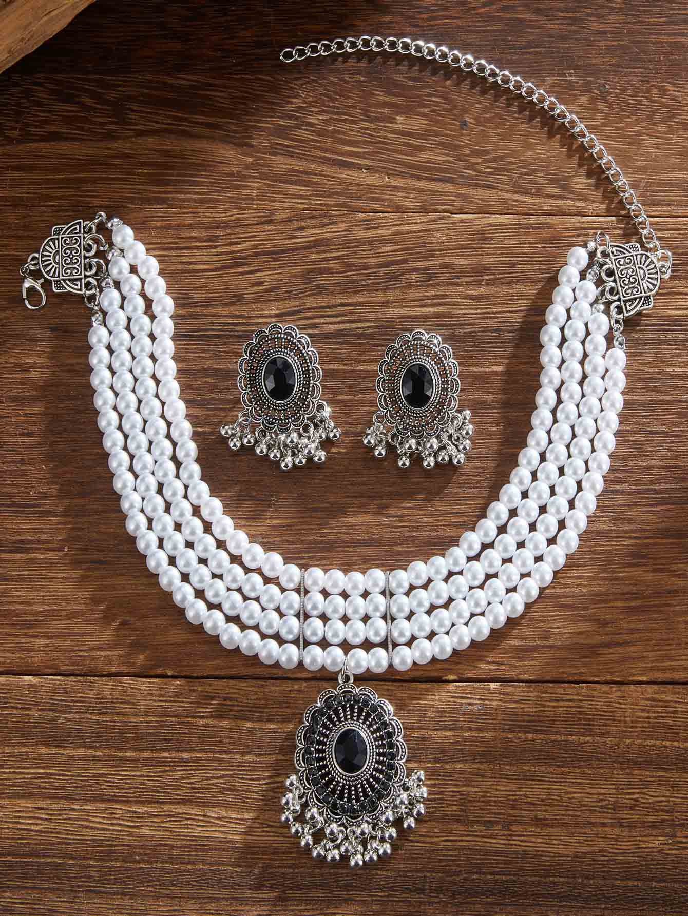 跨境热卖欧美复古民族风多层珍珠椭圆形项链耳环 跨境波西米亚首