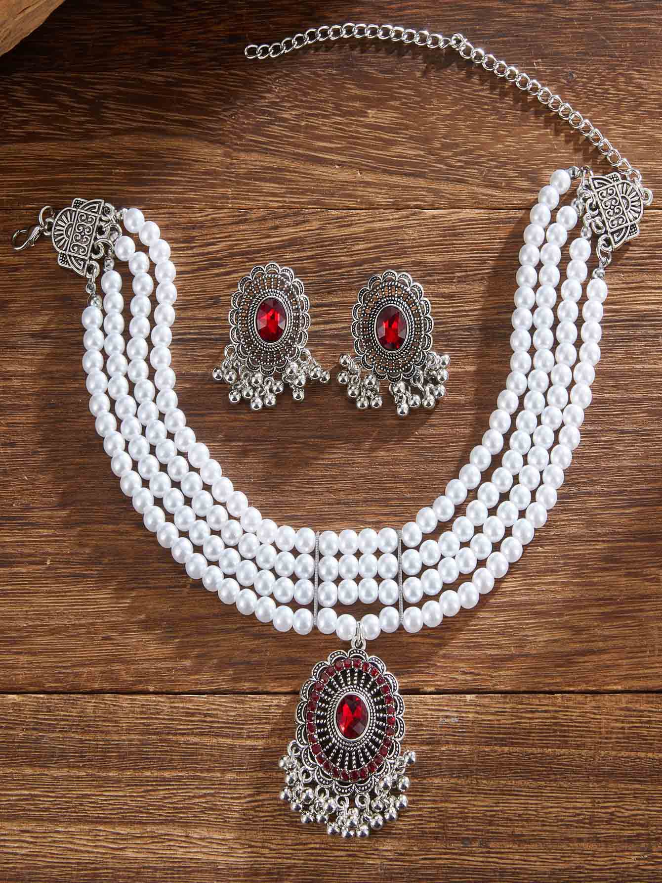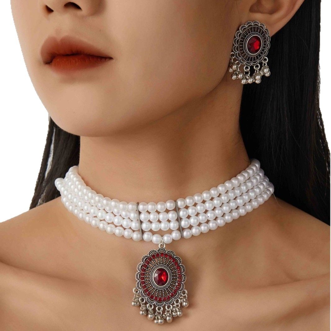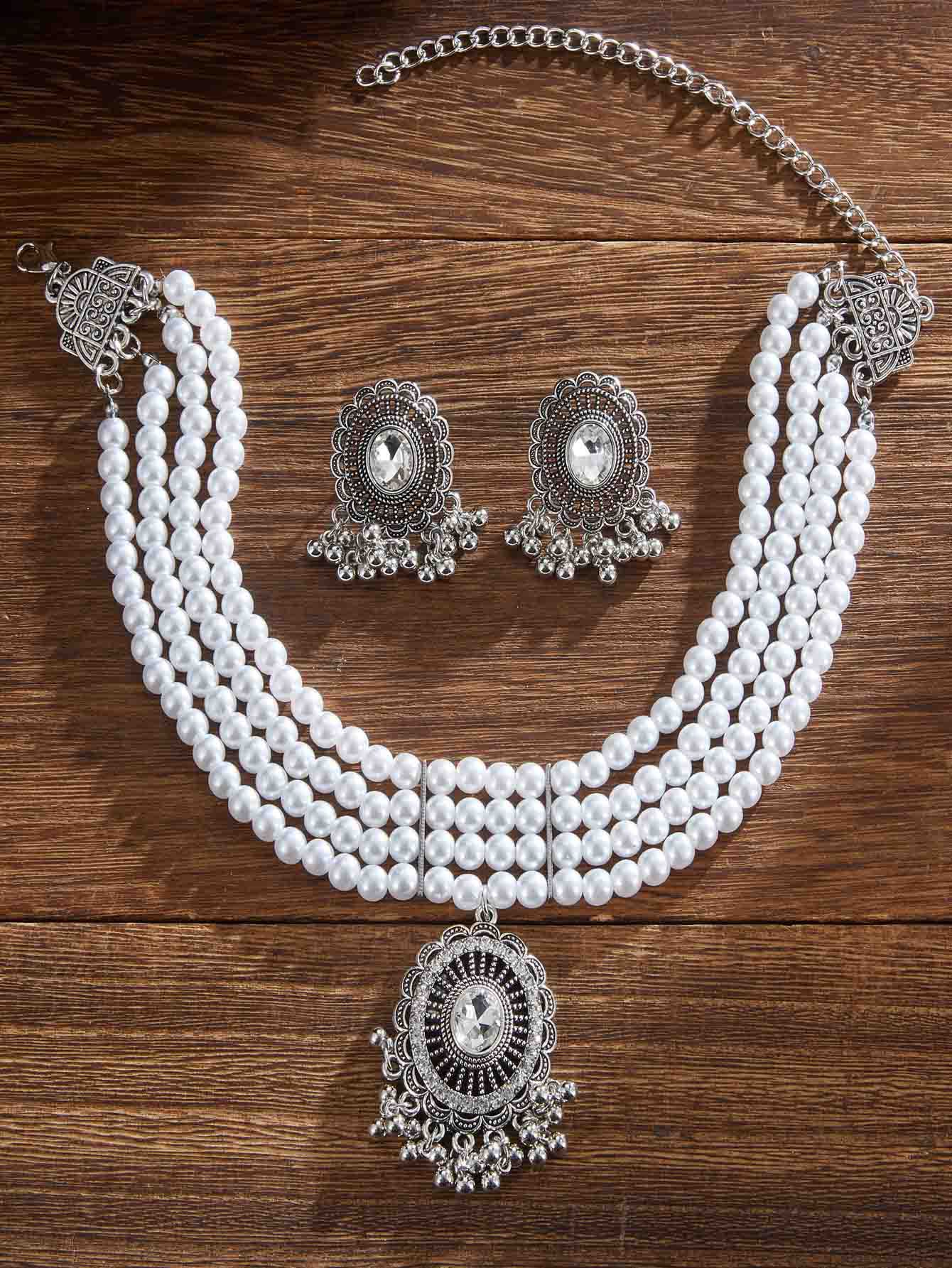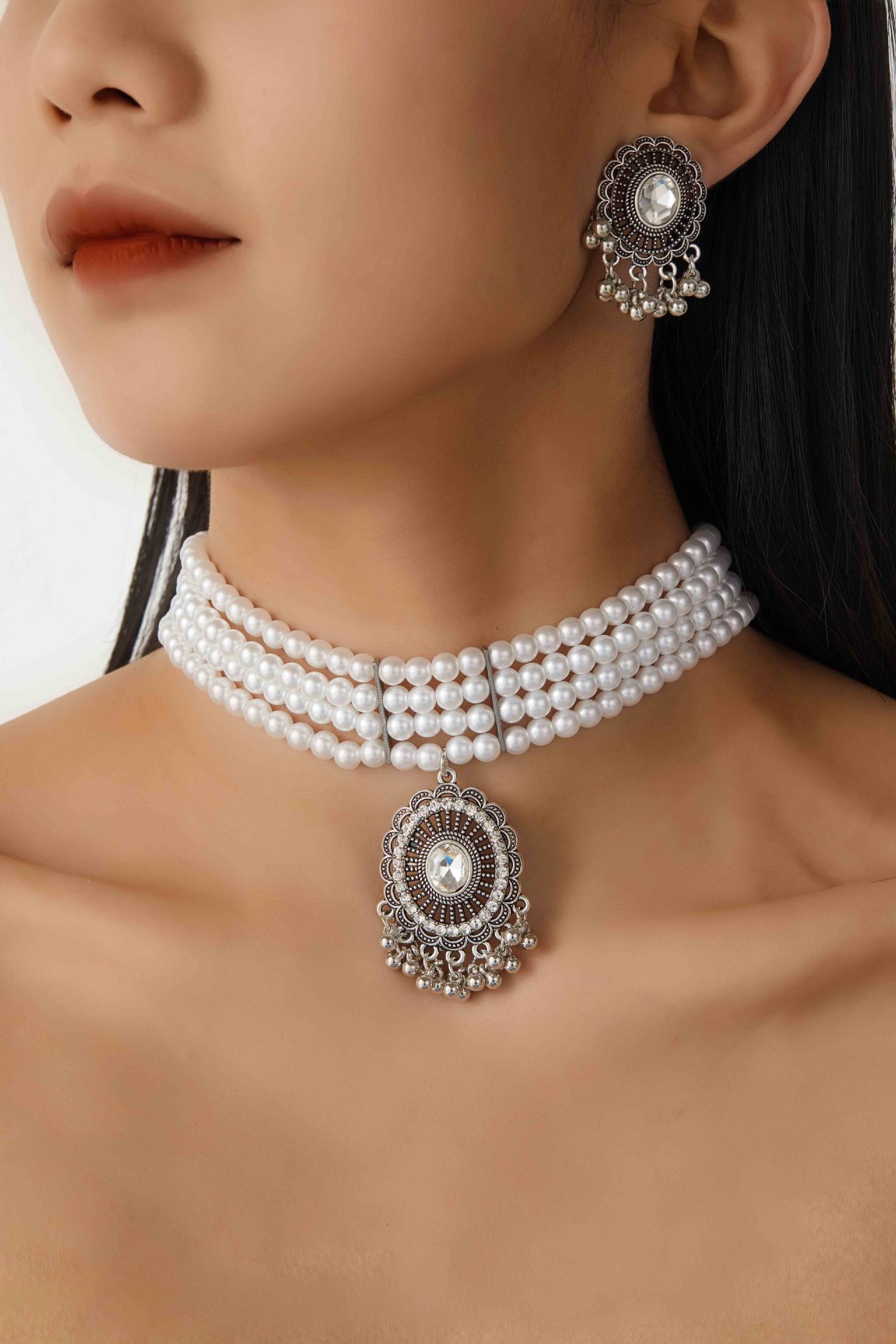跨境热卖欧美复古民族风多层珍珠椭圆形项链耳环 跨境波西米亚首