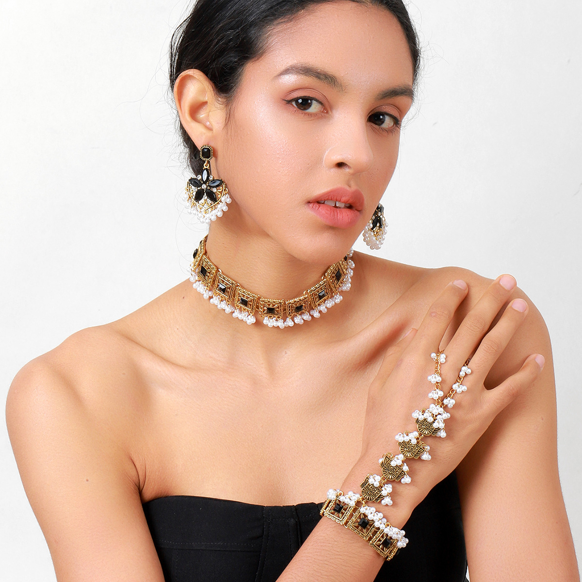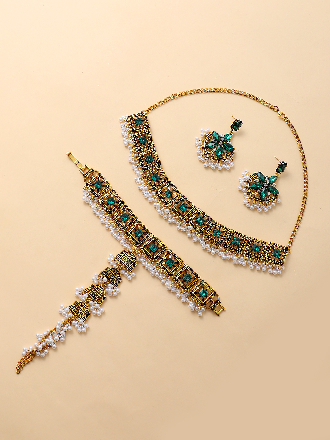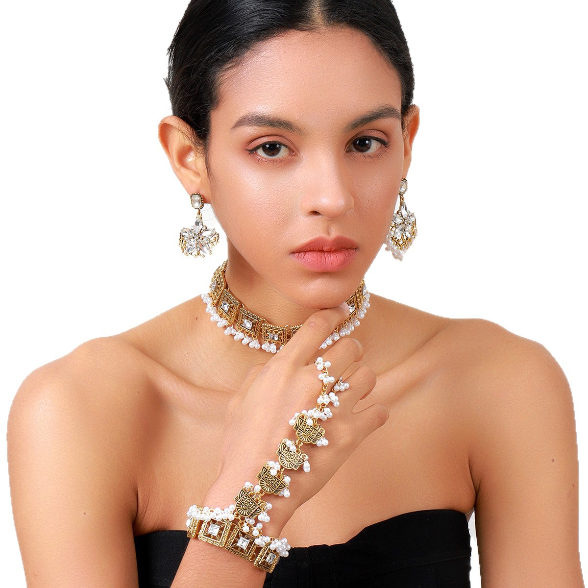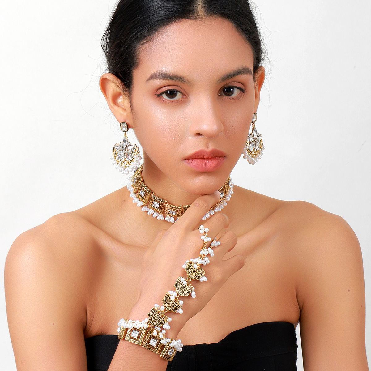 跨境热卖奢华夸张异域风彩色水晶流苏颈链耳环手链女士首饰套装