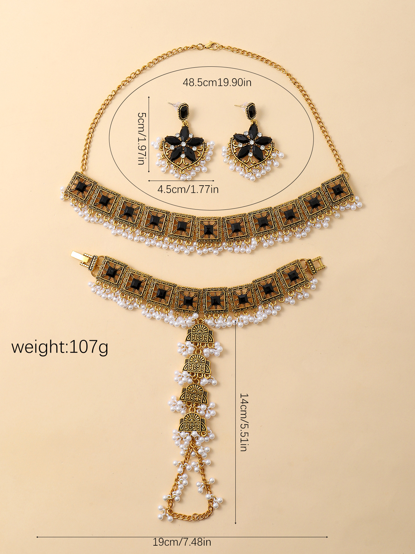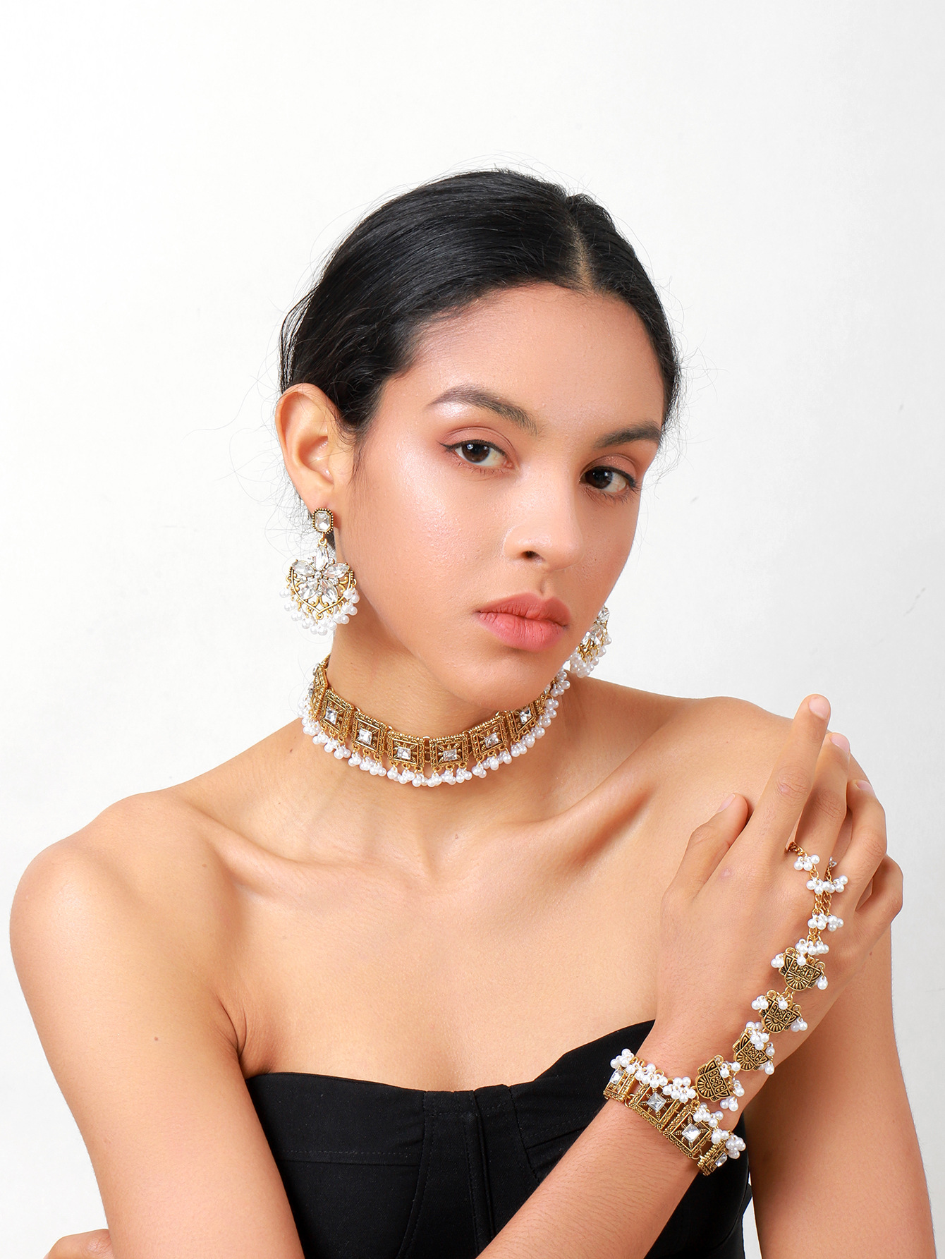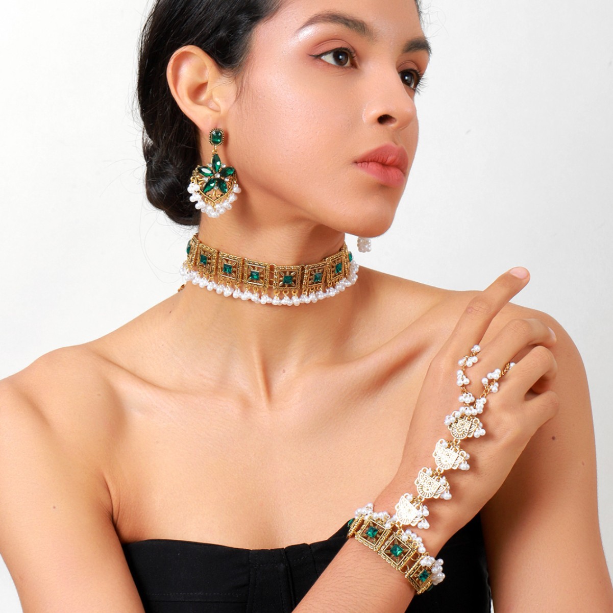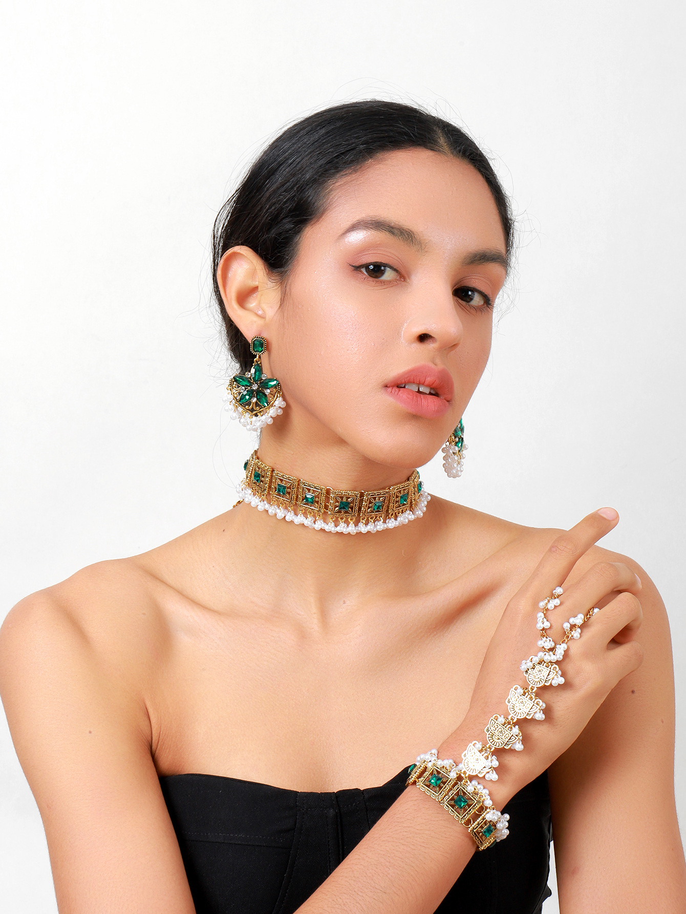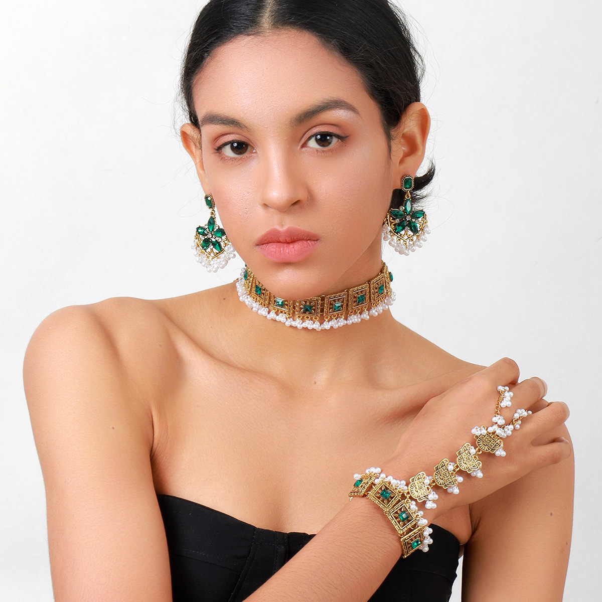 跨境热卖奢华夸张异域风彩色水晶流苏颈链耳环手链女士首饰套装