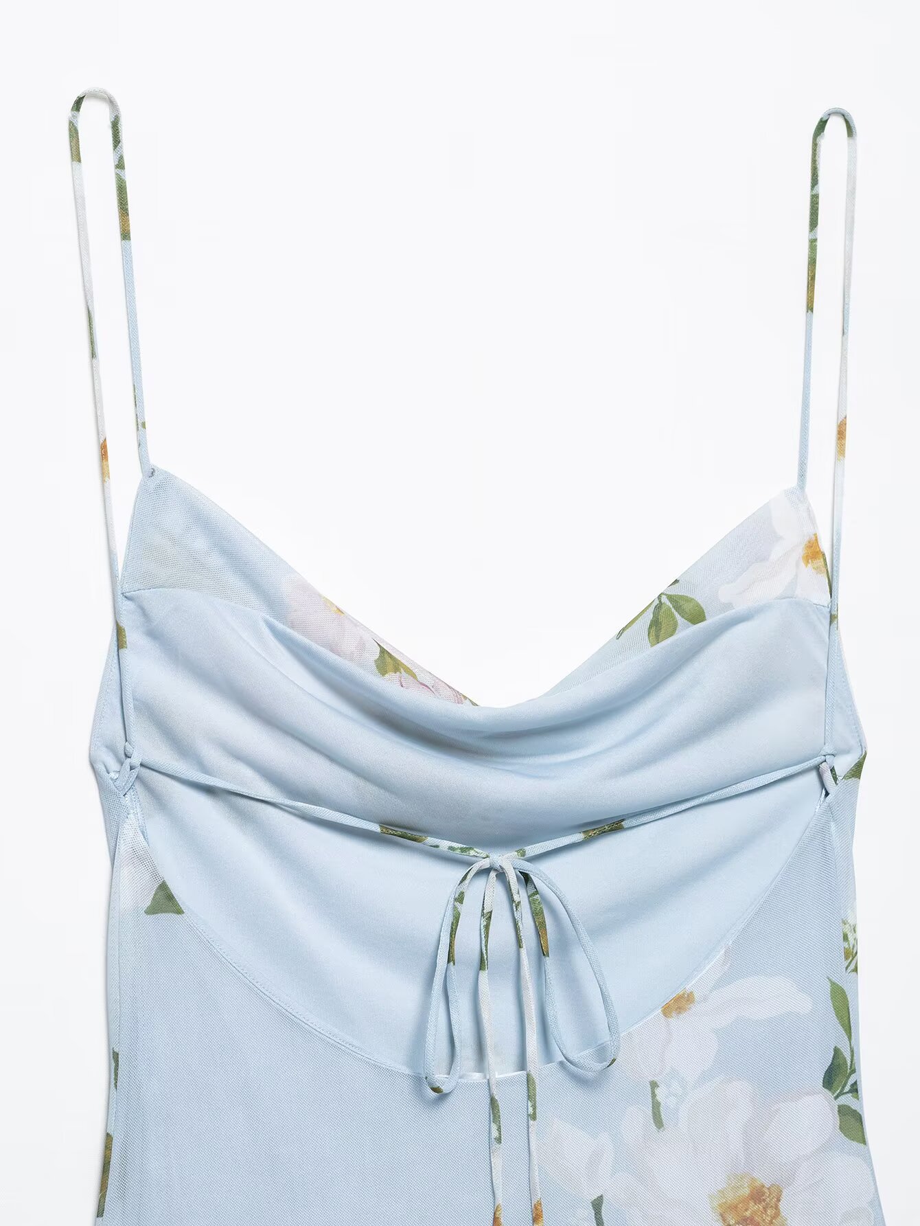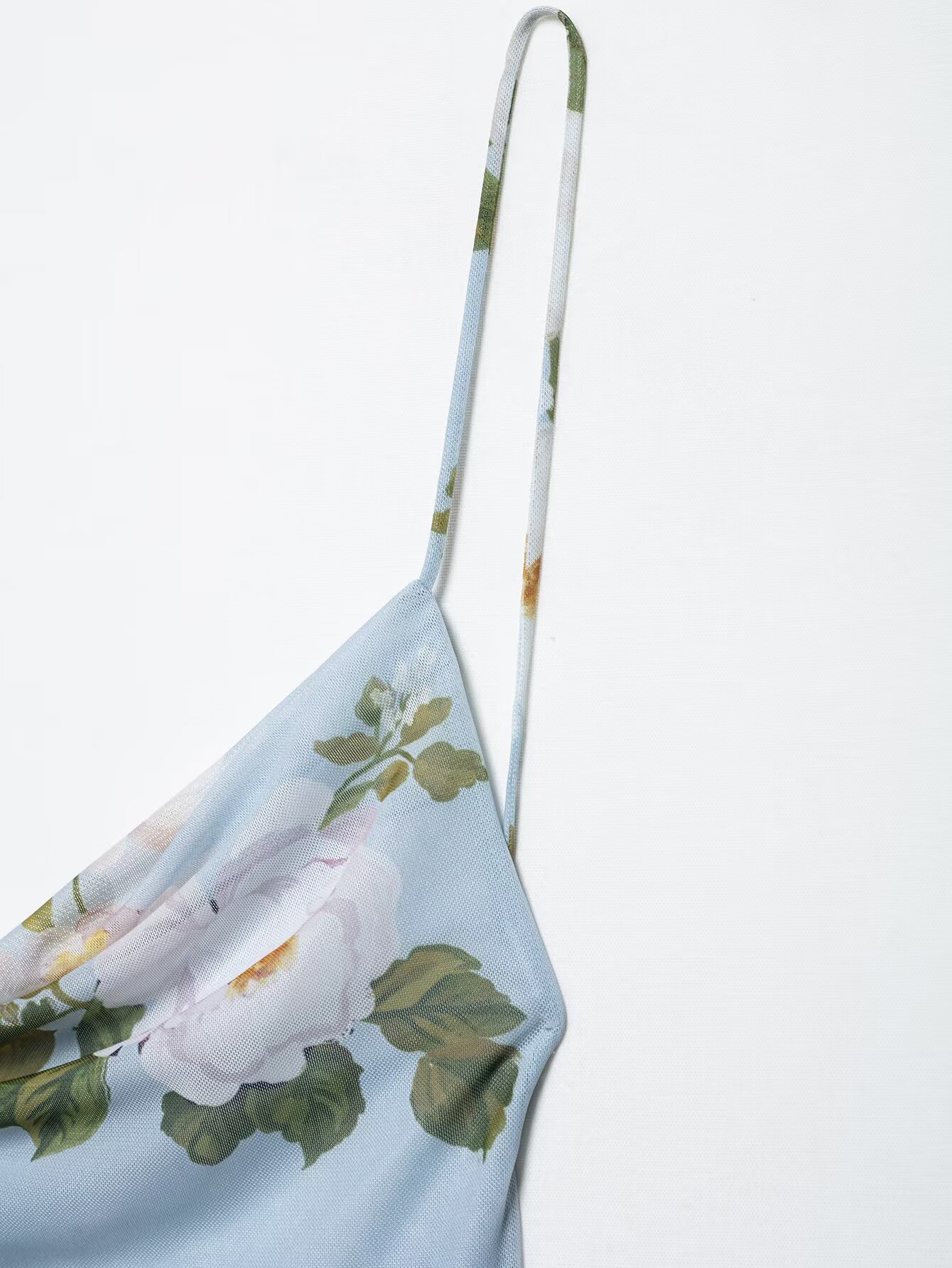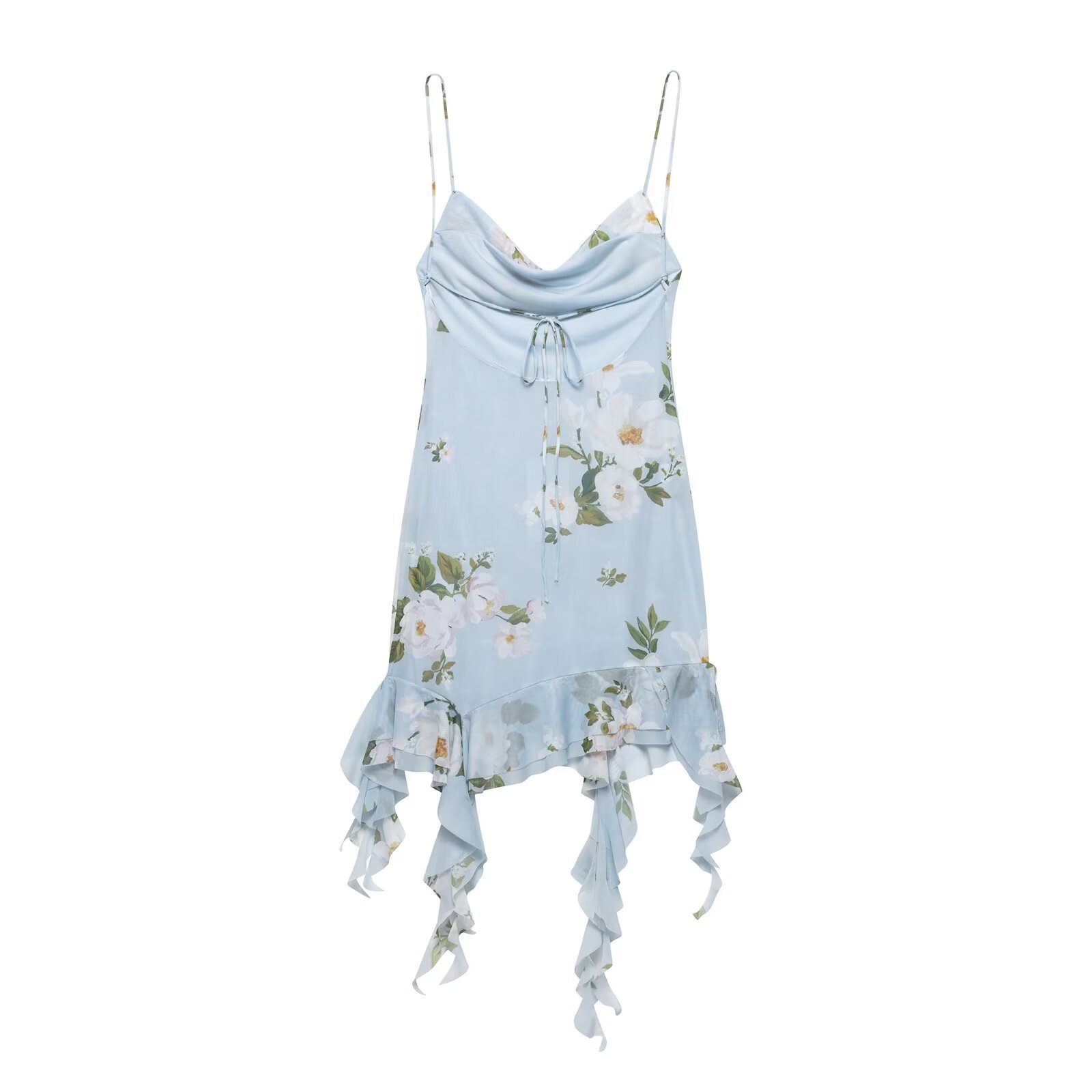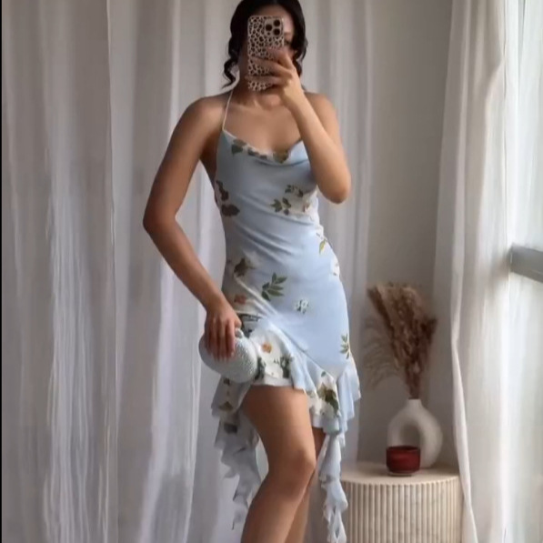 Z跨境2025春季新款女装修身印花绢网垂褶领吊带短连衣裙女5039122