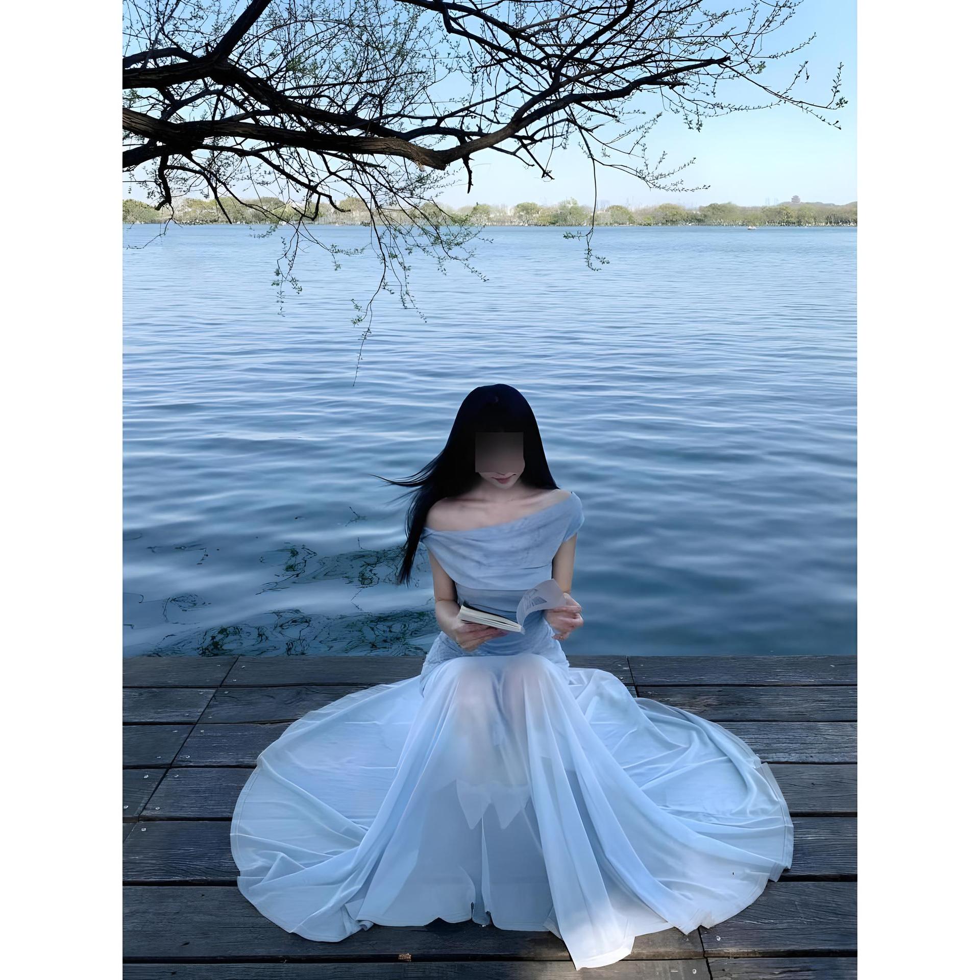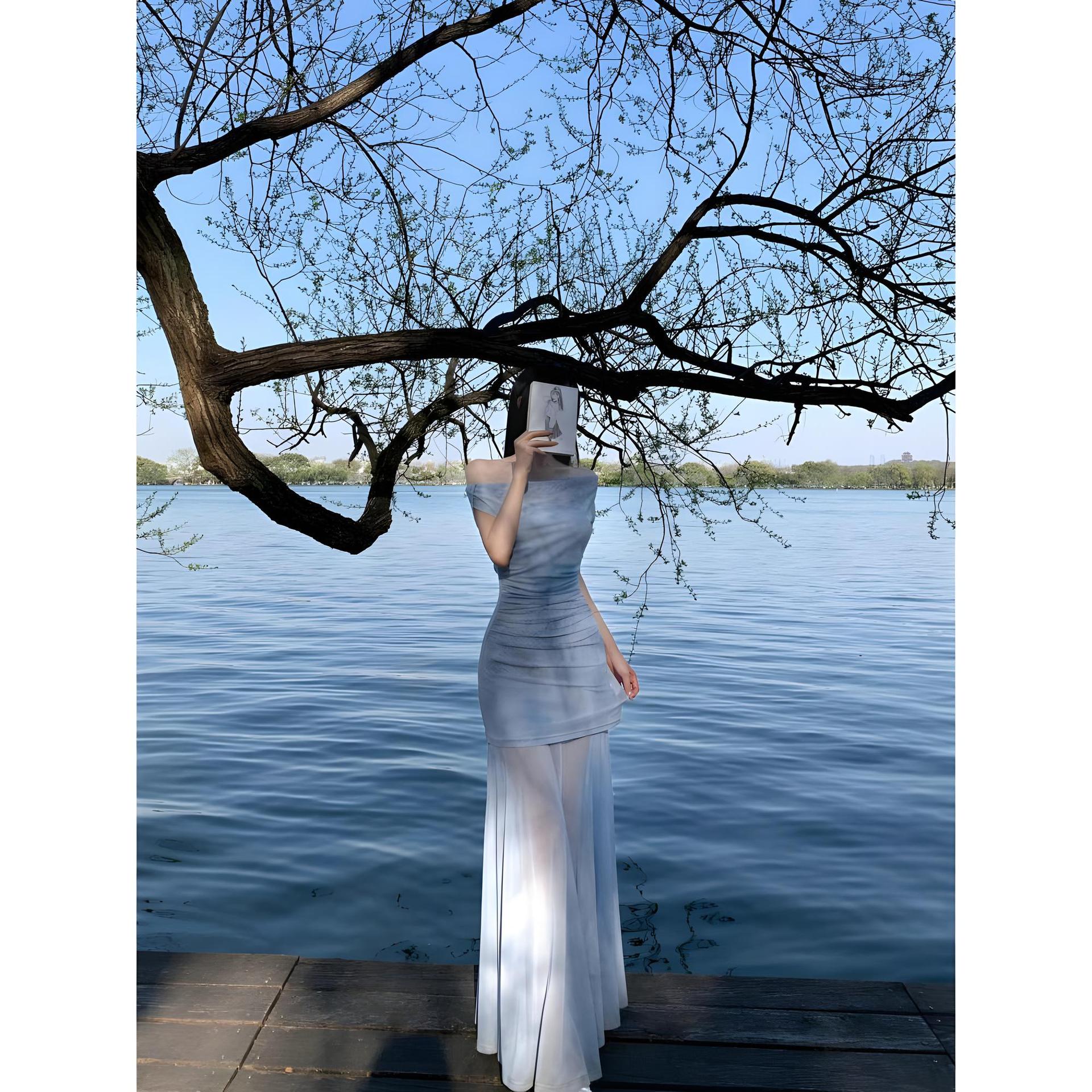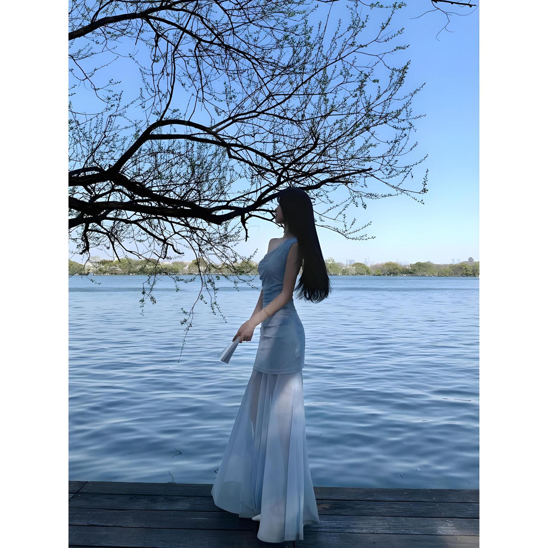 初夏季穿搭海边度假蓝色碎花吊带连衣裙子女新款休闲法式气质长裙