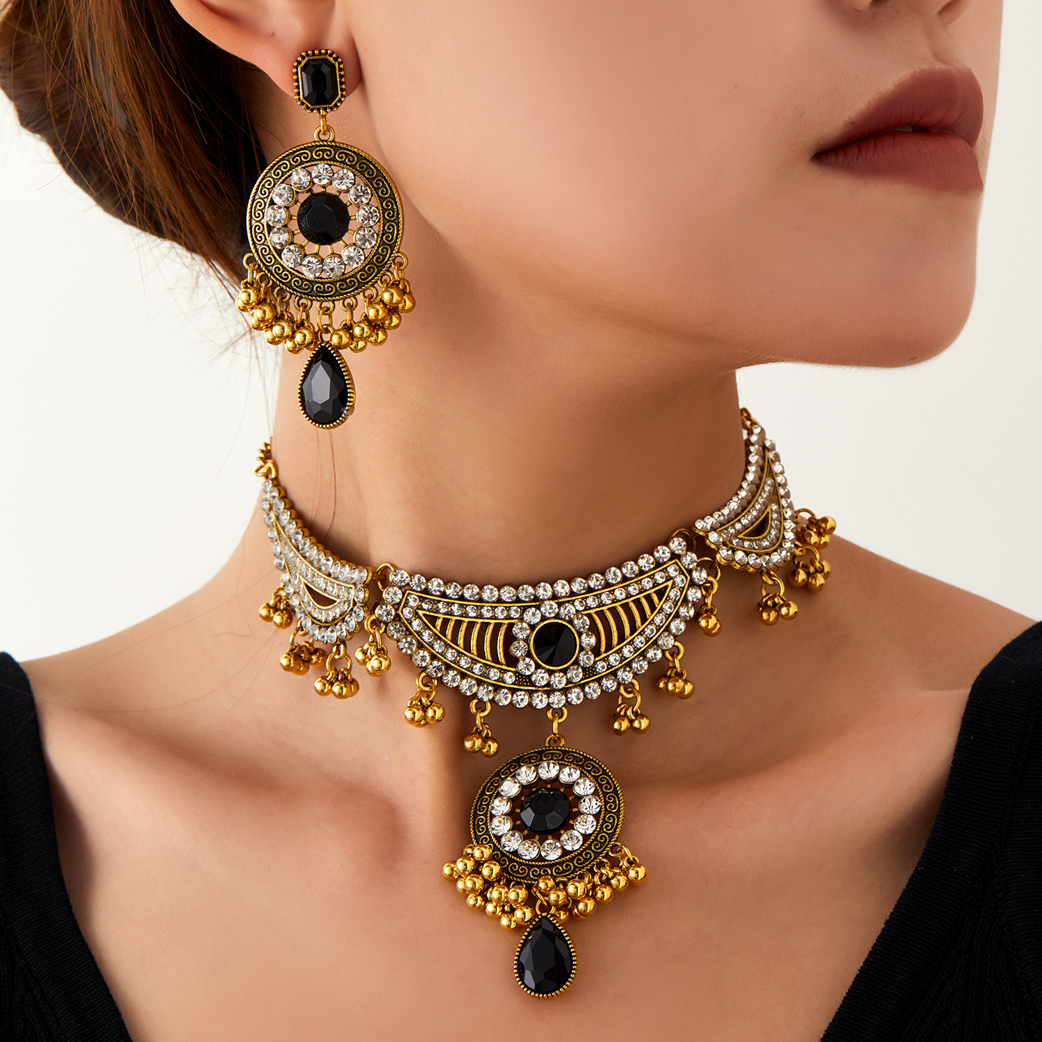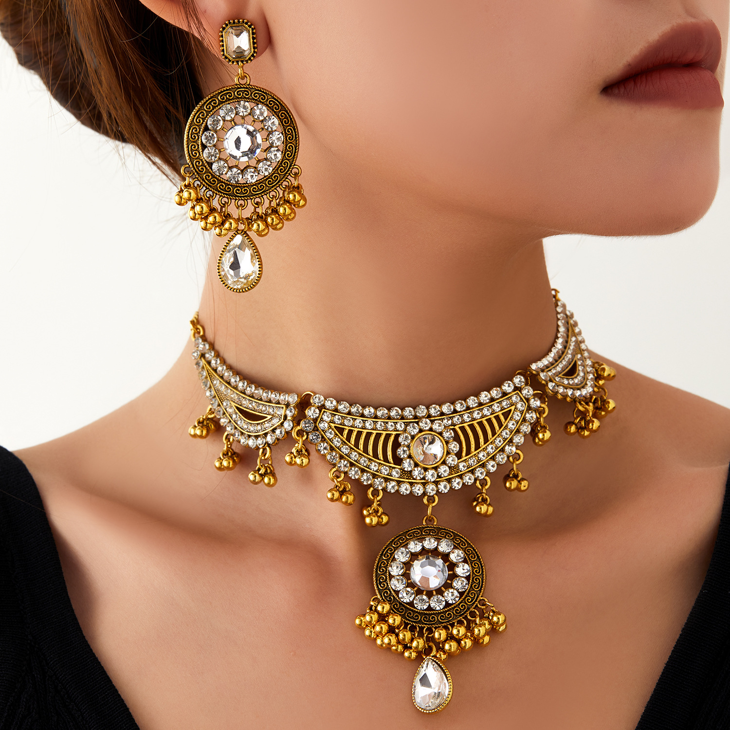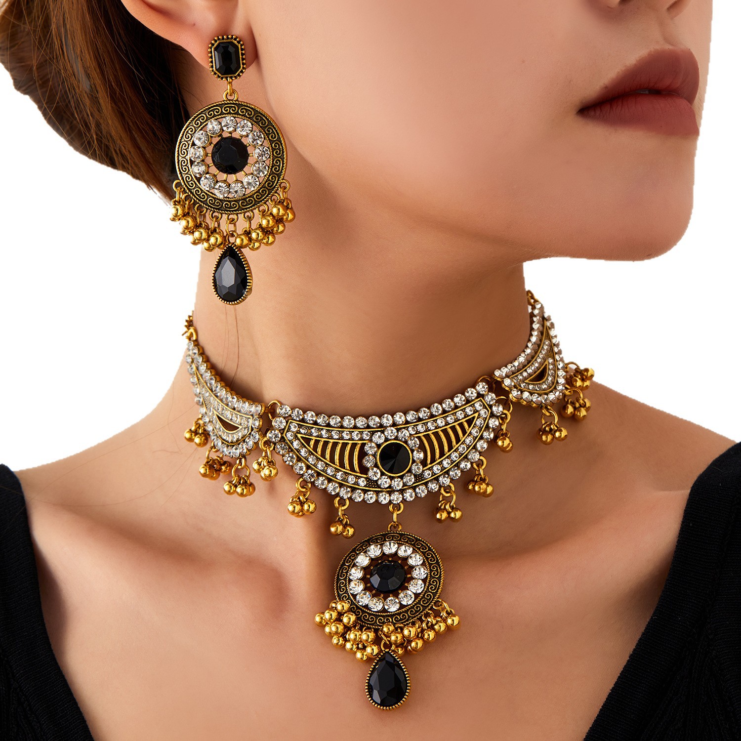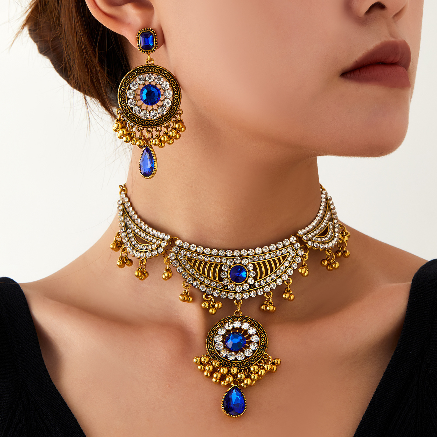 跨境新款欧美流行饰品 复古民族风镶钻颈链耳环 宫廷风项链两件套