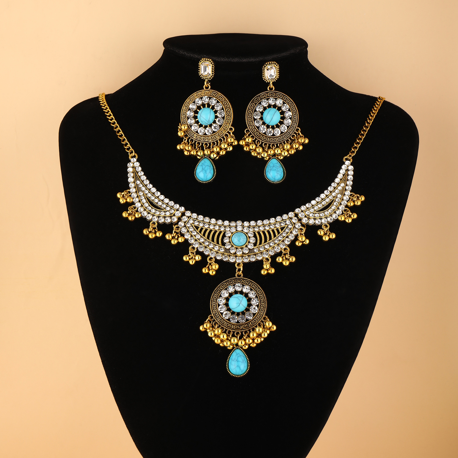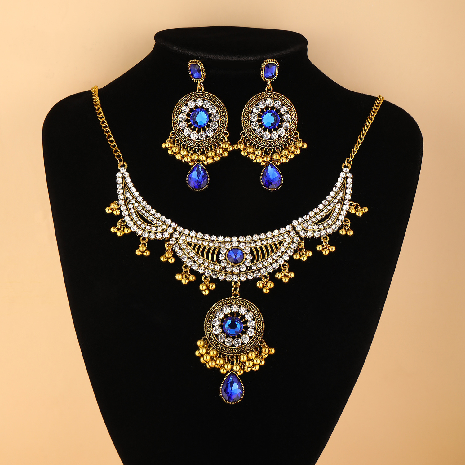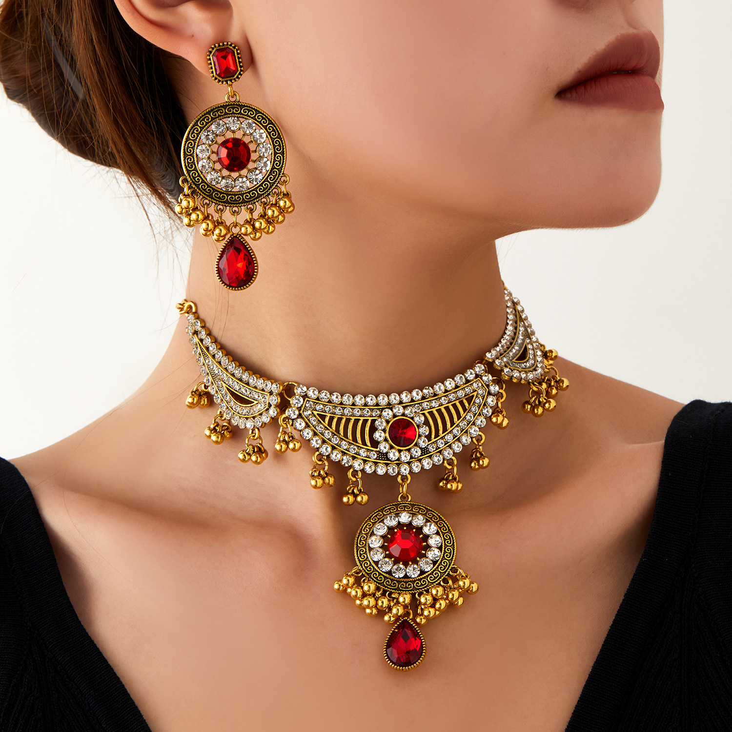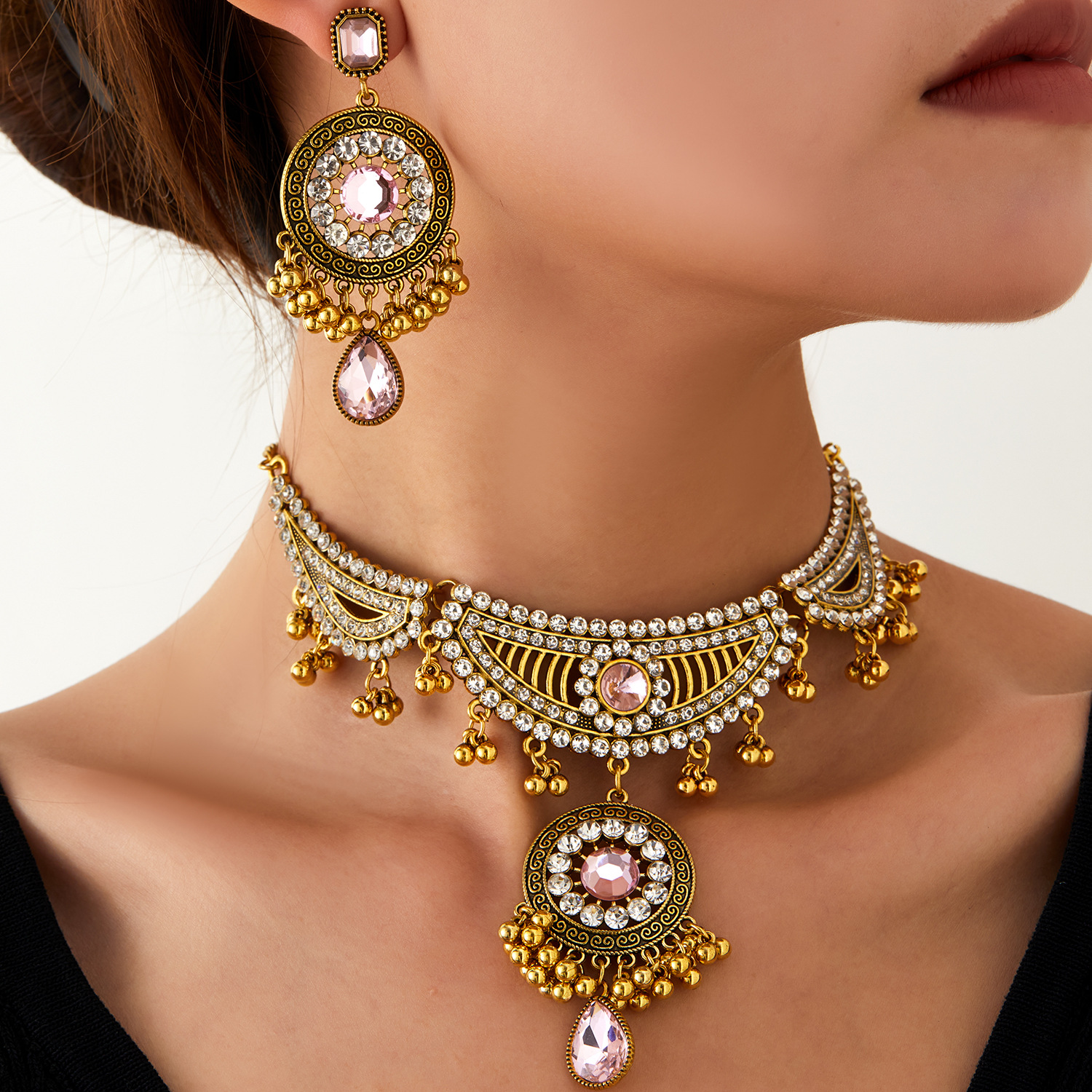跨境新款欧美流行饰品 复古民族风镶钻颈链耳环 宫廷风项链两件套