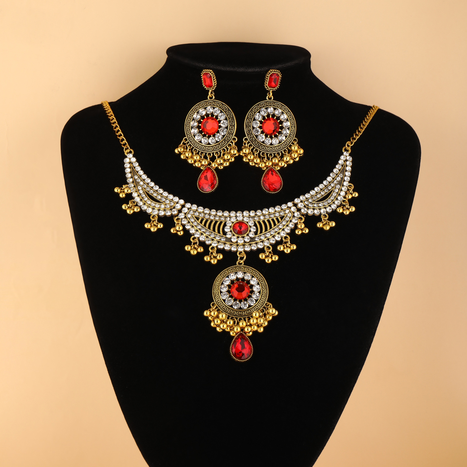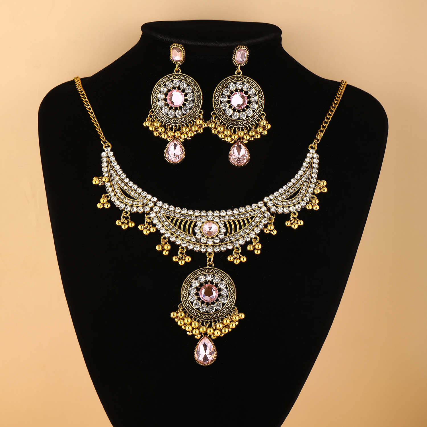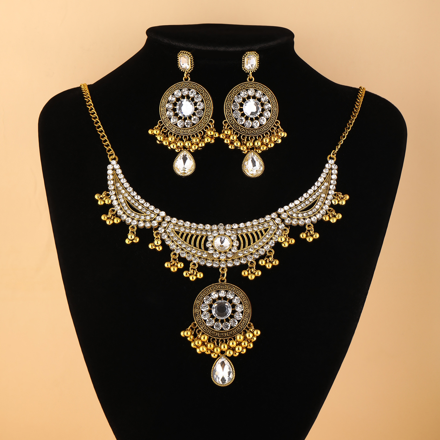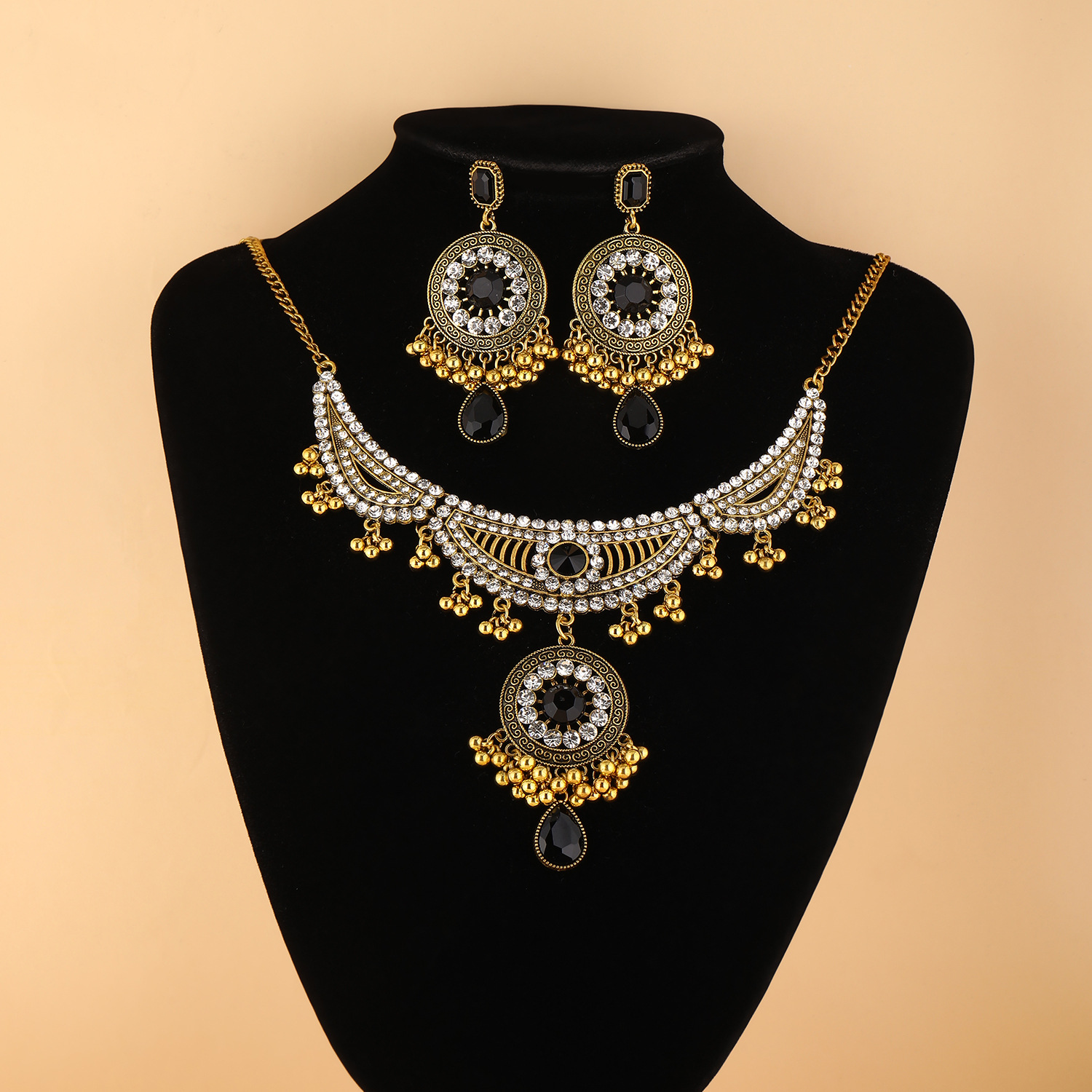 跨境新款欧美流行饰品 复古民族风镶钻颈链耳环 宫廷风项链两件套