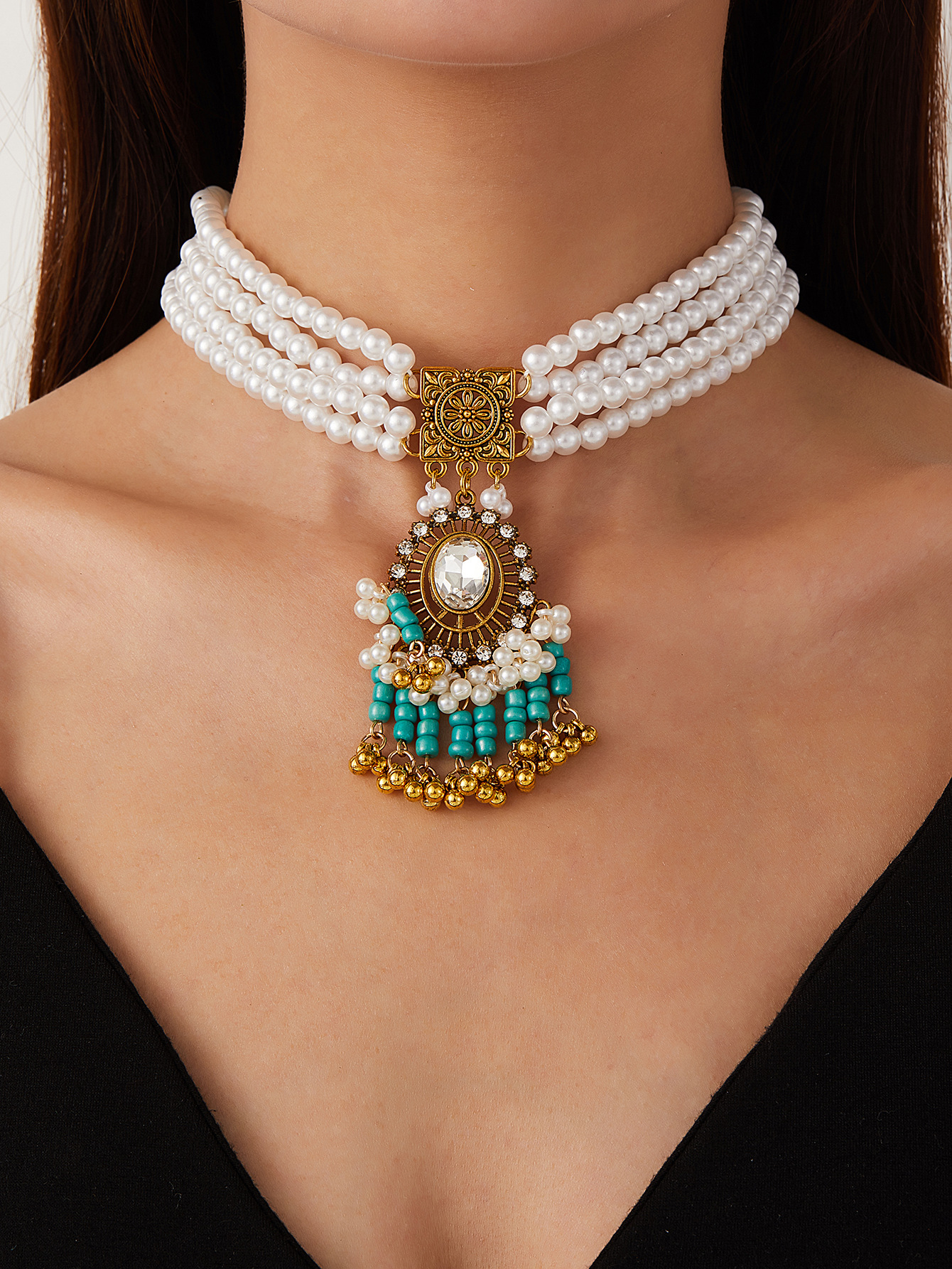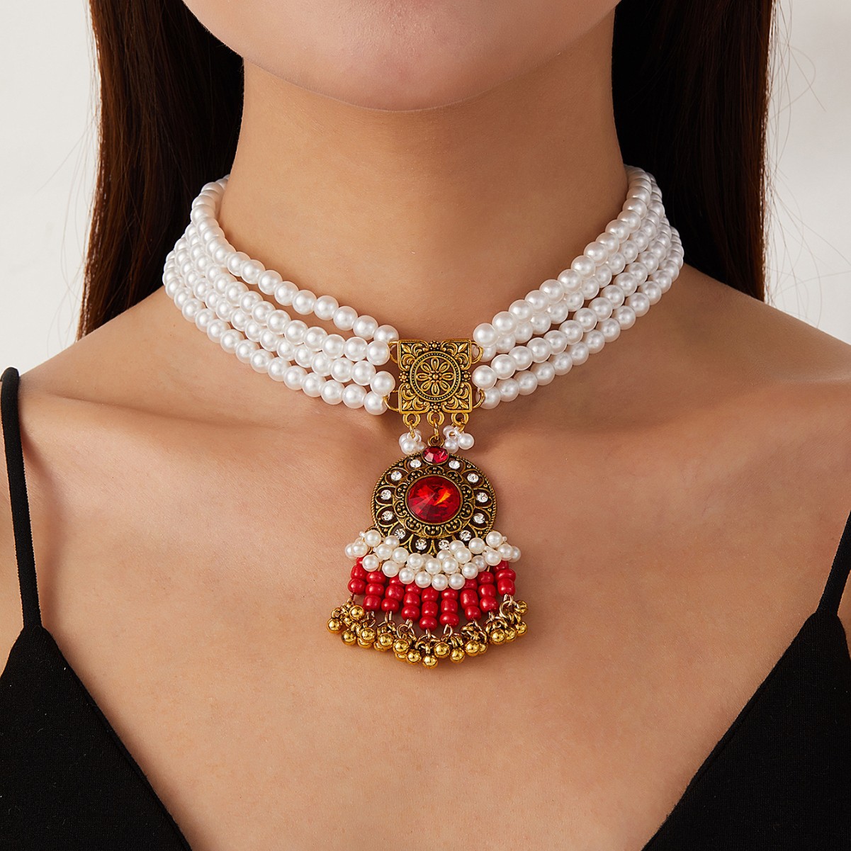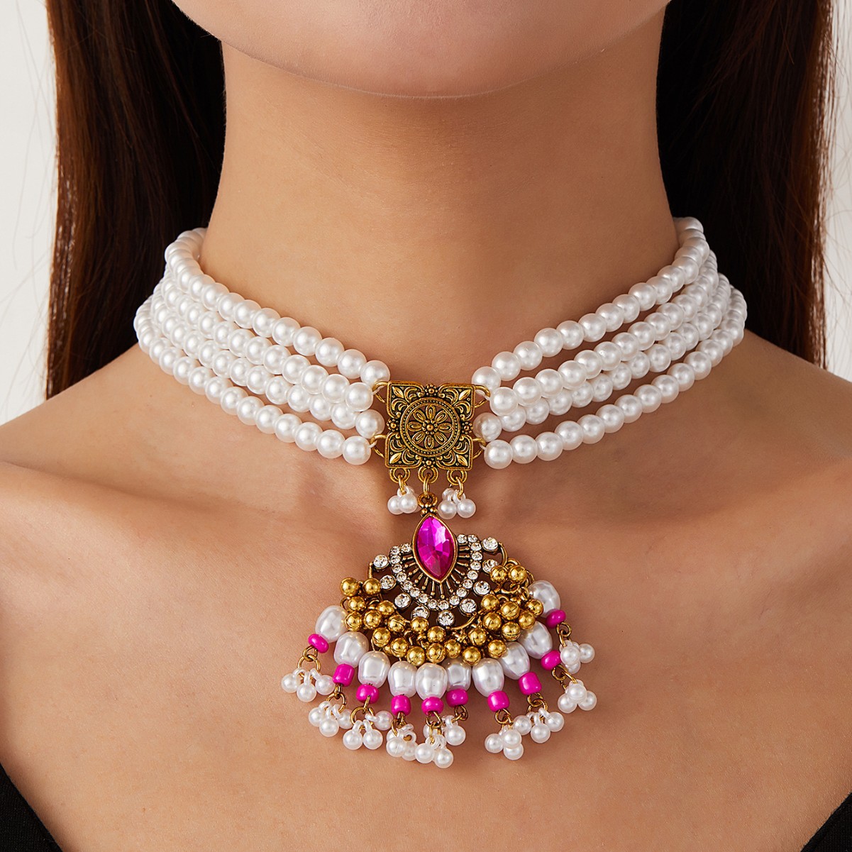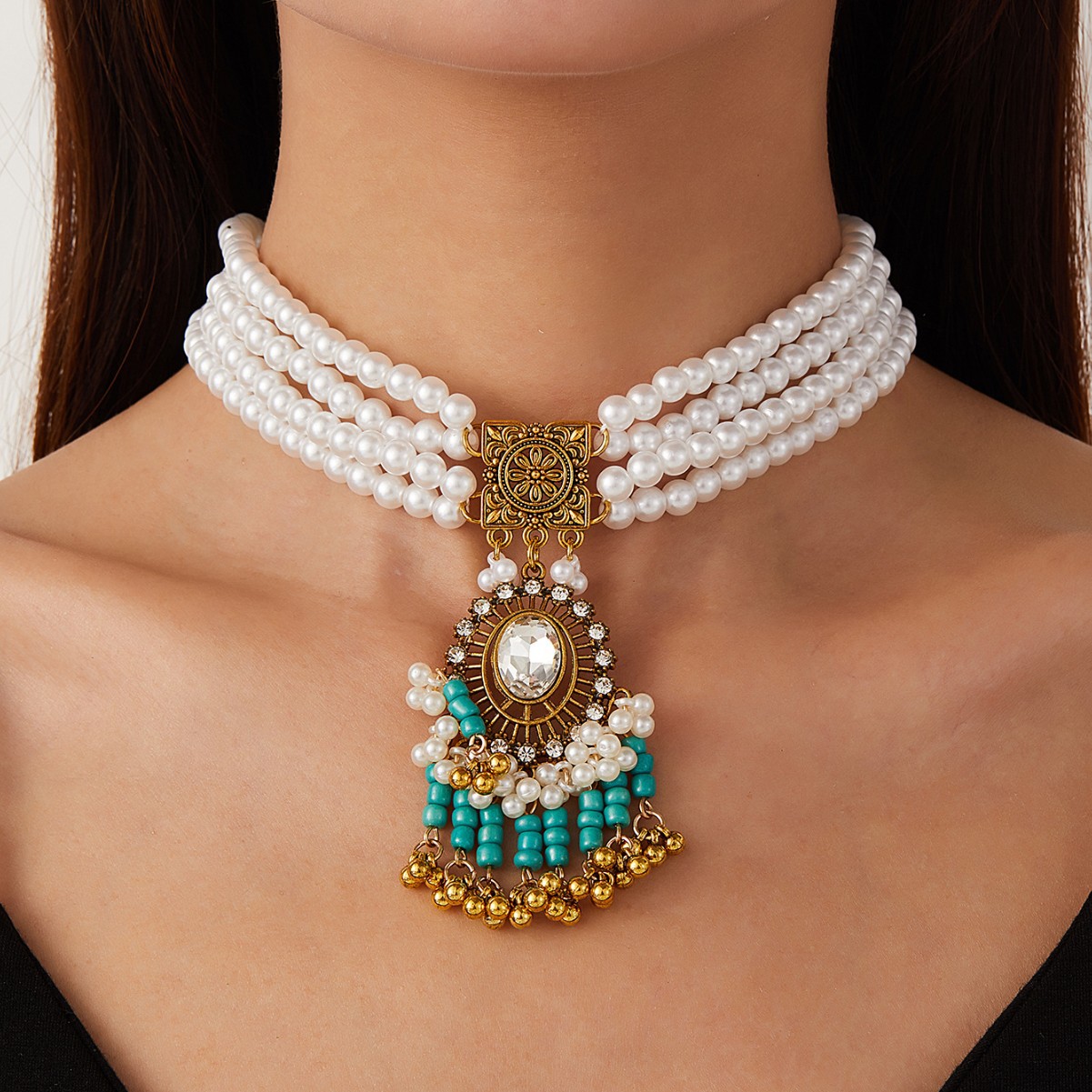 欧美跨境复古民族风锁骨链仿珍珠多层项链珠串项链