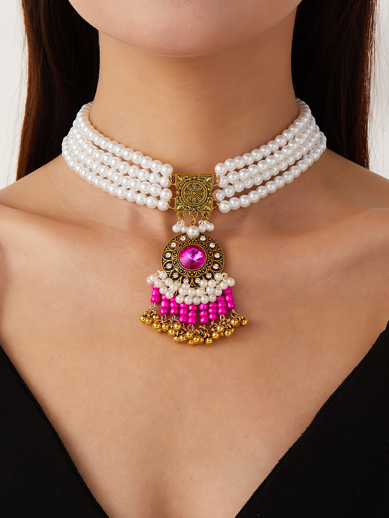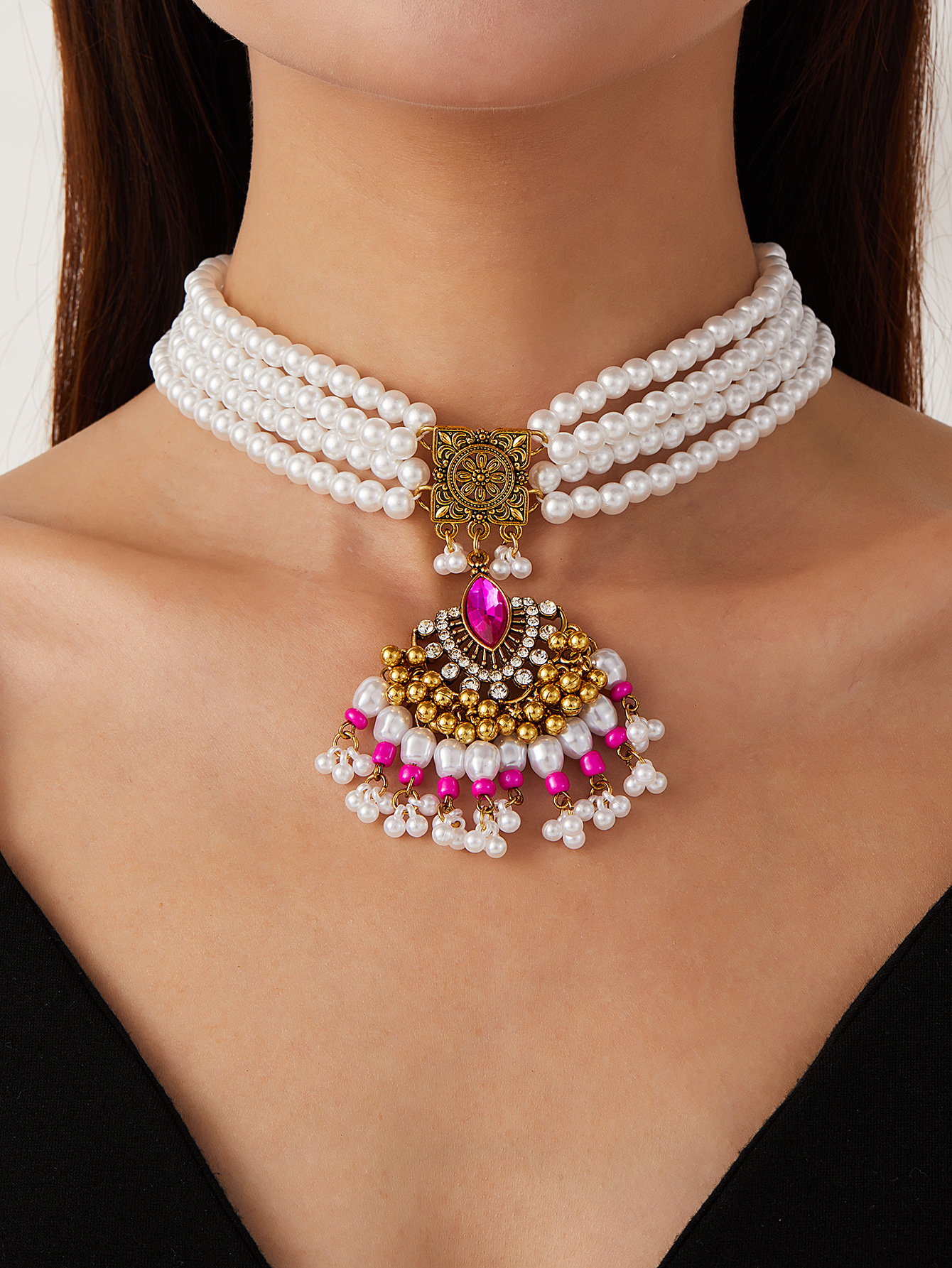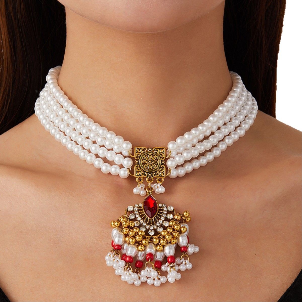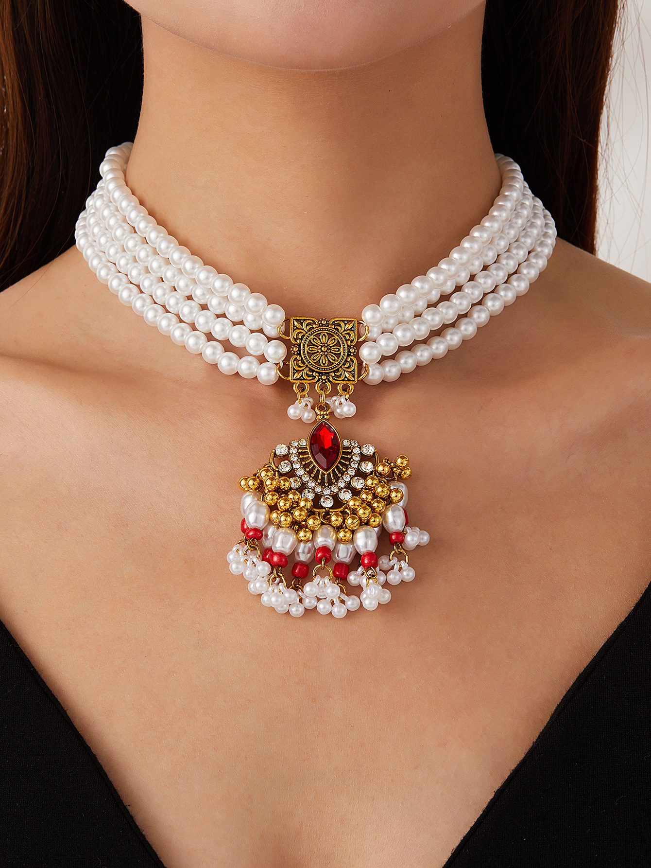 欧美跨境复古民族风锁骨链仿珍珠多层项链珠串项链