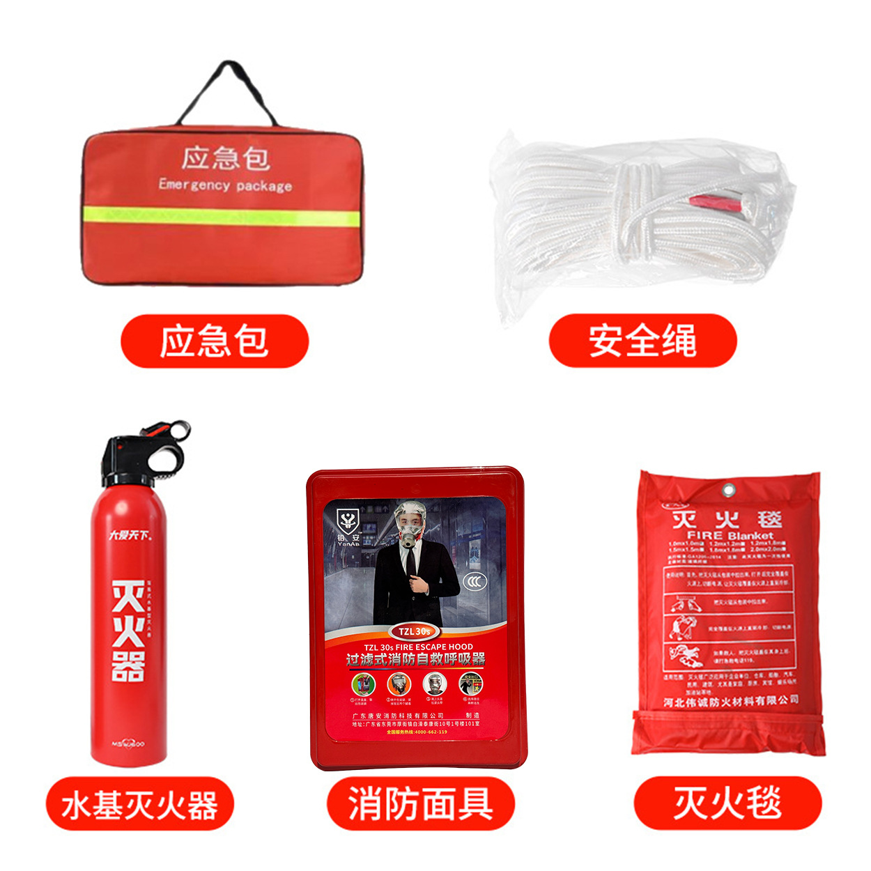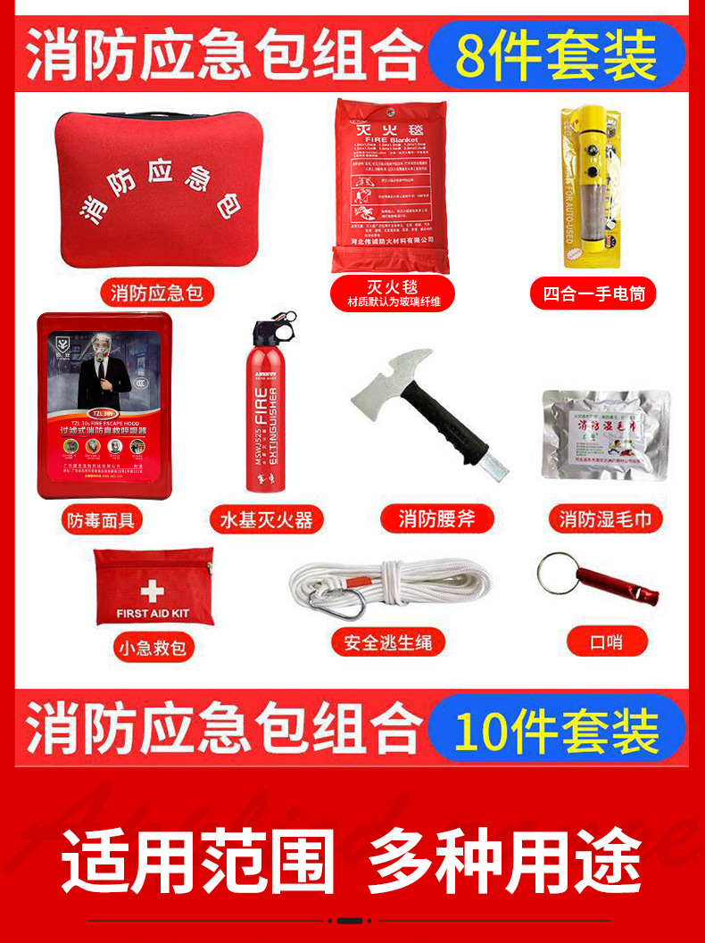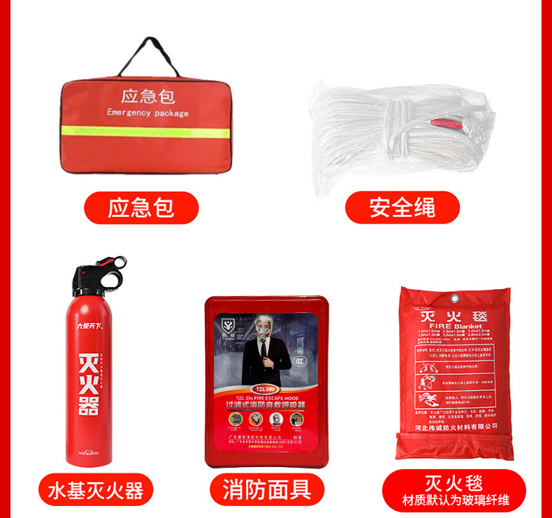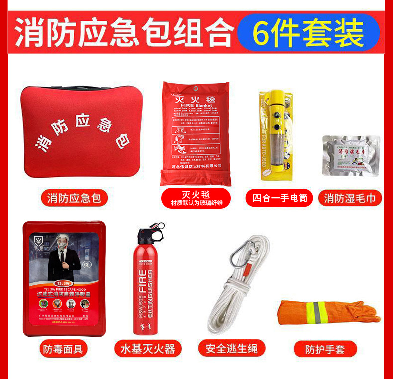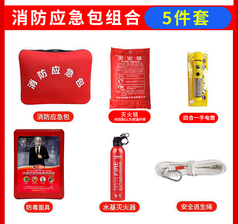 | 应急包五件套(橙色应急包+安全绳+水基灭火器+消防面具+灭火毯) | USD $11.85 | 8825 piece available |