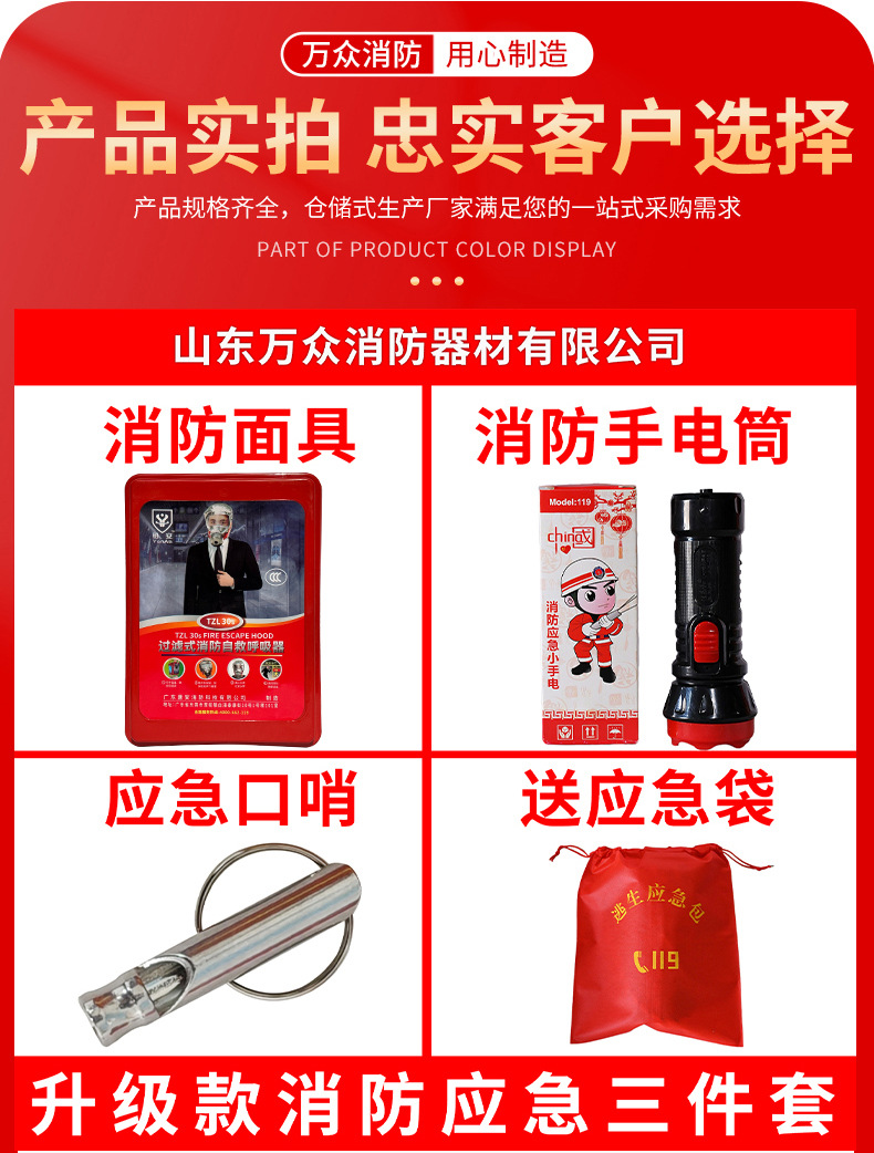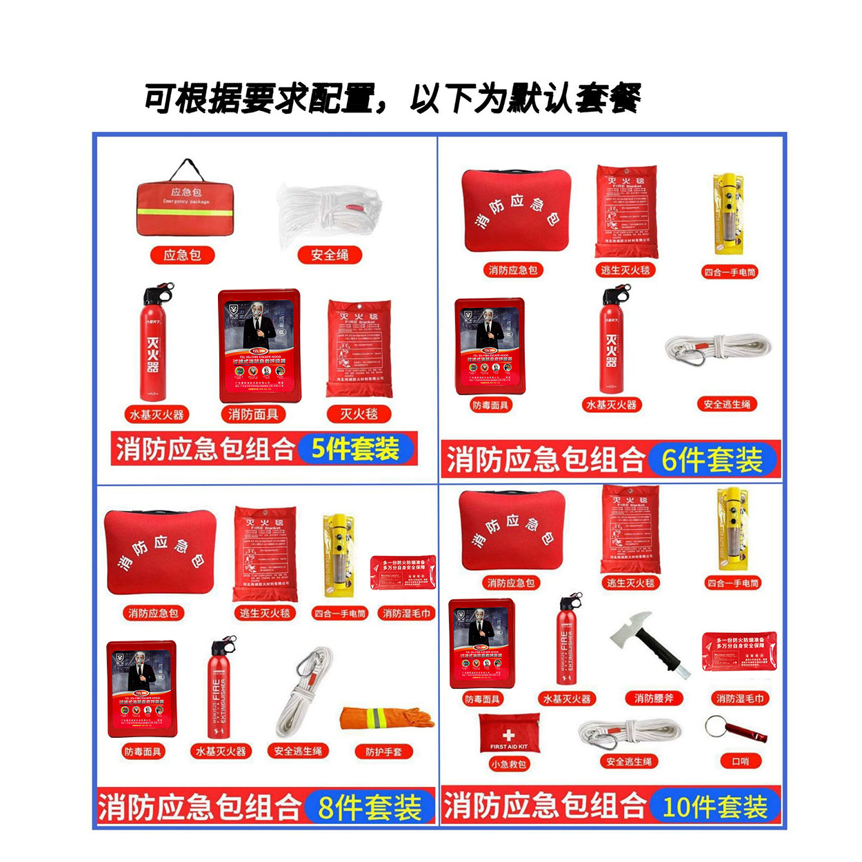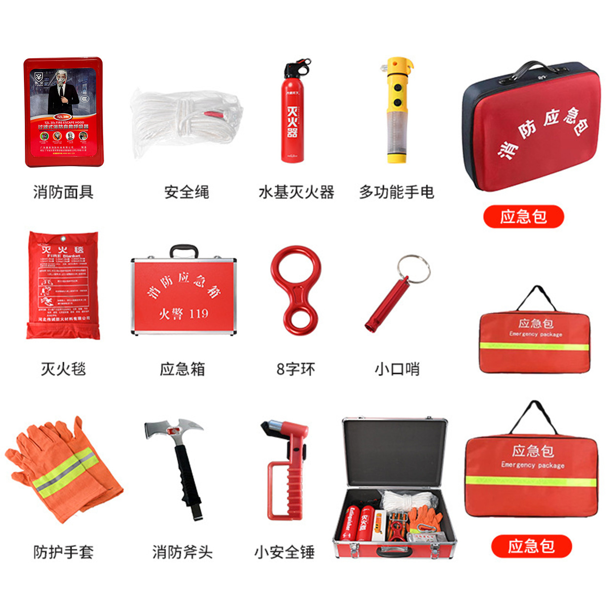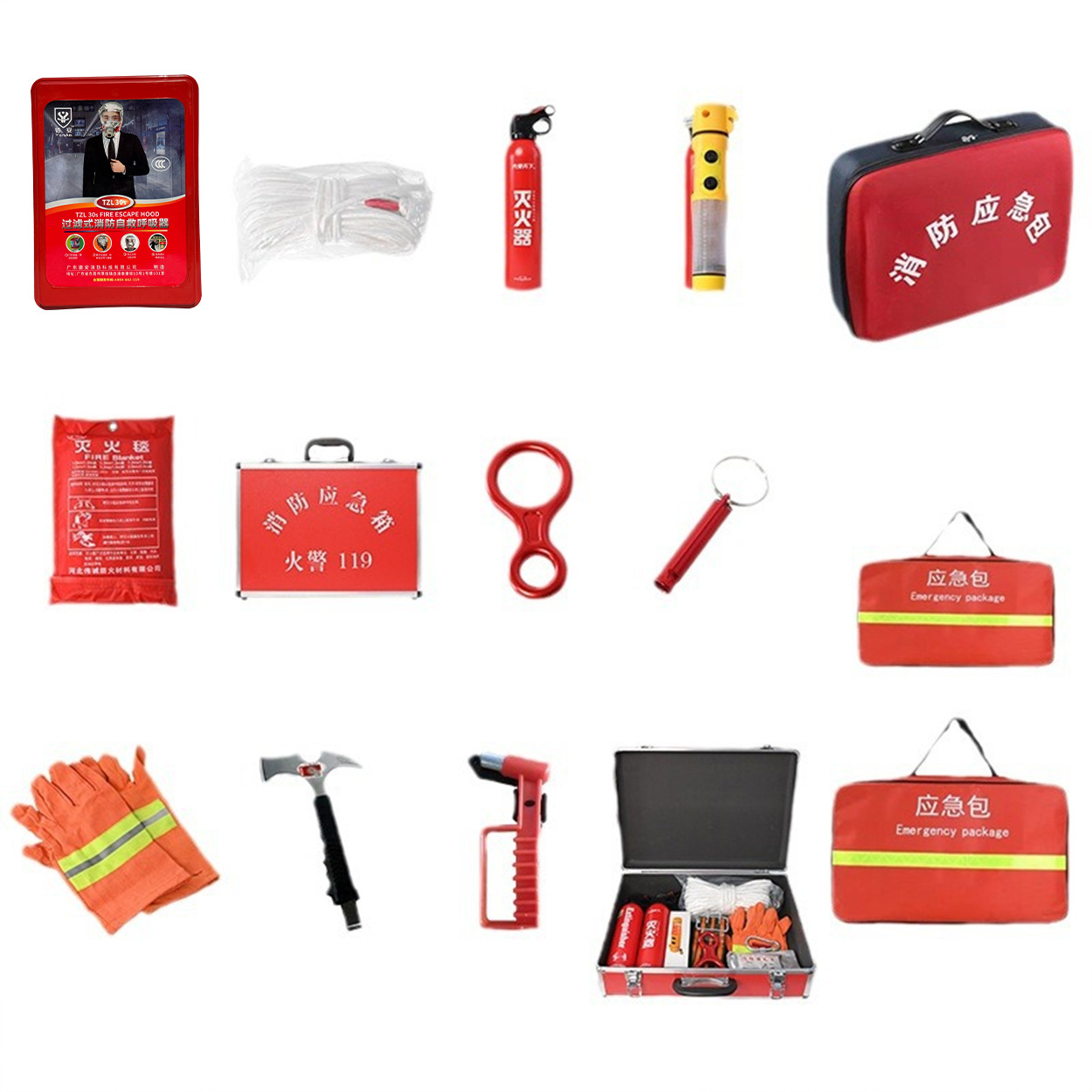 | 应急包五件套(橙色应急包+安全绳+水基灭火器+消防面具+灭火毯) | USD $11.85 | 8825 piece available |
