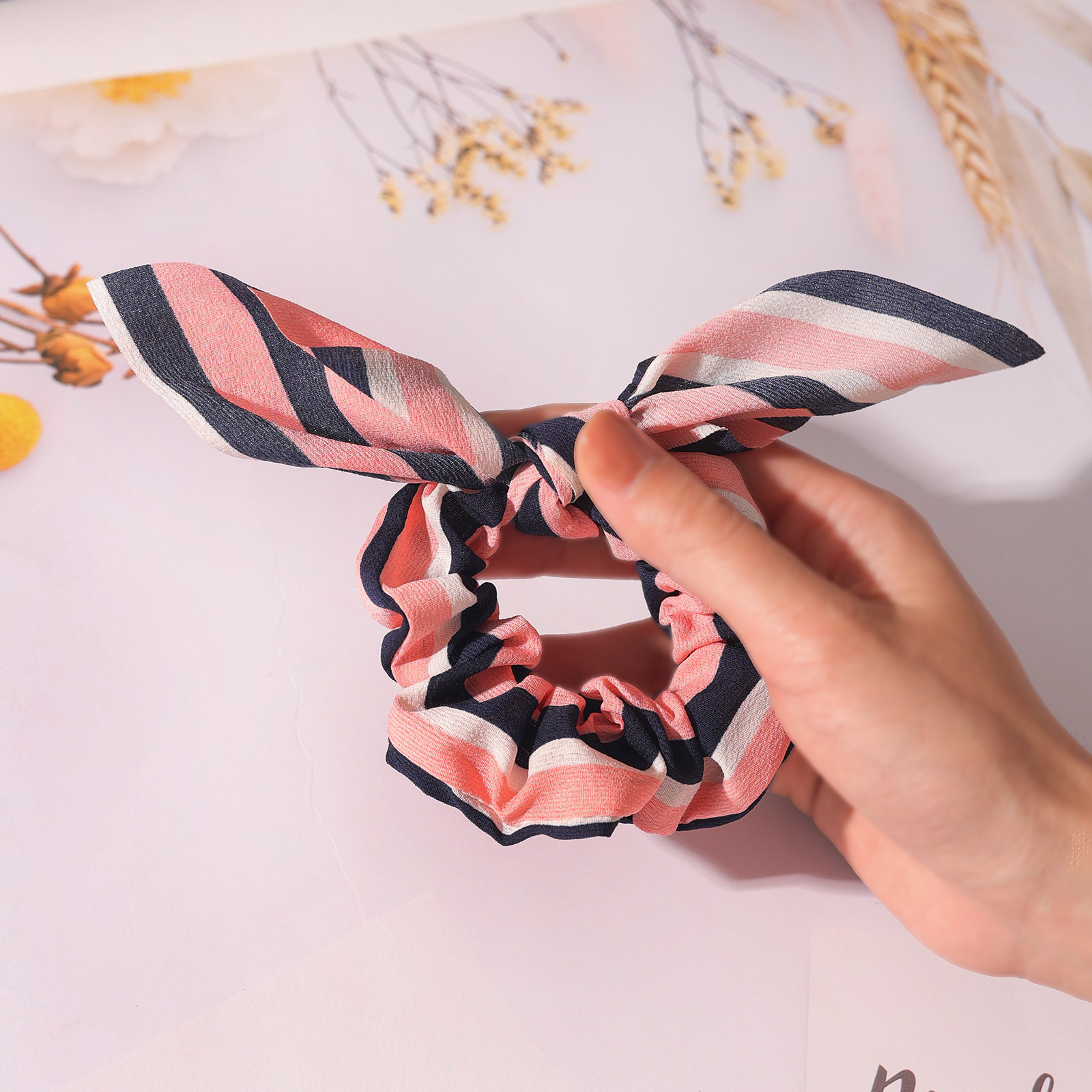 欧美流行条纹印花蝴蝶结发圈兔耳朵头绳发饰女士女孩简约发饰