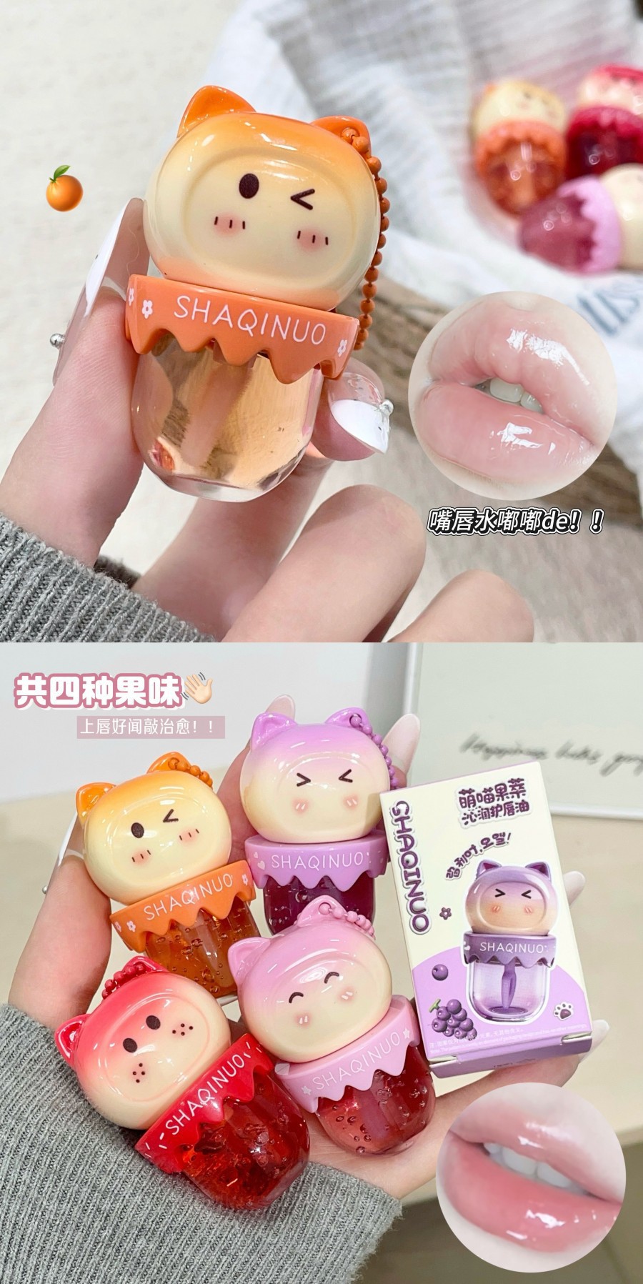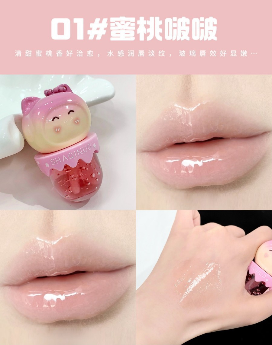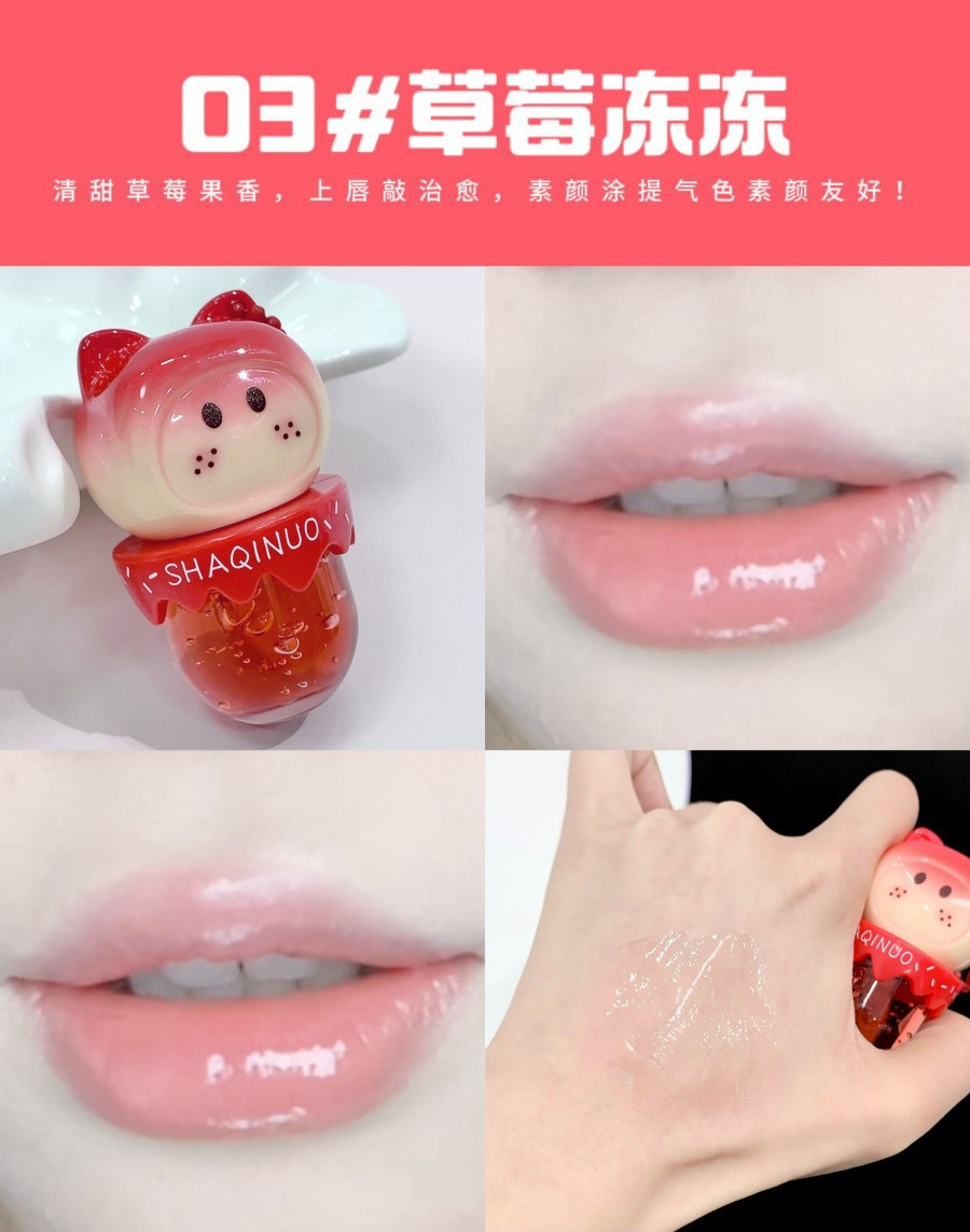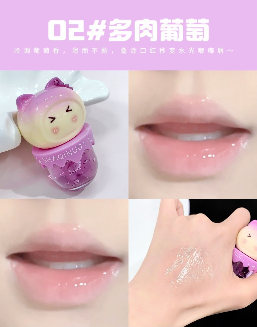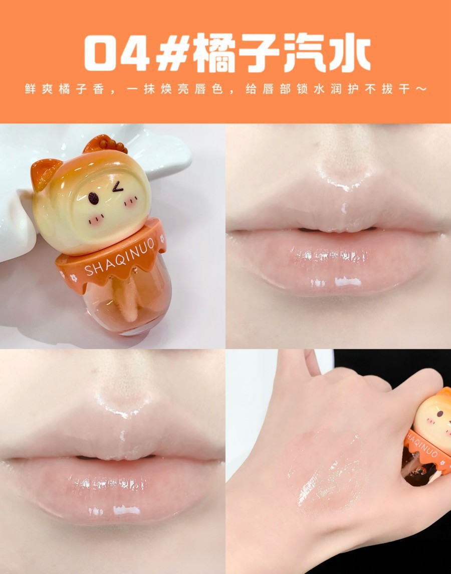 跨境美妆SHAQINUO 4色可爱卡通唇油萌喵果萃护补水保湿滋润嘟唇膜