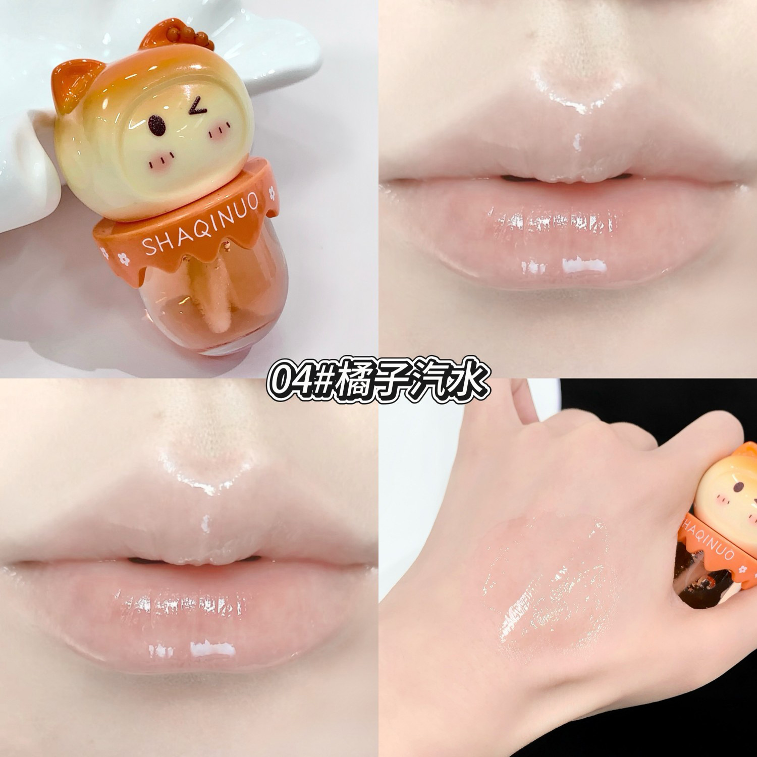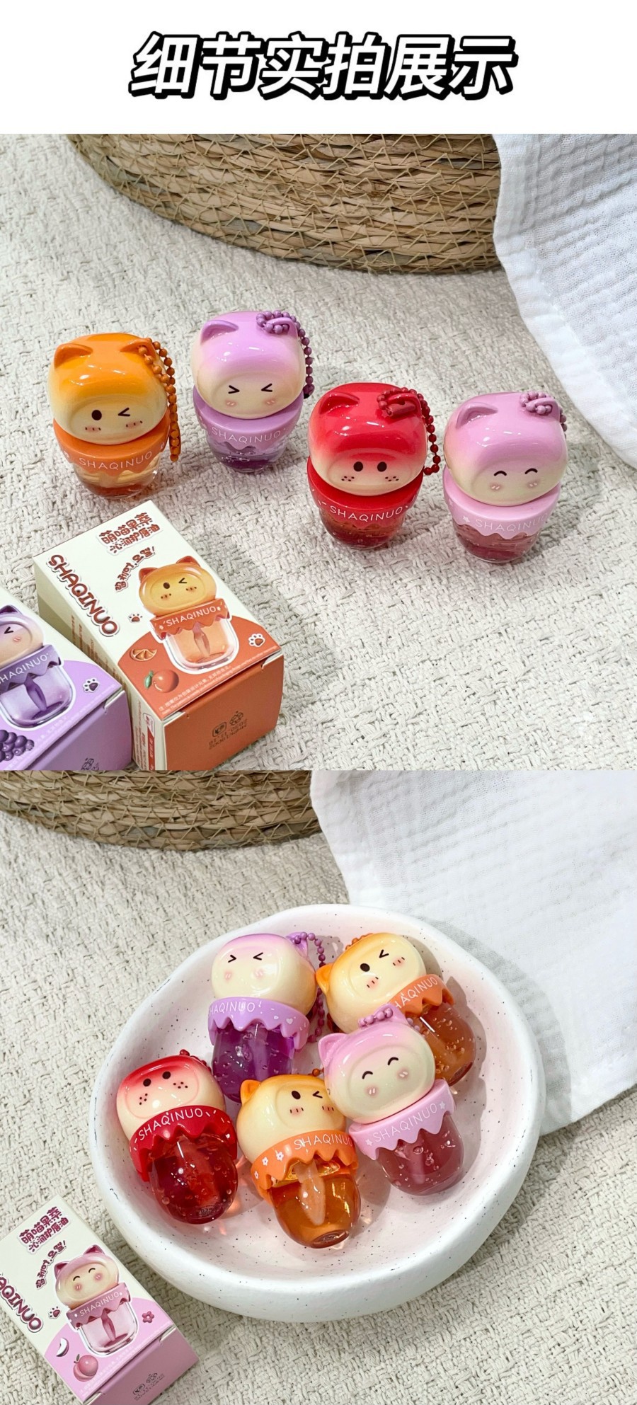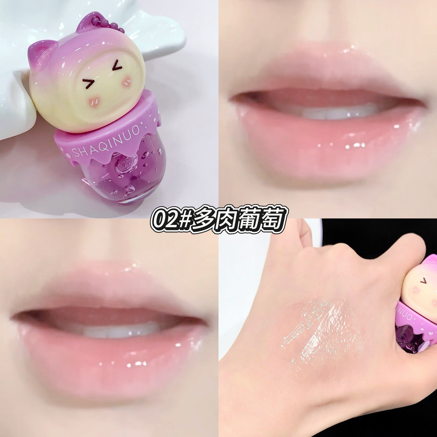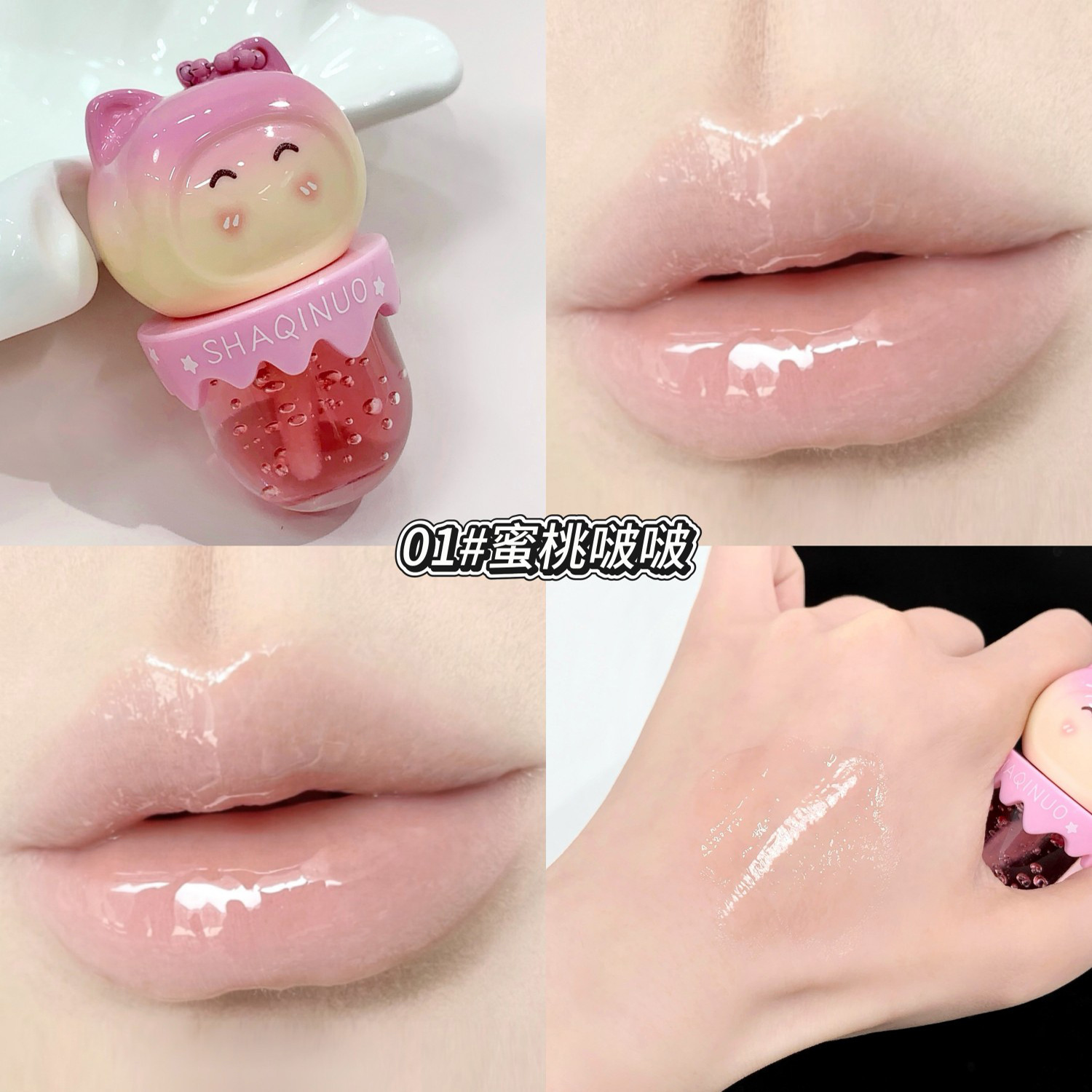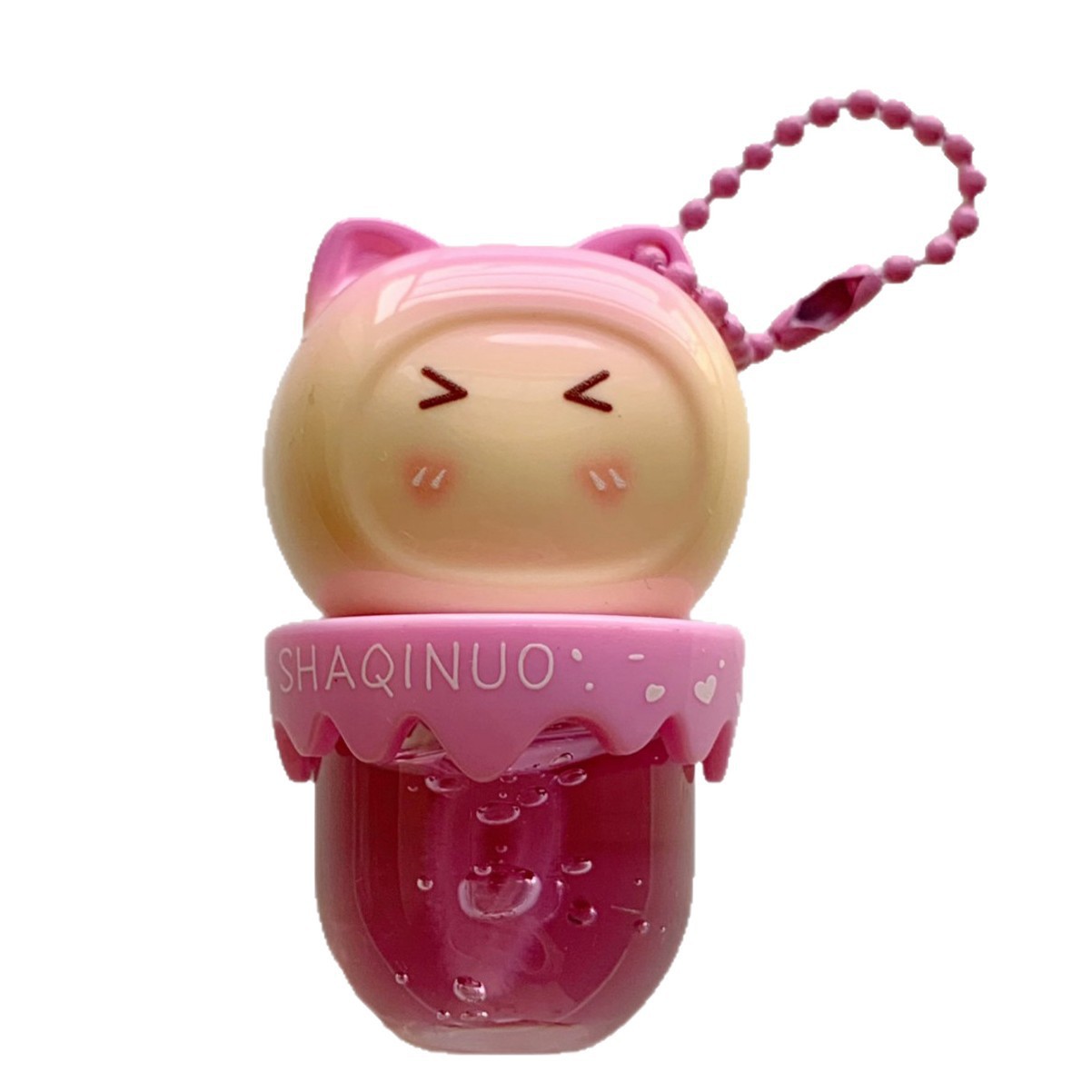 跨境美妆SHAQINUO 4色可爱卡通唇油萌喵果萃护补水保湿滋润嘟唇膜