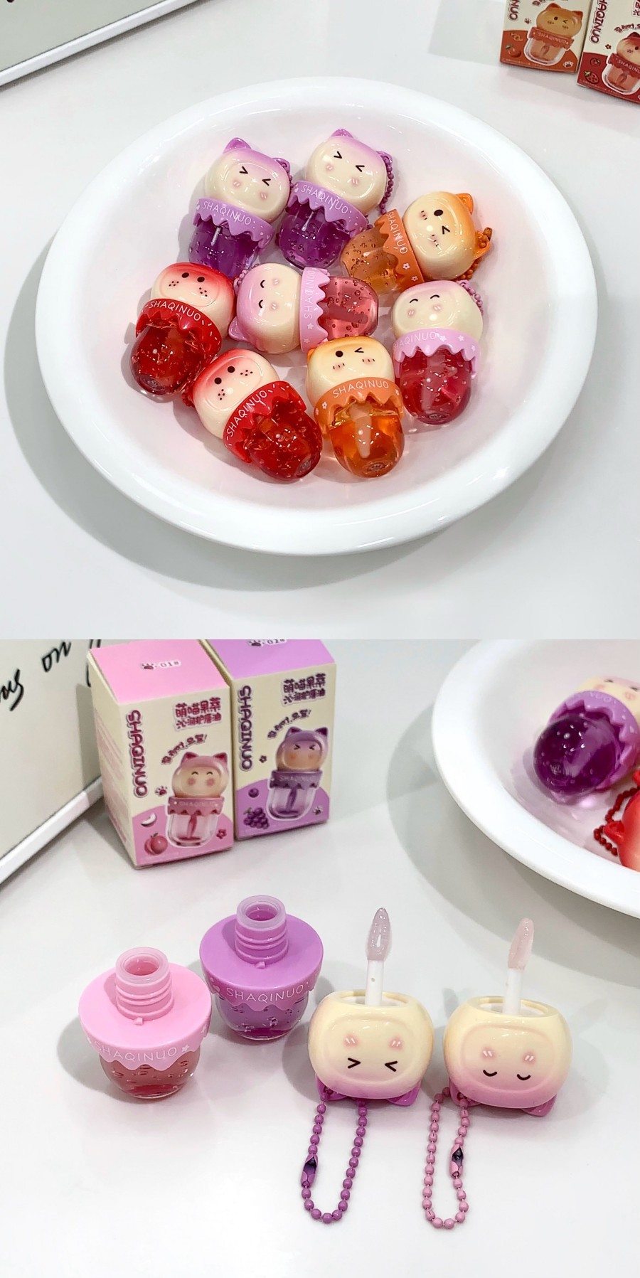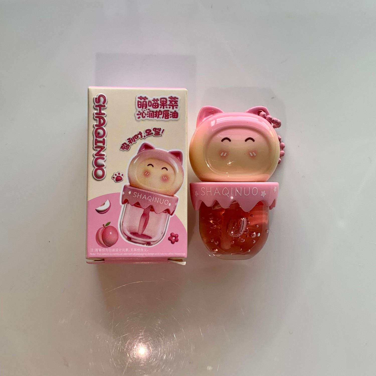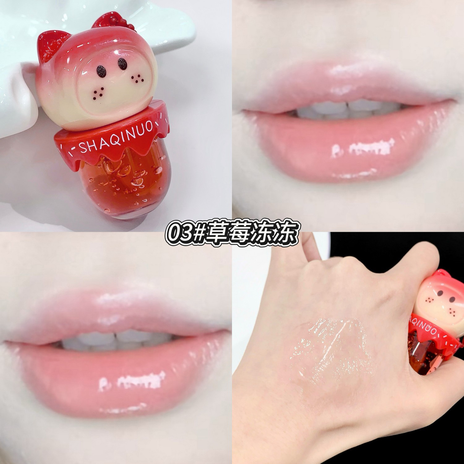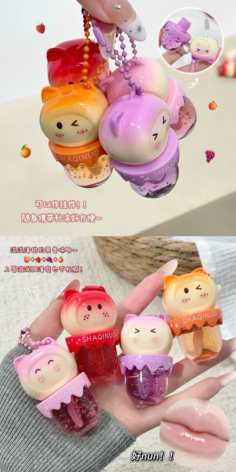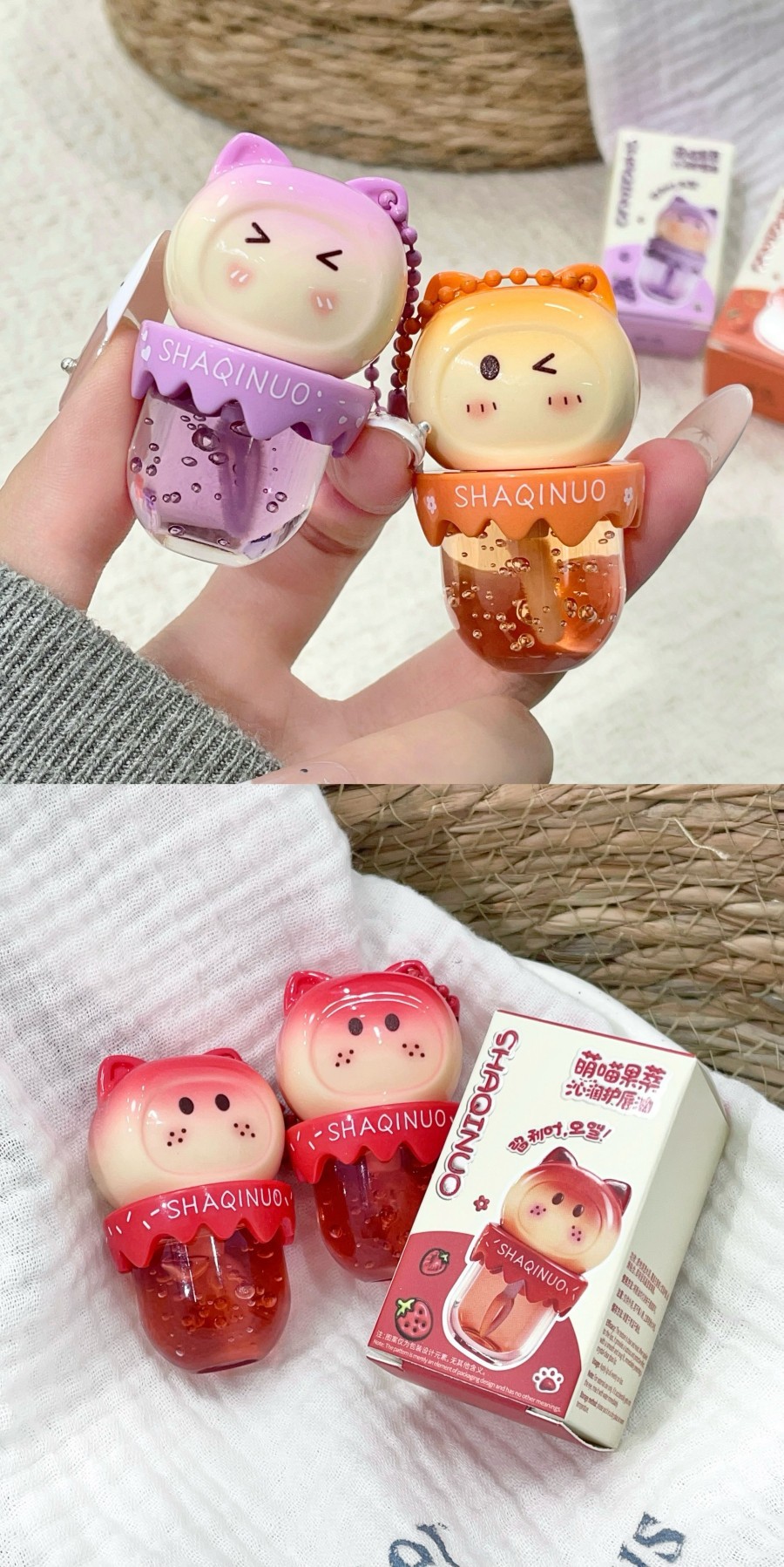 跨境美妆SHAQINUO 4色可爱卡通唇油萌喵果萃护补水保湿滋润嘟唇膜