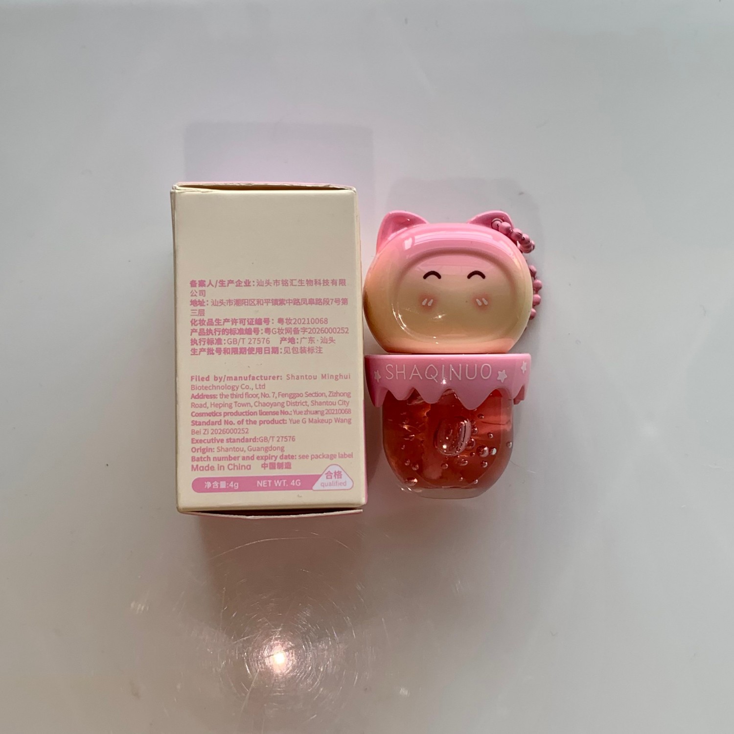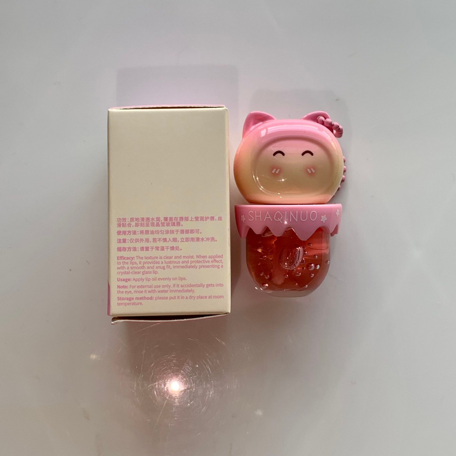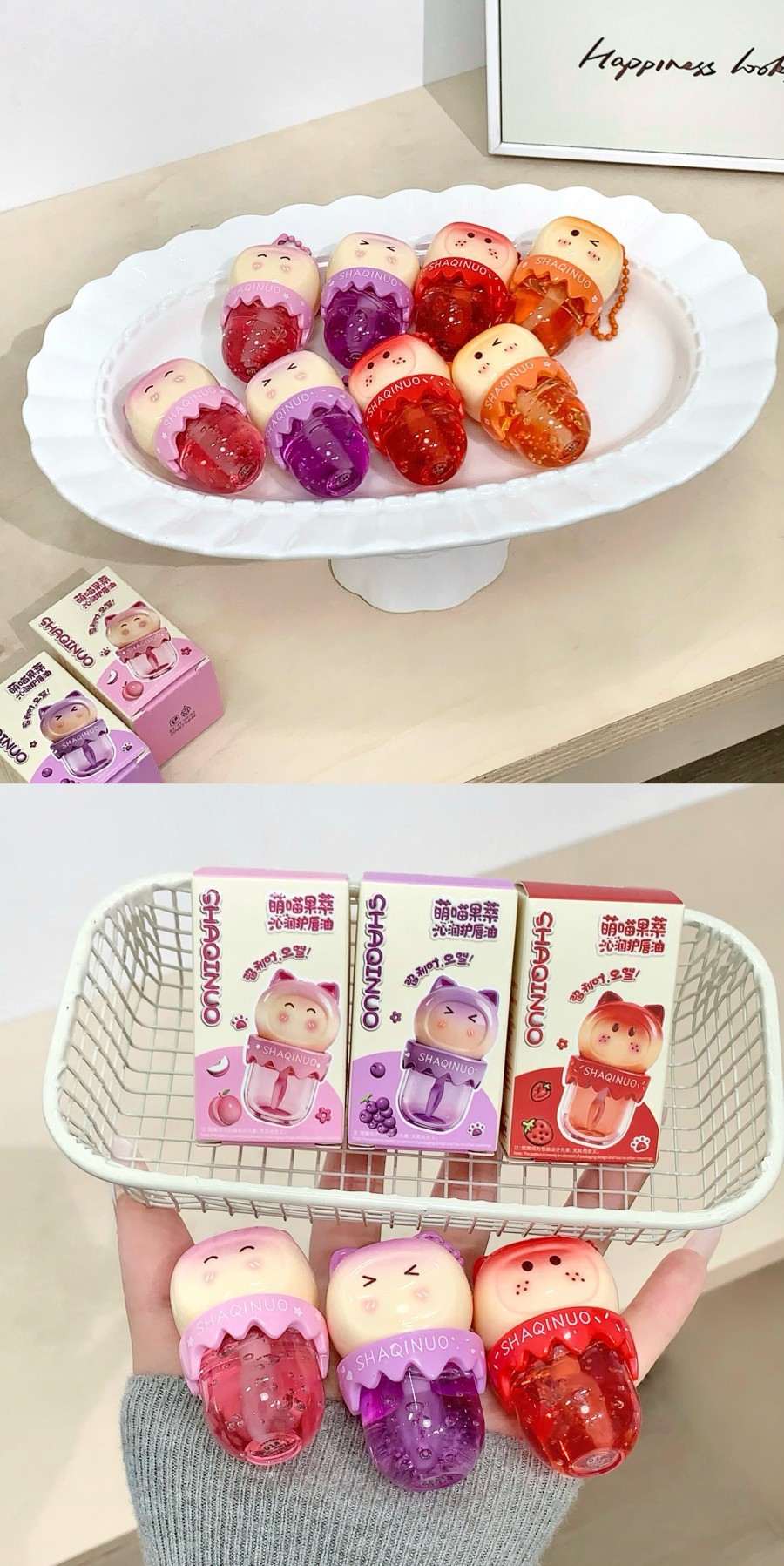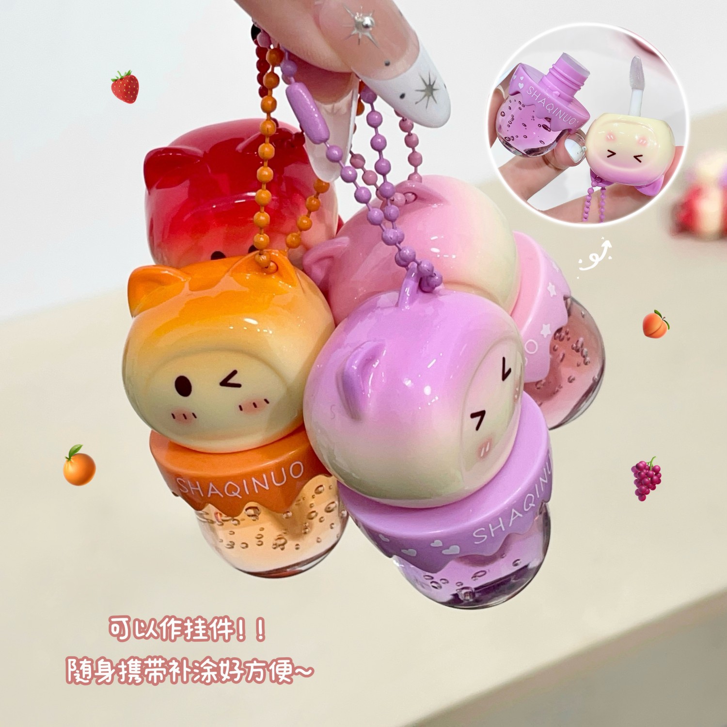 跨境美妆SHAQINUO 4色可爱卡通唇油萌喵果萃护补水保湿滋润嘟唇膜