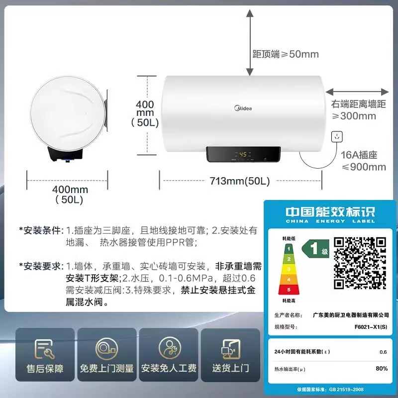 美的电热水器60家用电加热一级省电50储水式速热水量洗澡旗舰店X1