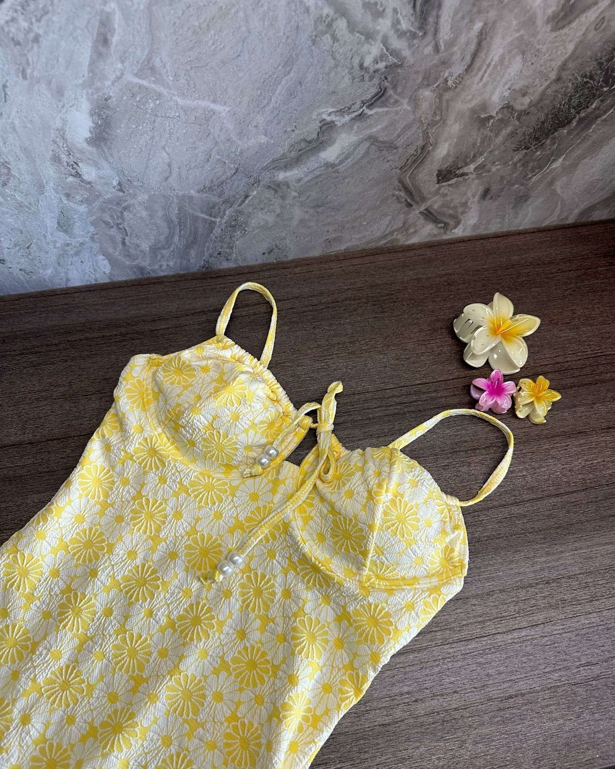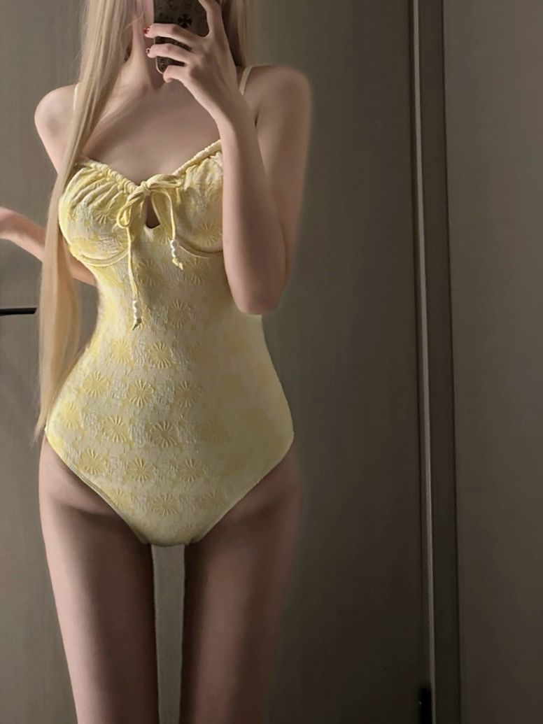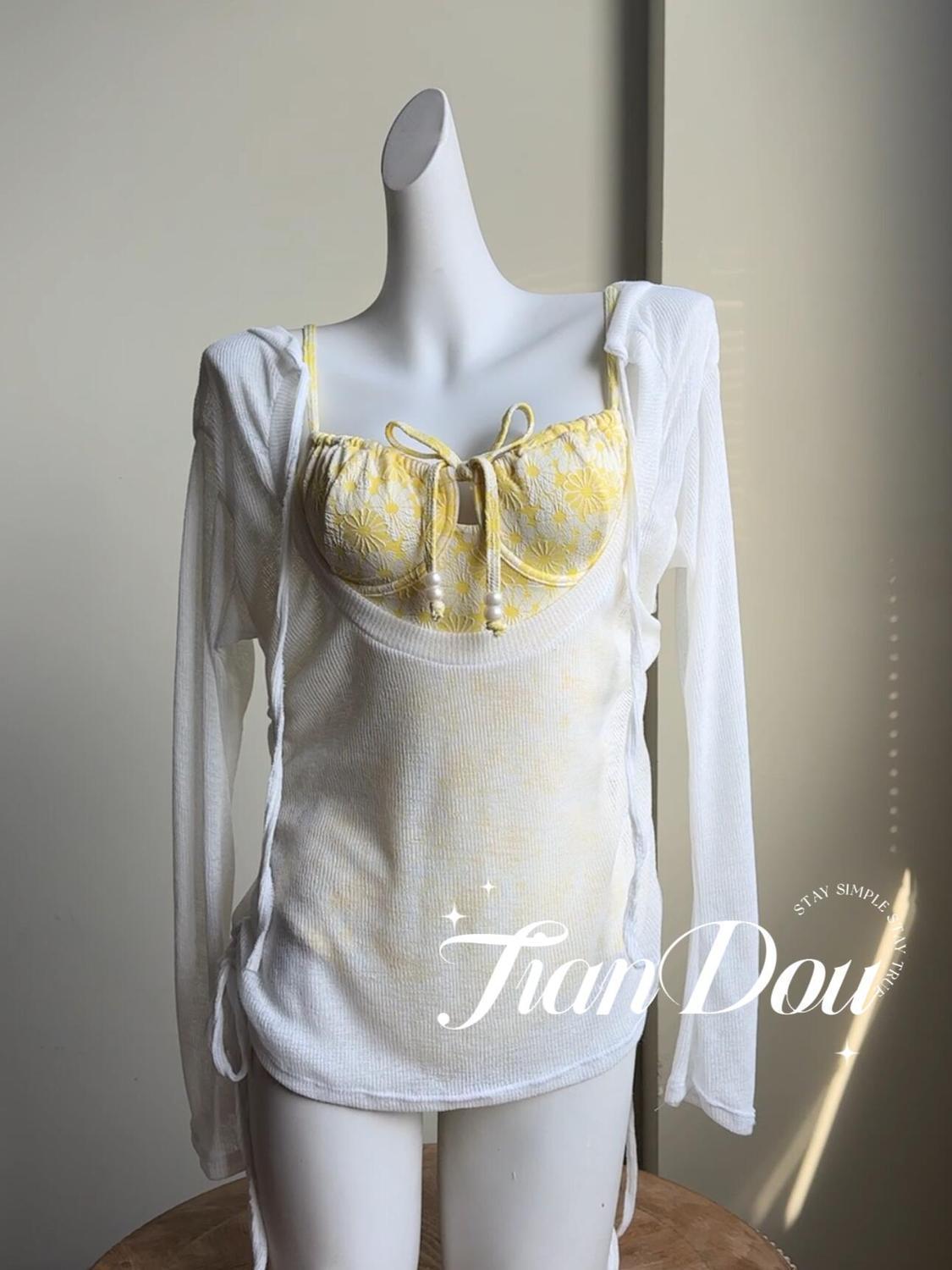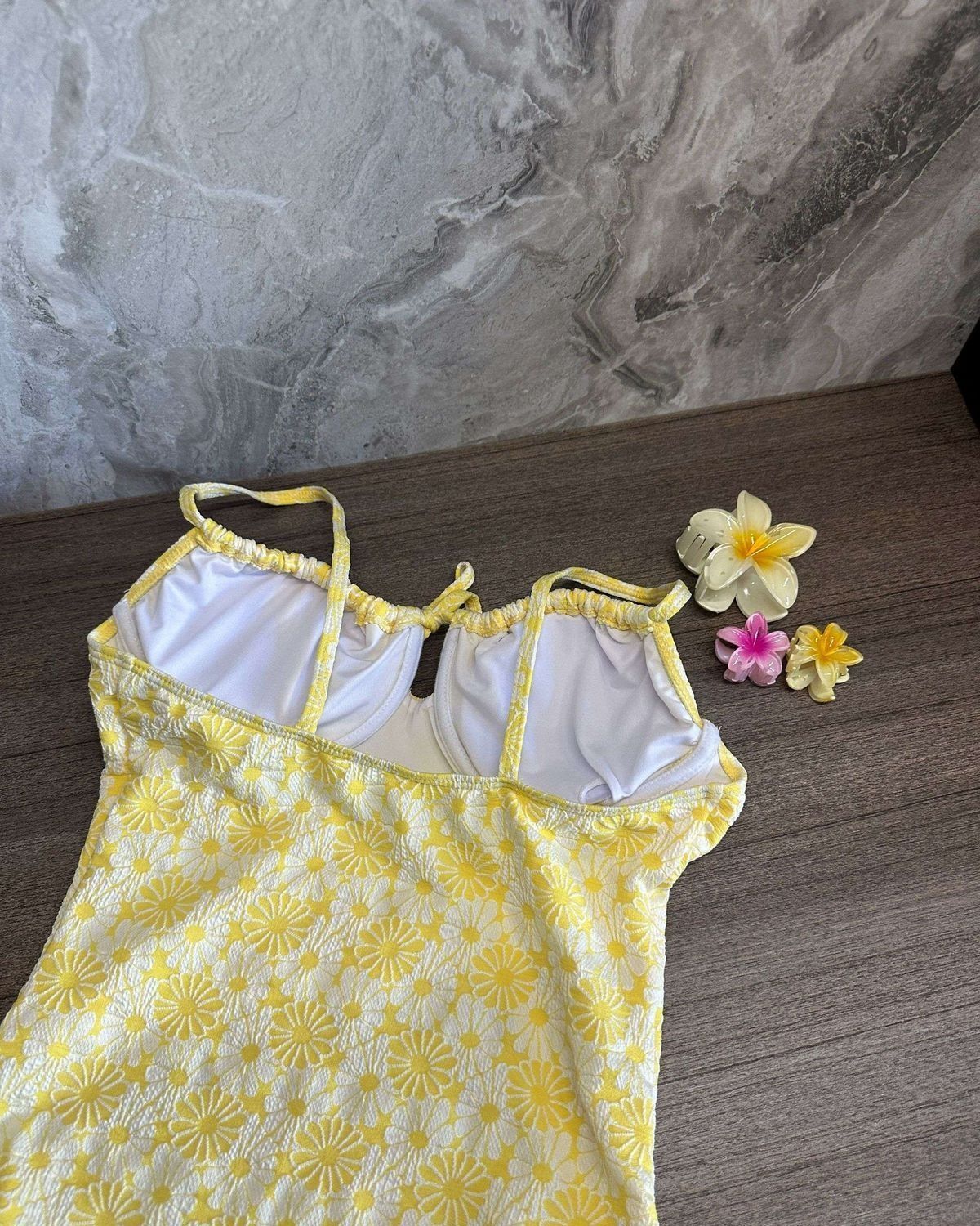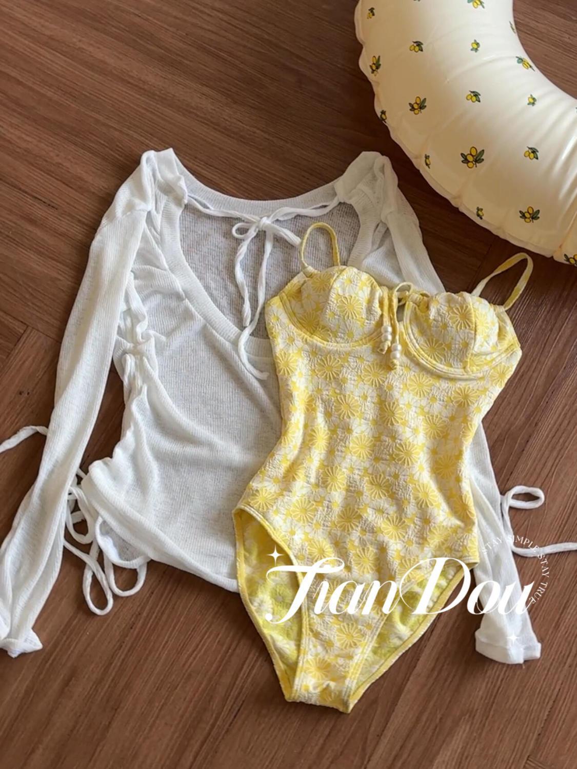 【柠檬加冰】黄色高级度假慵懒风罩衫连体纯欲小胸聚拢泳衣比基尼