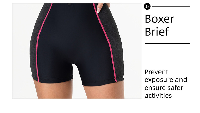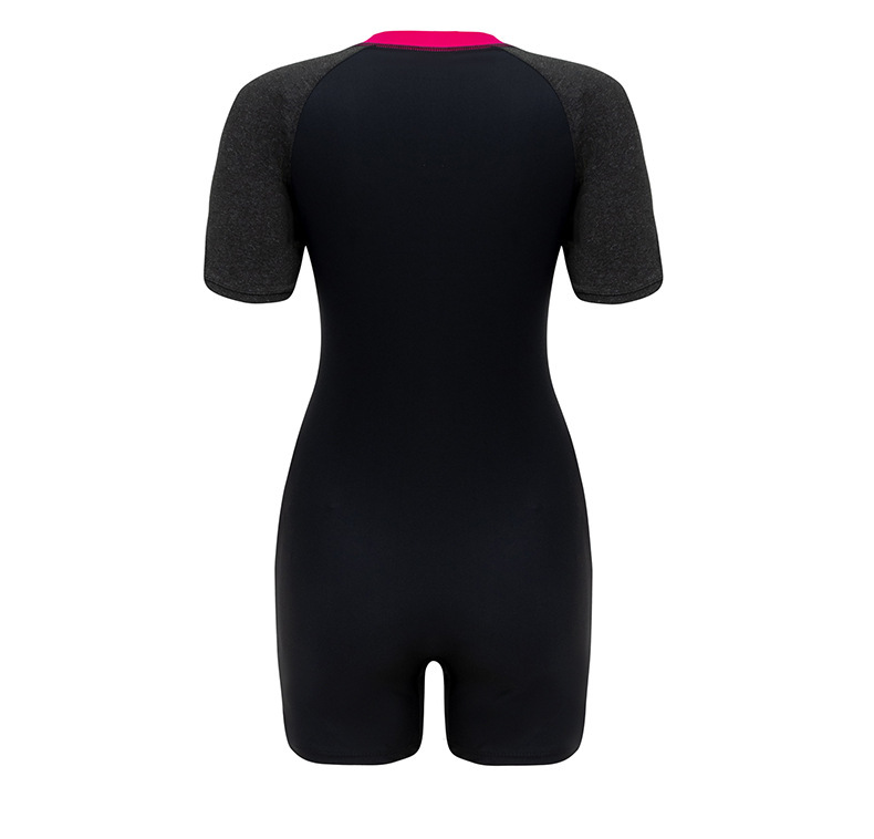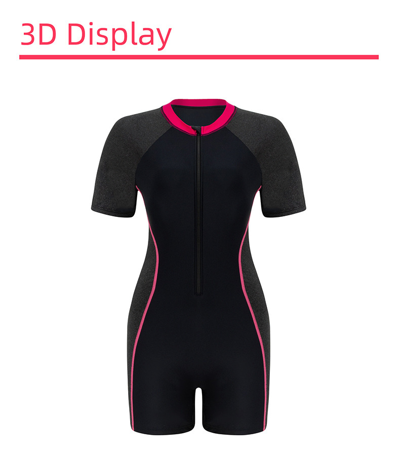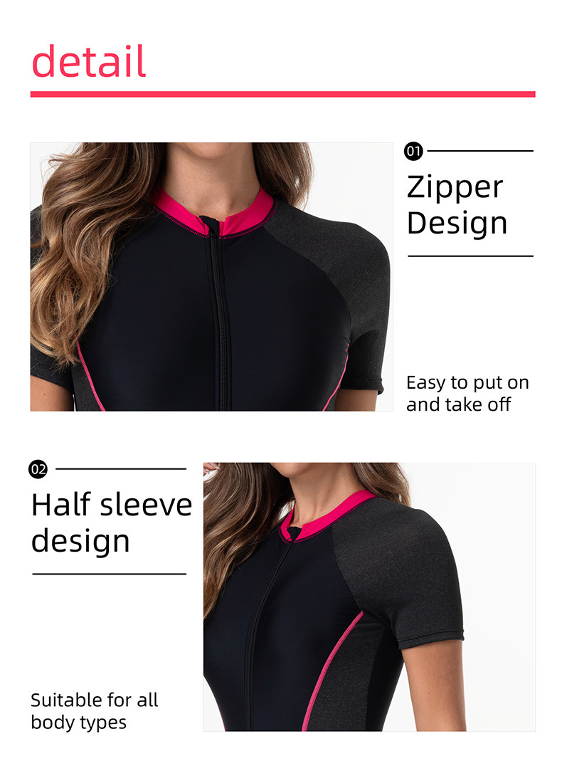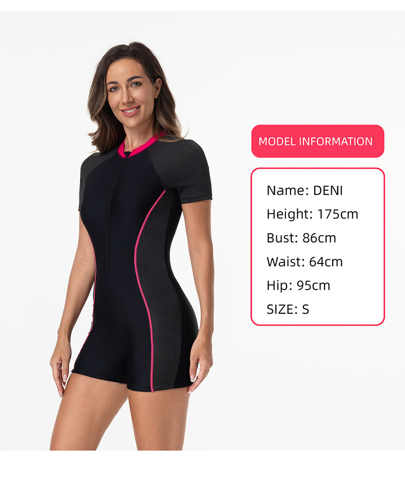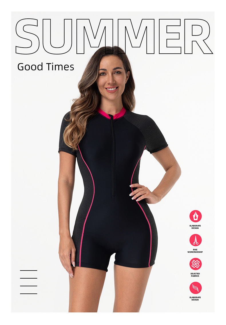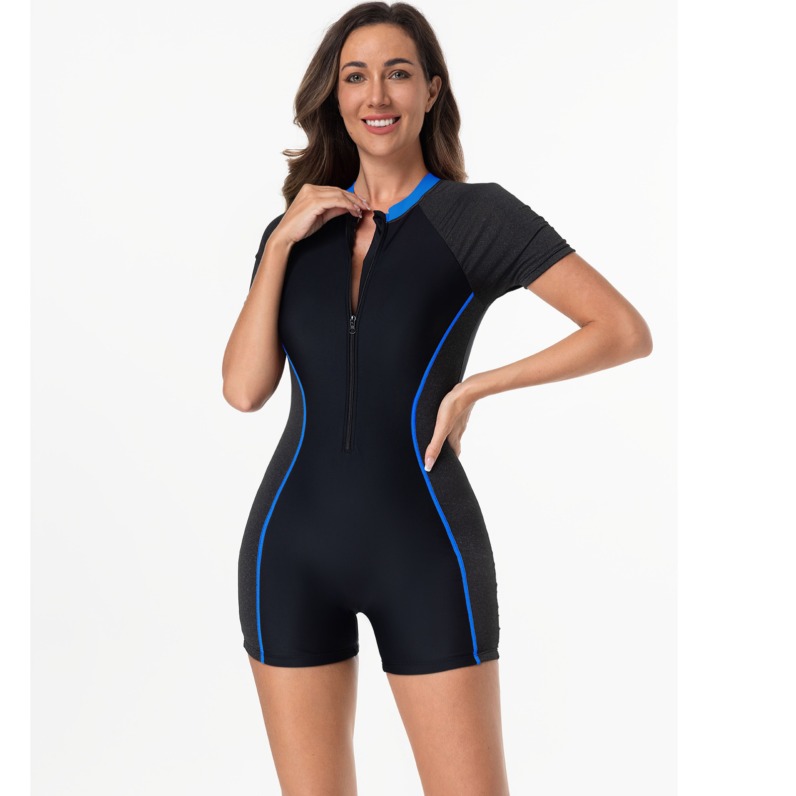 2025亚马逊新款冲浪拼色短袖保守连体泳衣女外贸欧美平角拉链泳装