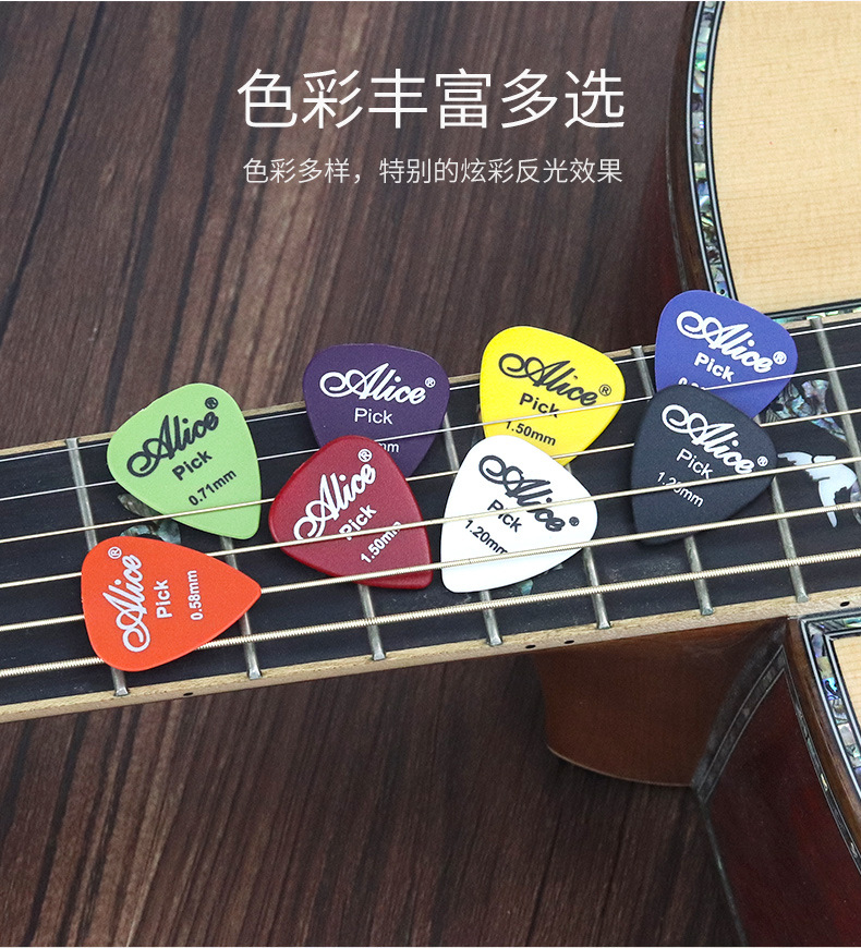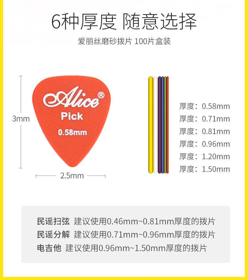 爱丽丝拨片 吉他尤克里里弹片防滑磨砂盒装100片扫弦自选厚度光面