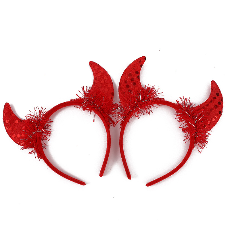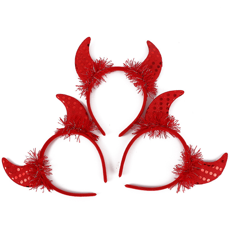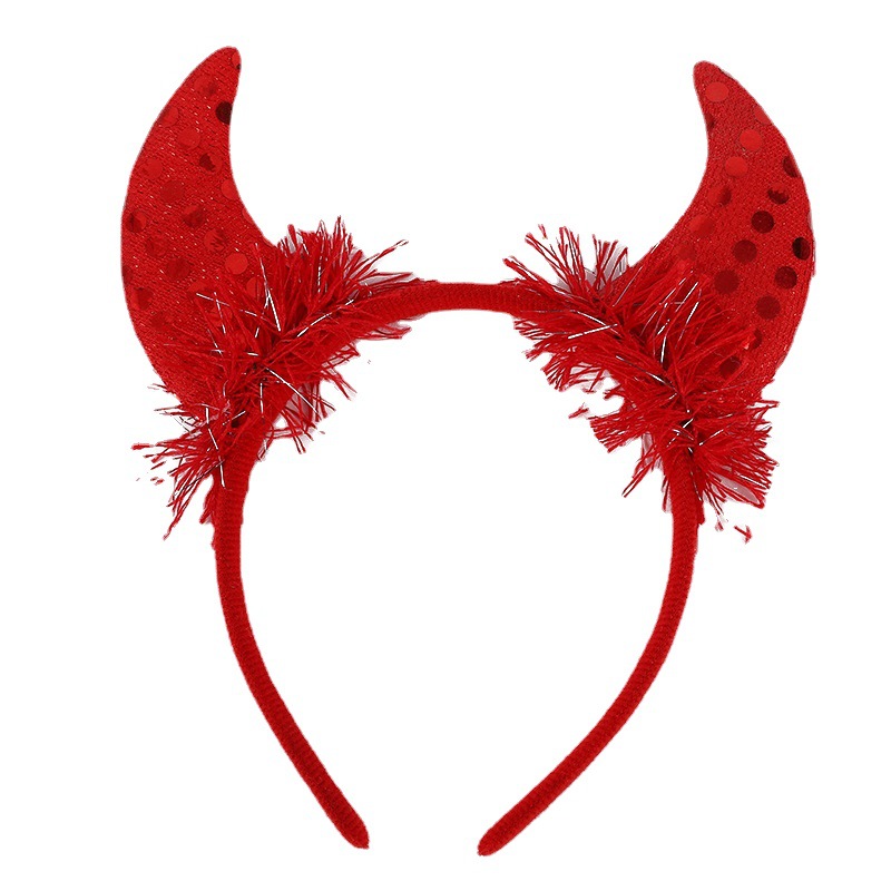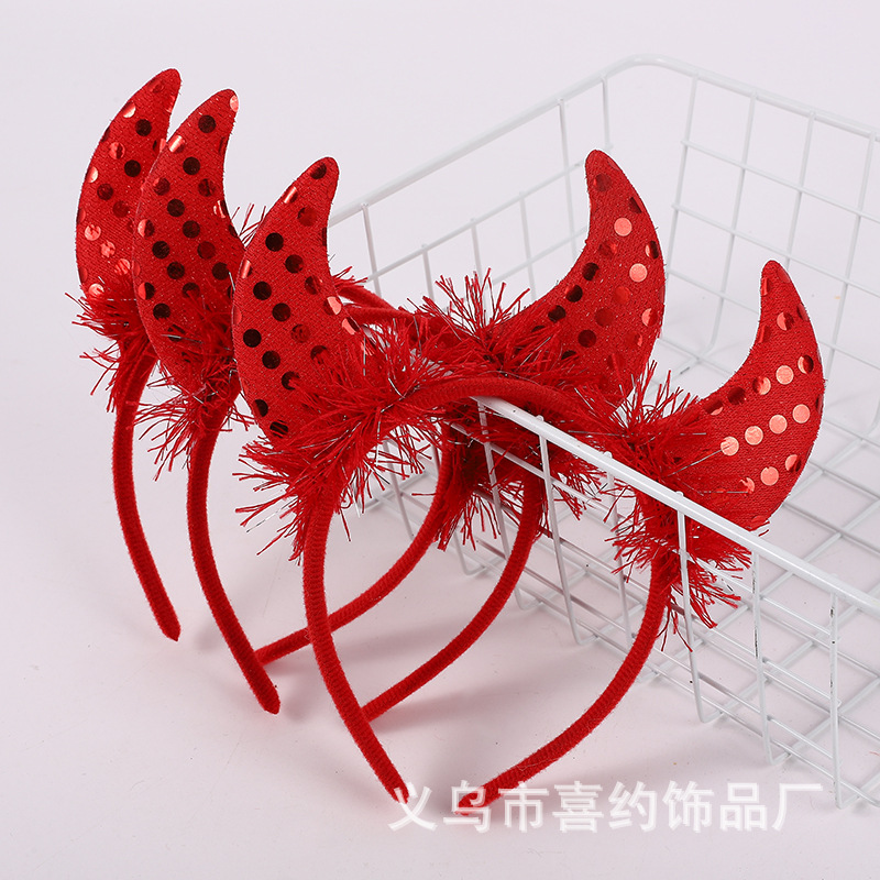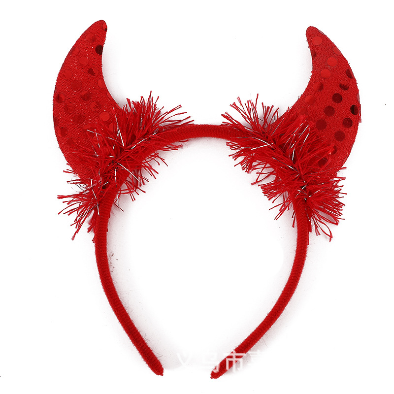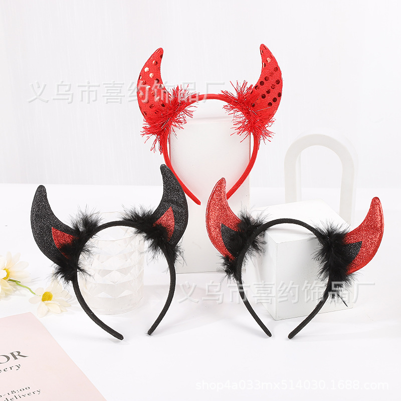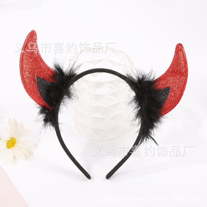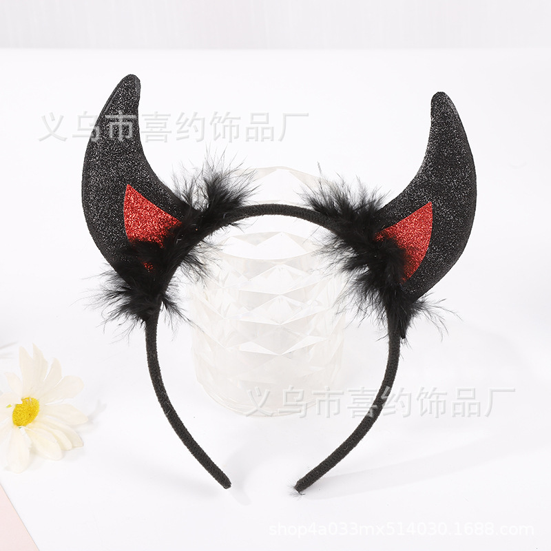 万圣节恶魔羽毛亮片牛角发箍 儿童鬼节舞会派对装扮表演牛角头饰