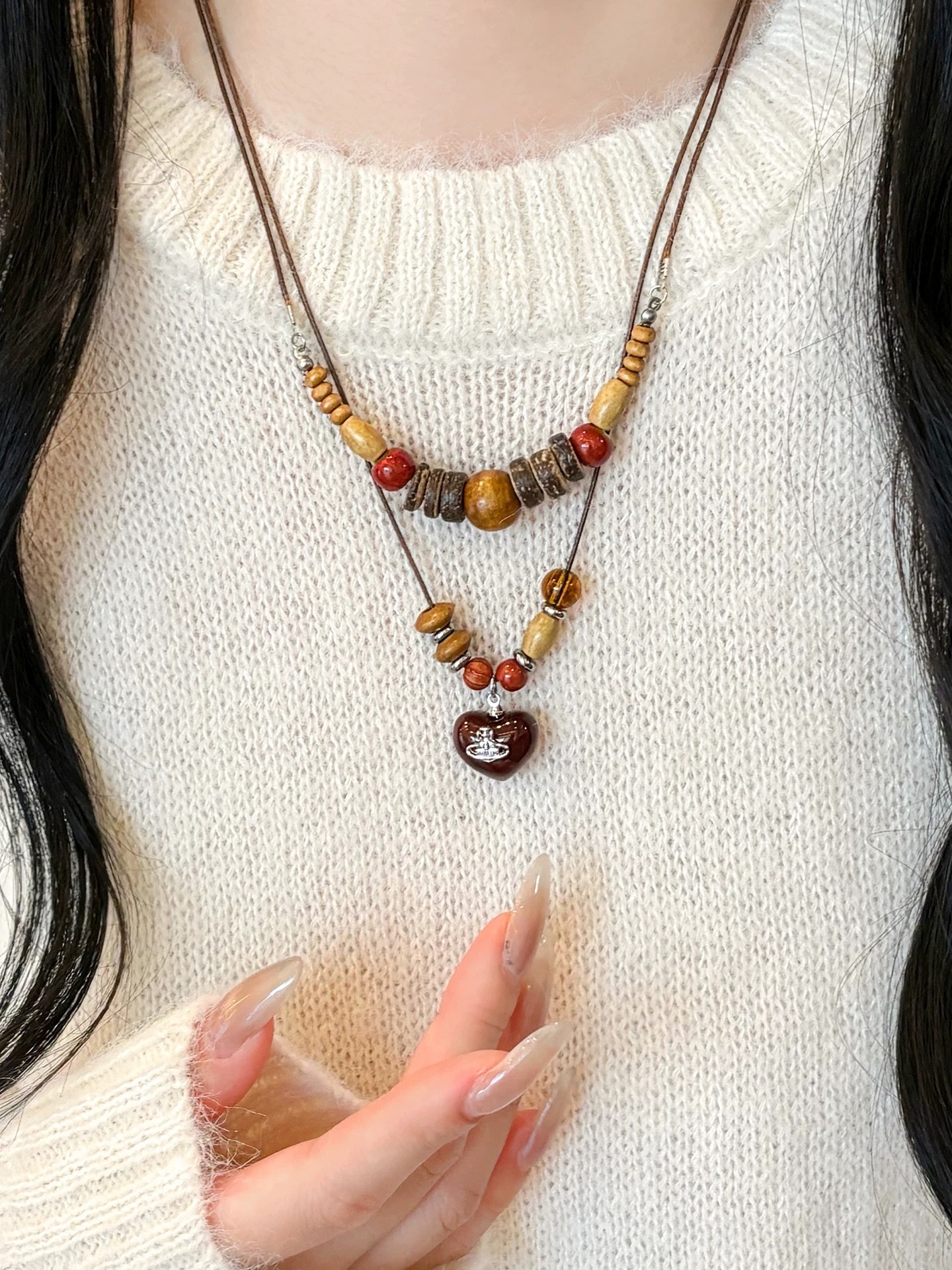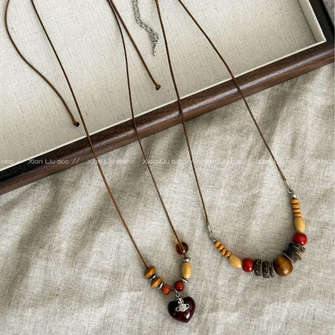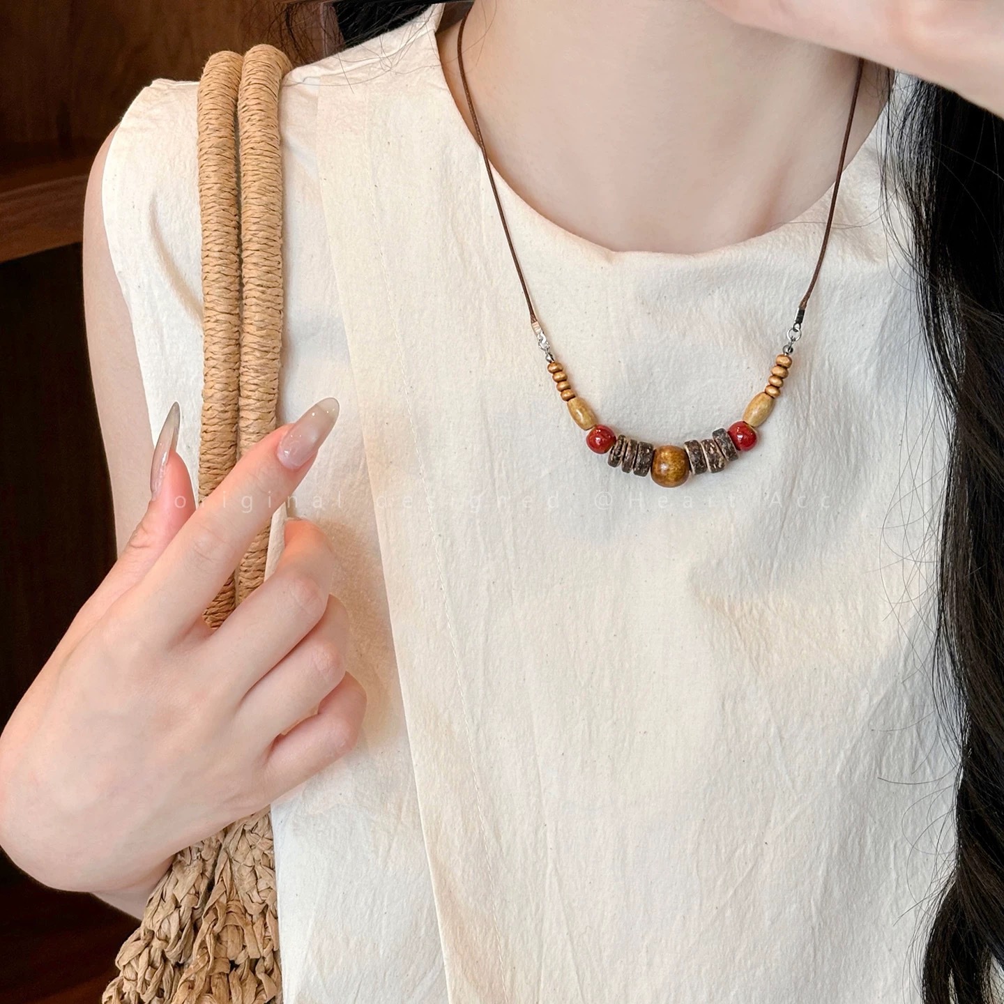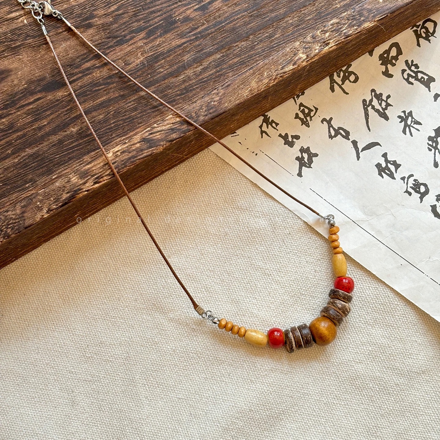 复古木质串珠吊坠项链女小众设计感民族风配饰时尚长款百搭毛衣链