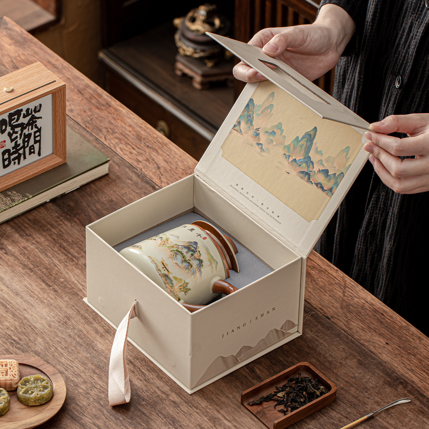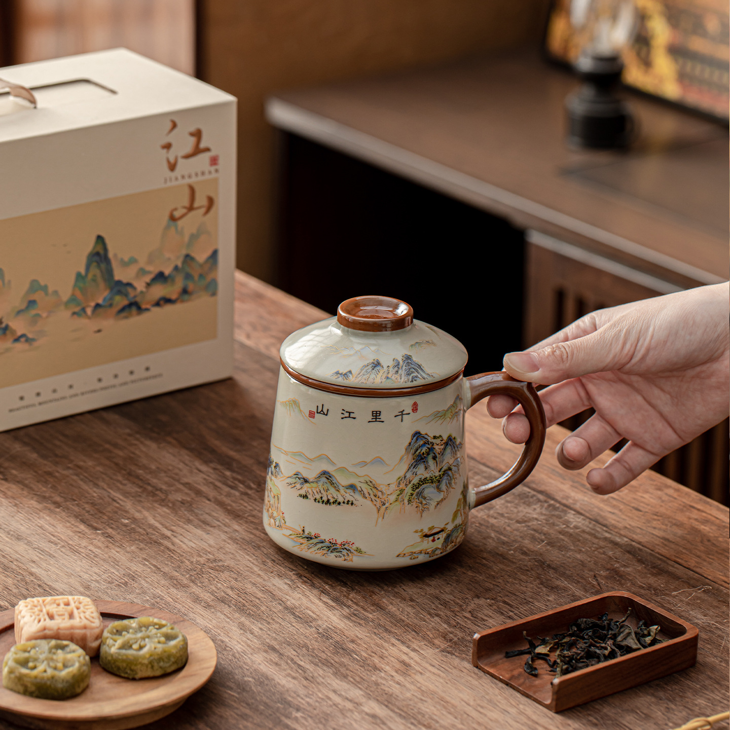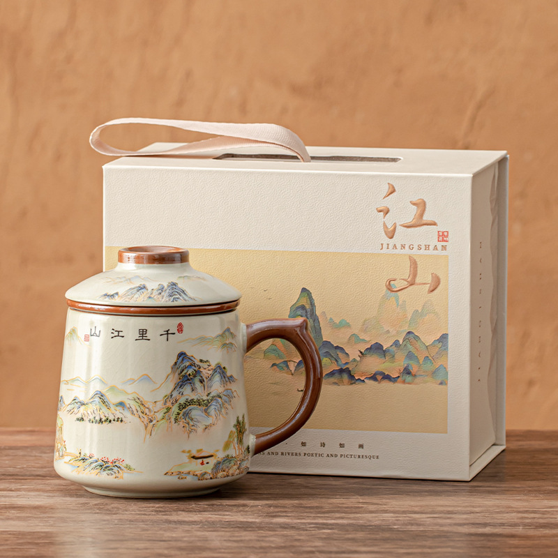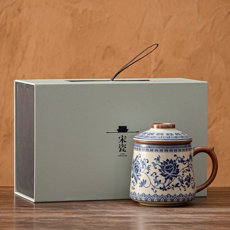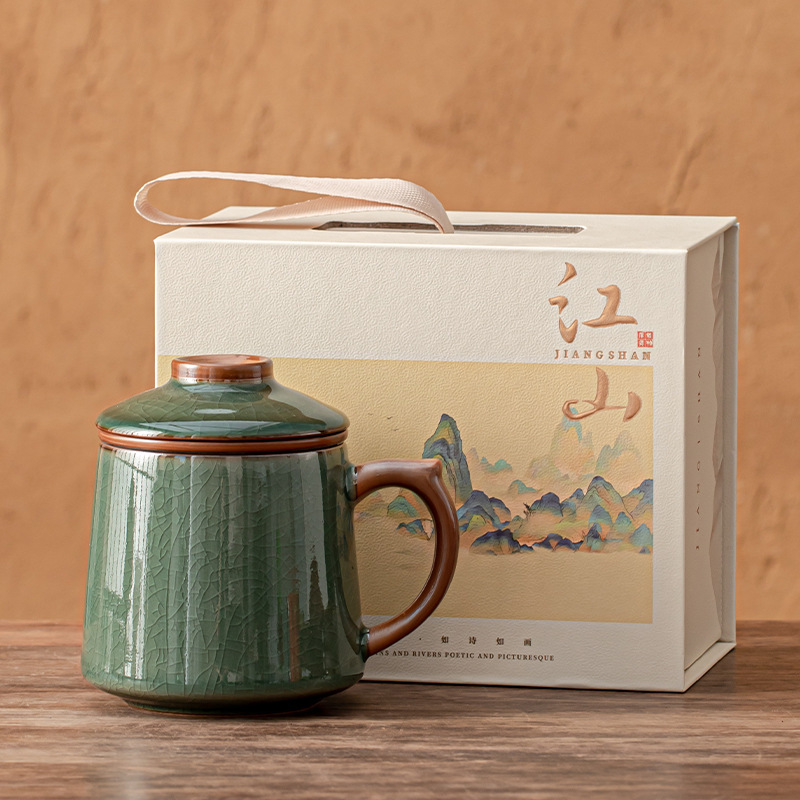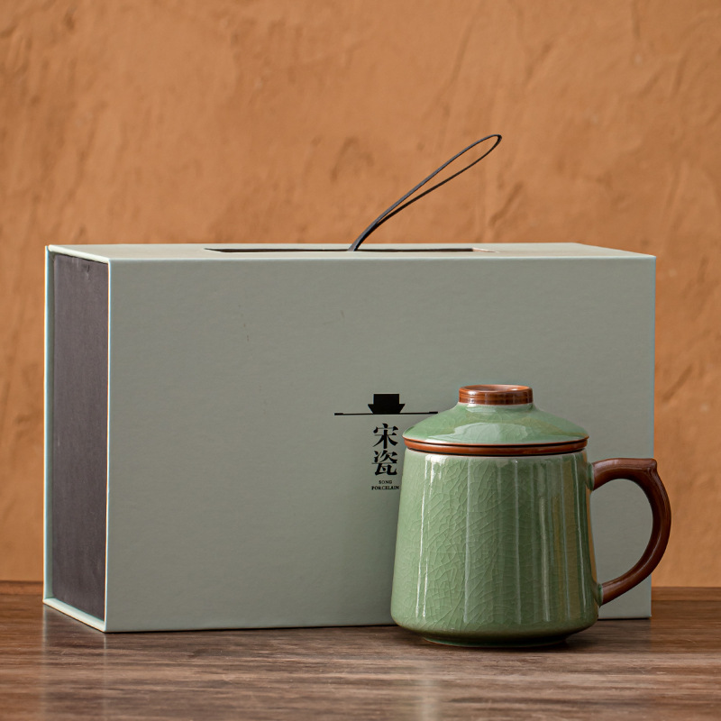 陶瓷杯子茶水分离杯马克杯汝窑水杯带礼盒办公杯茶杯礼盒定制