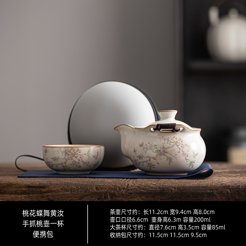 青花黄汝便携旅行茶具套装快客杯一壶三杯套装胶囊包手抓壶批发