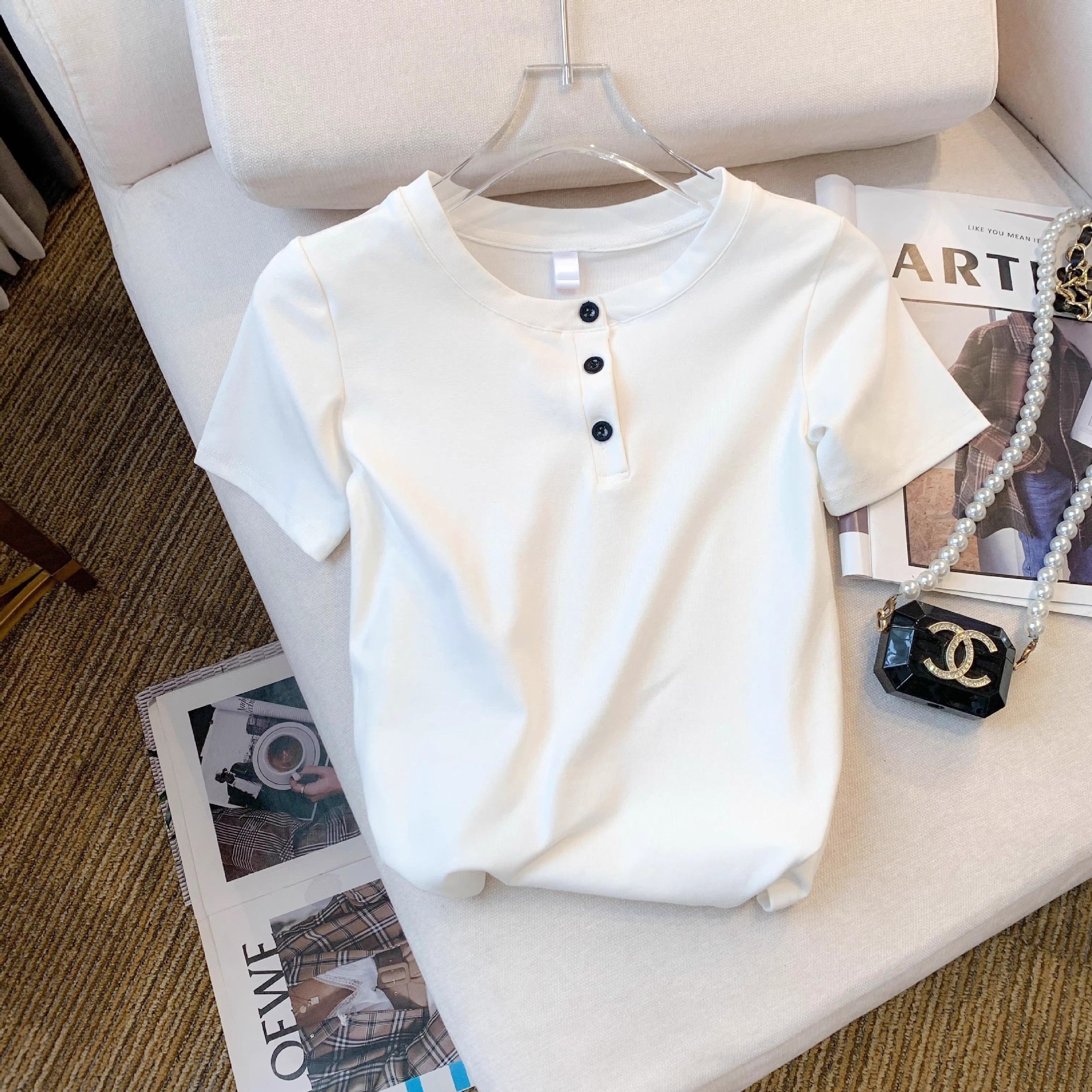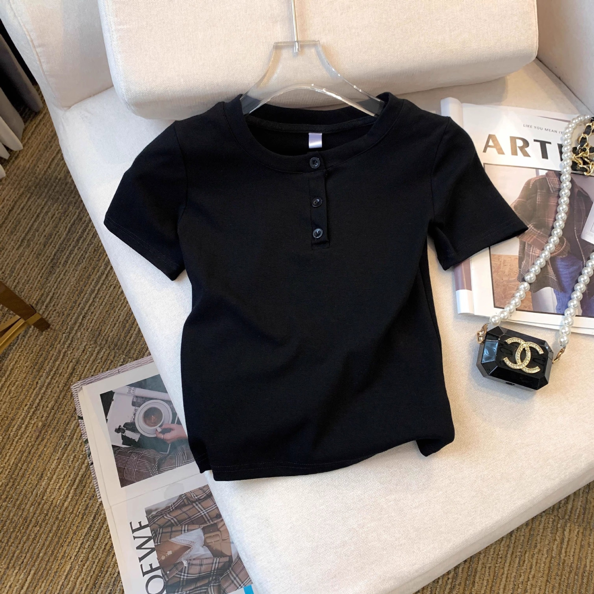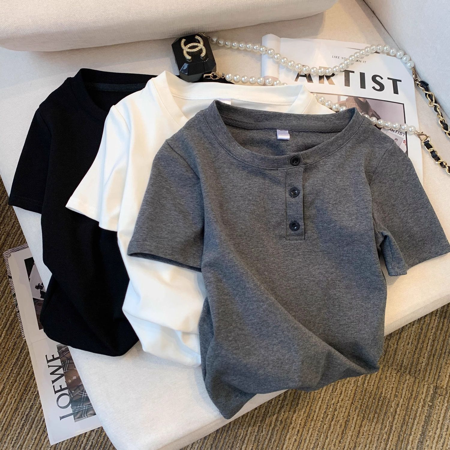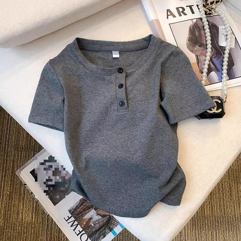 灰色纽扣圆领短款短袖t恤女夏季2026新款设计感修身正肩体恤上衣