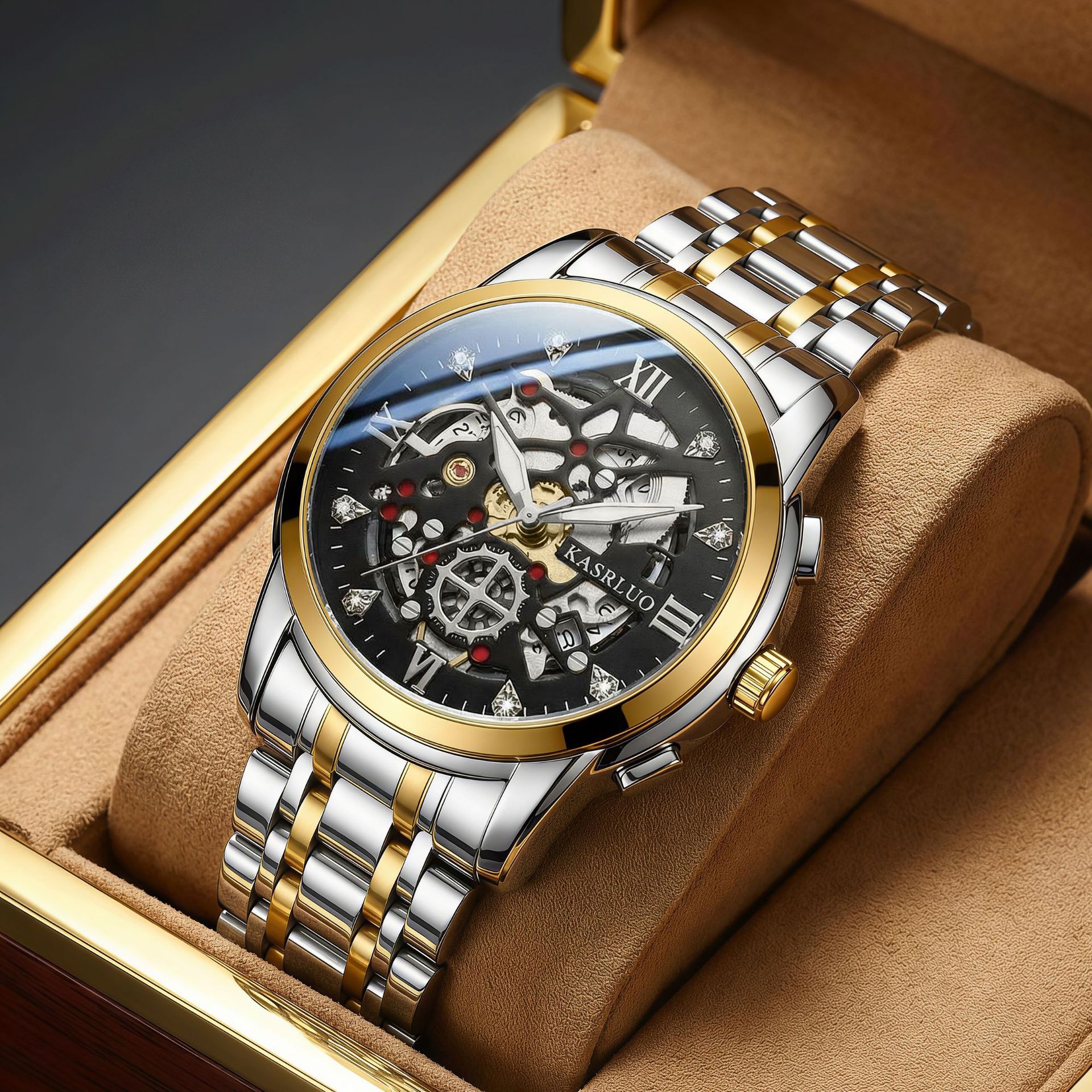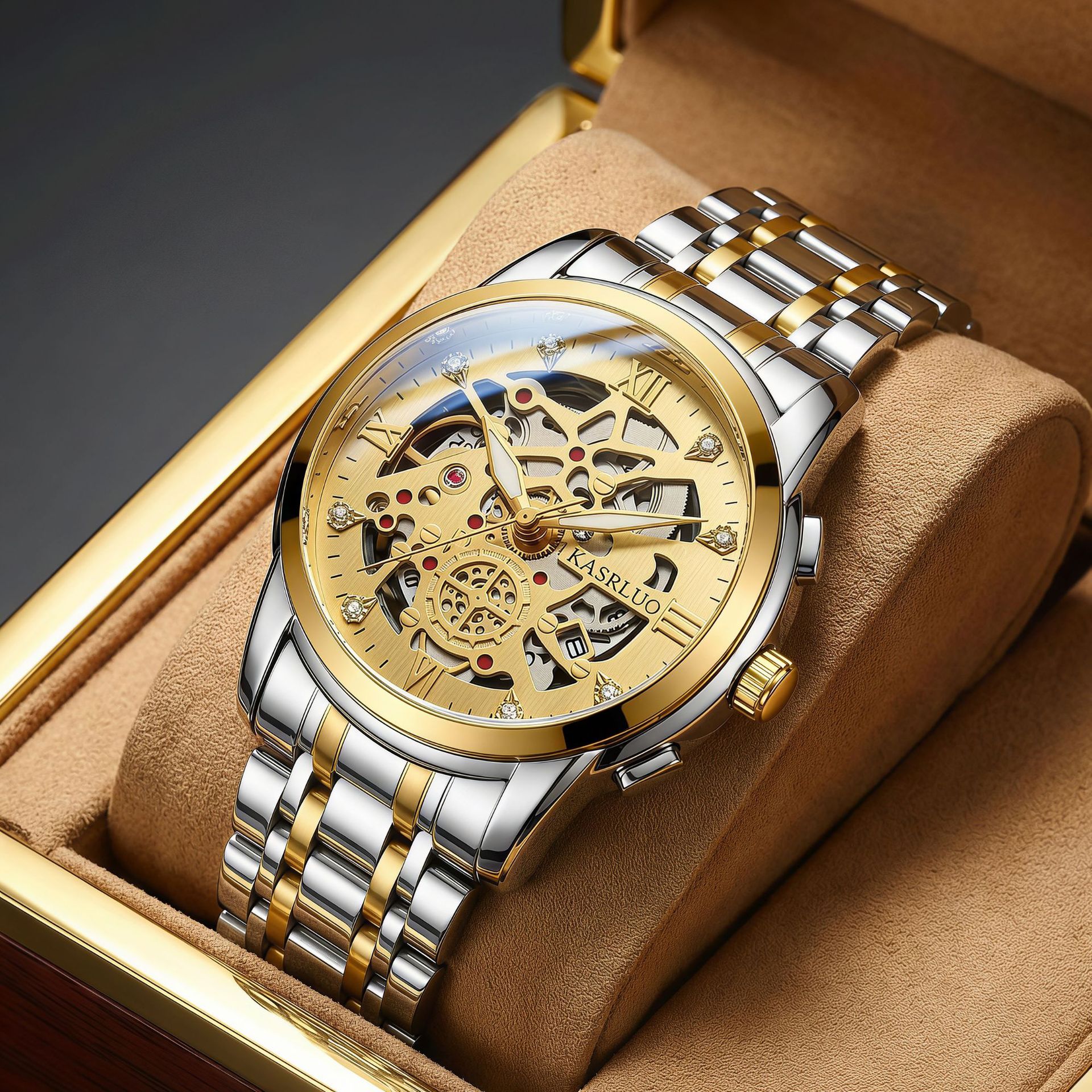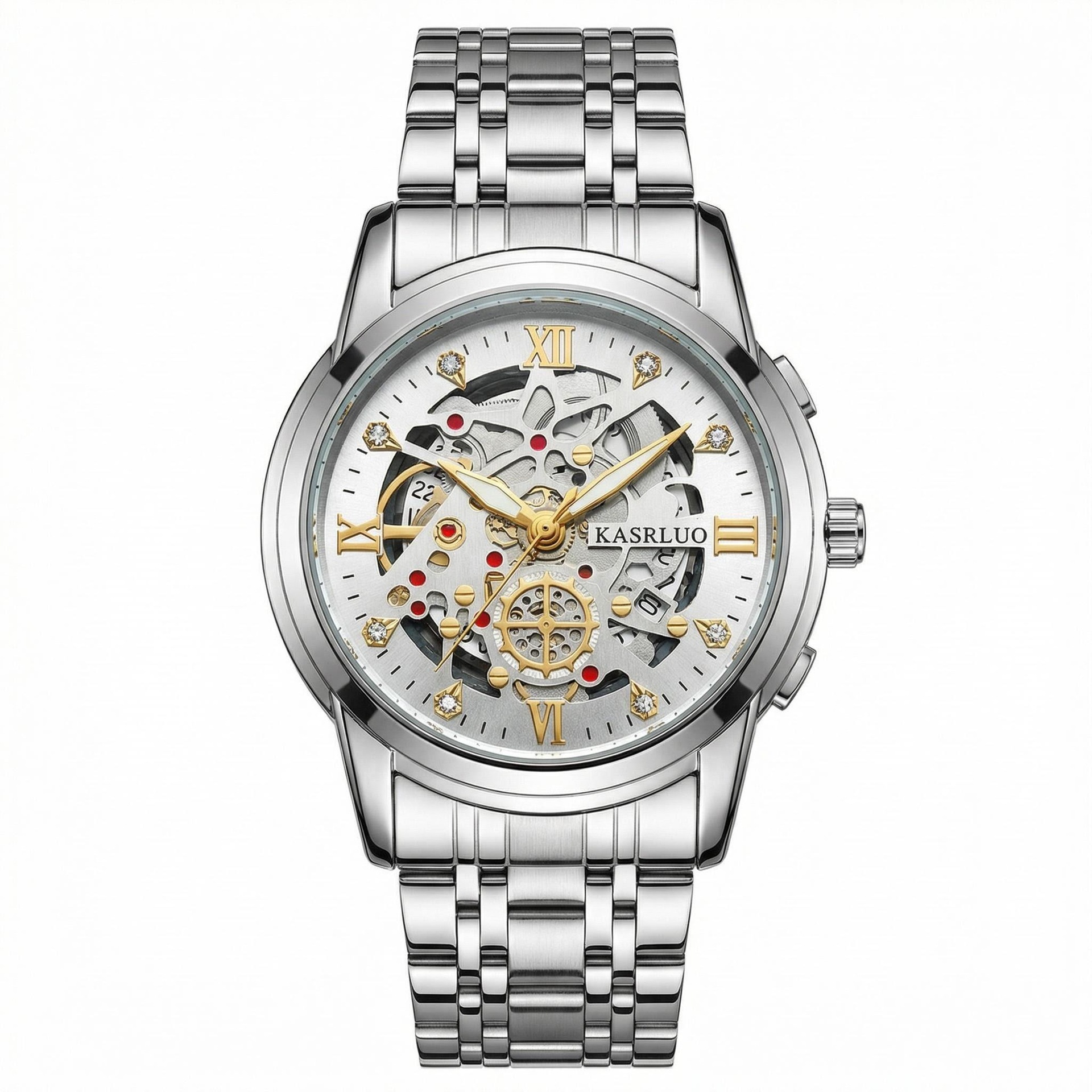 卡萨罗男士手表爆款仿机械表时尚复古商务防水夜光不锈钢镂空手表