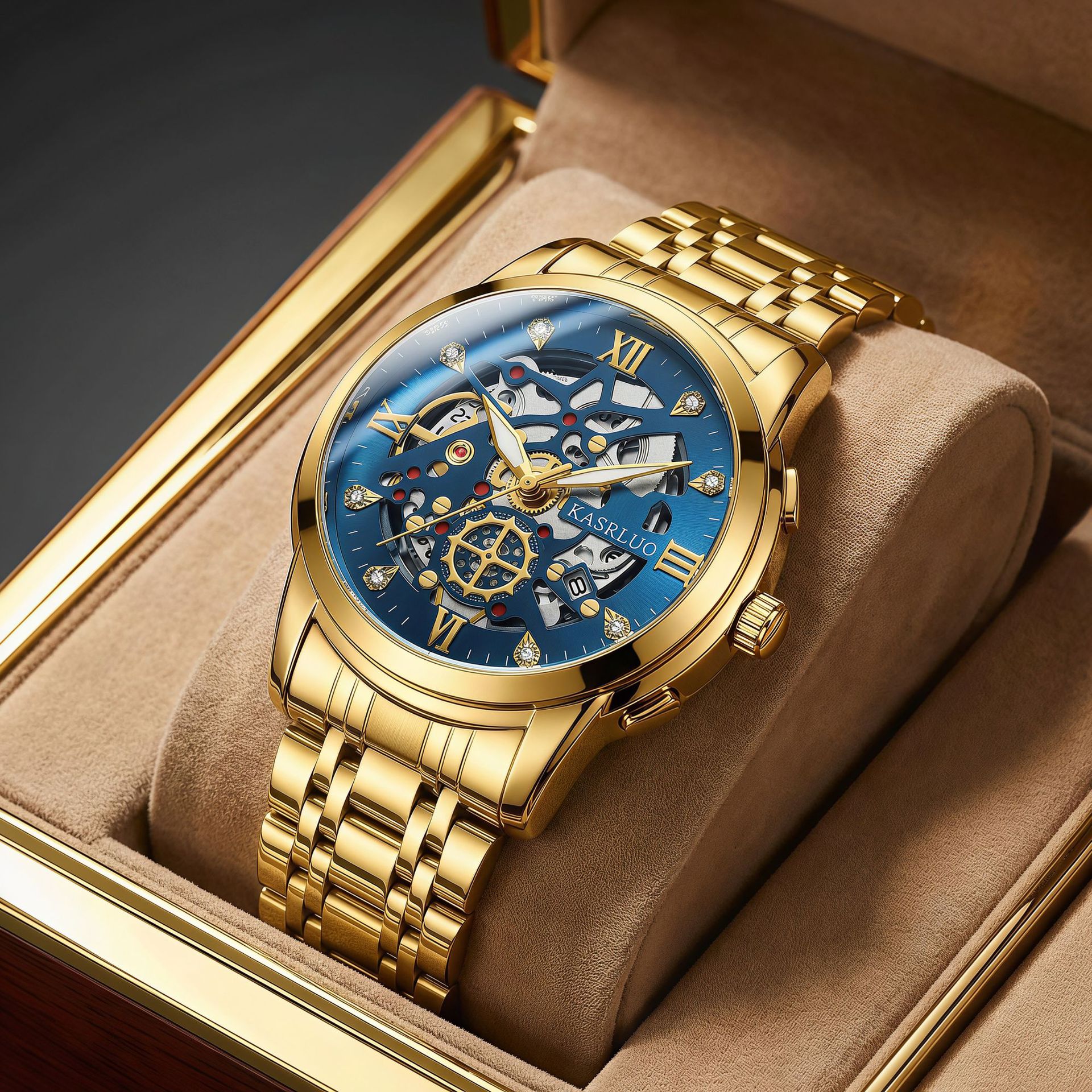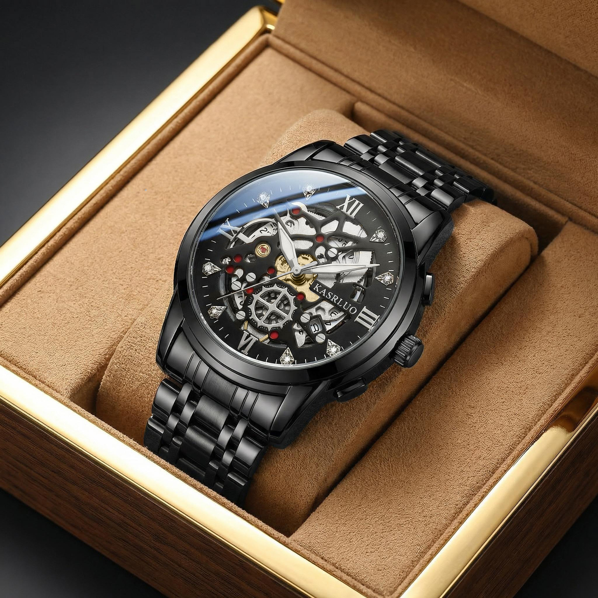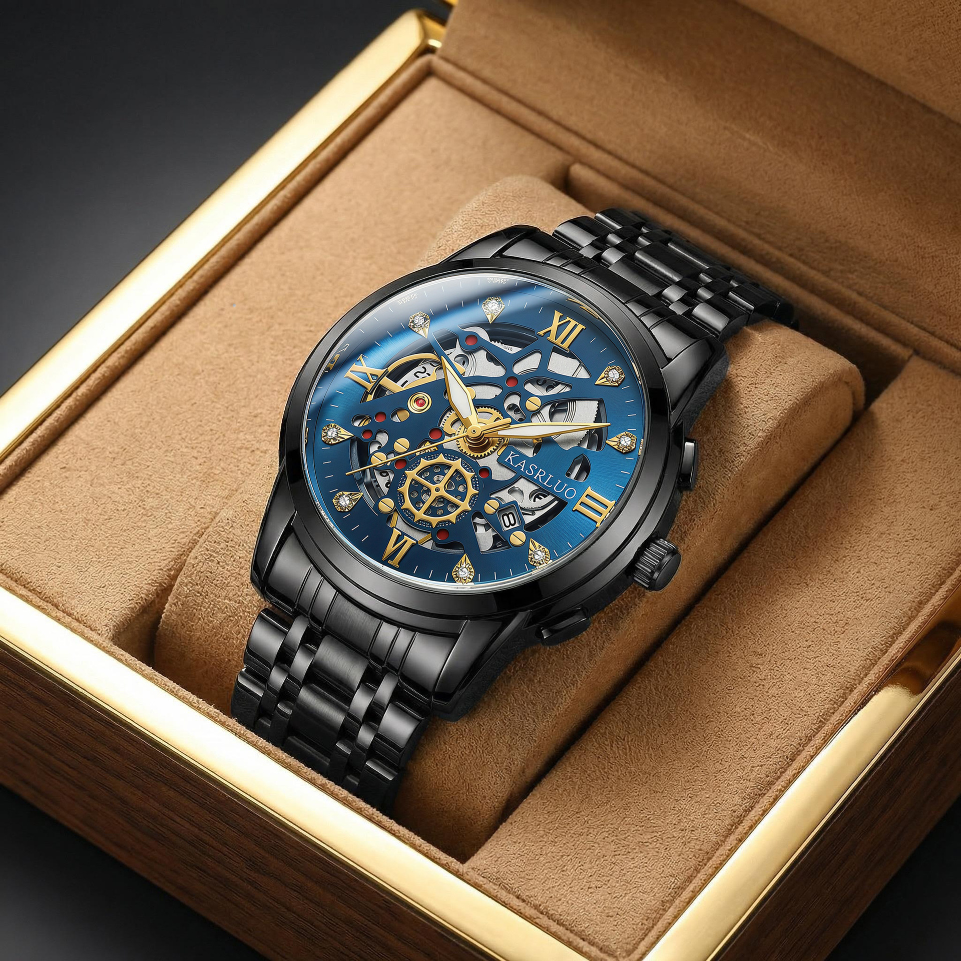 卡萨罗男士手表爆款仿机械表时尚复古商务防水夜光不锈钢镂空手表