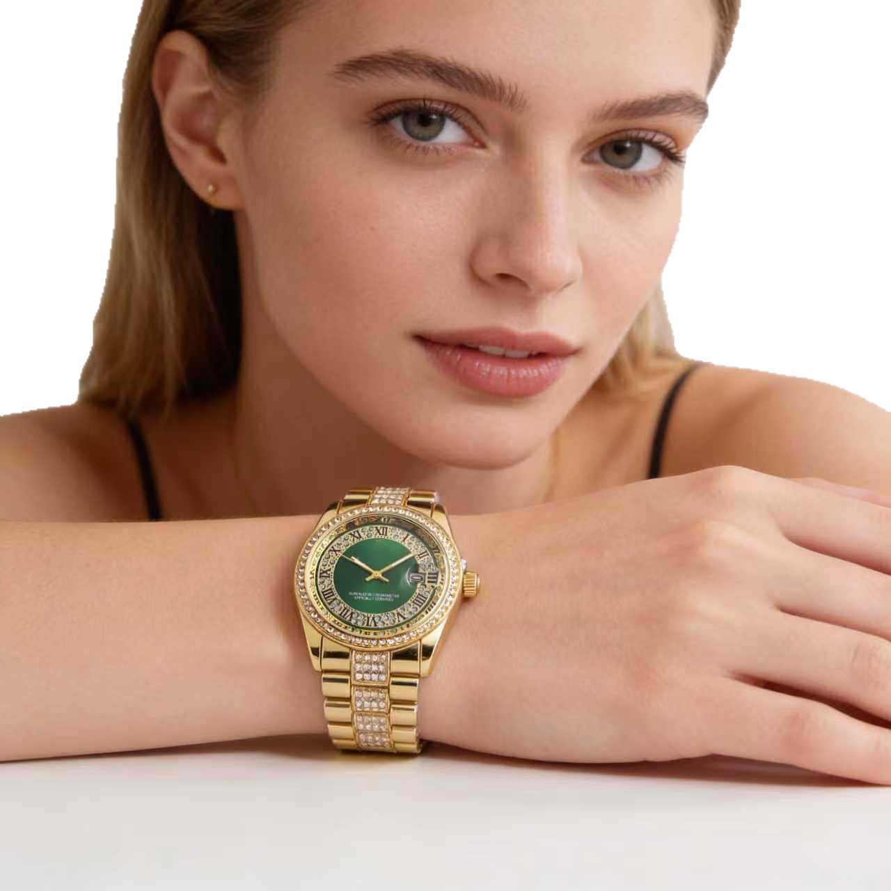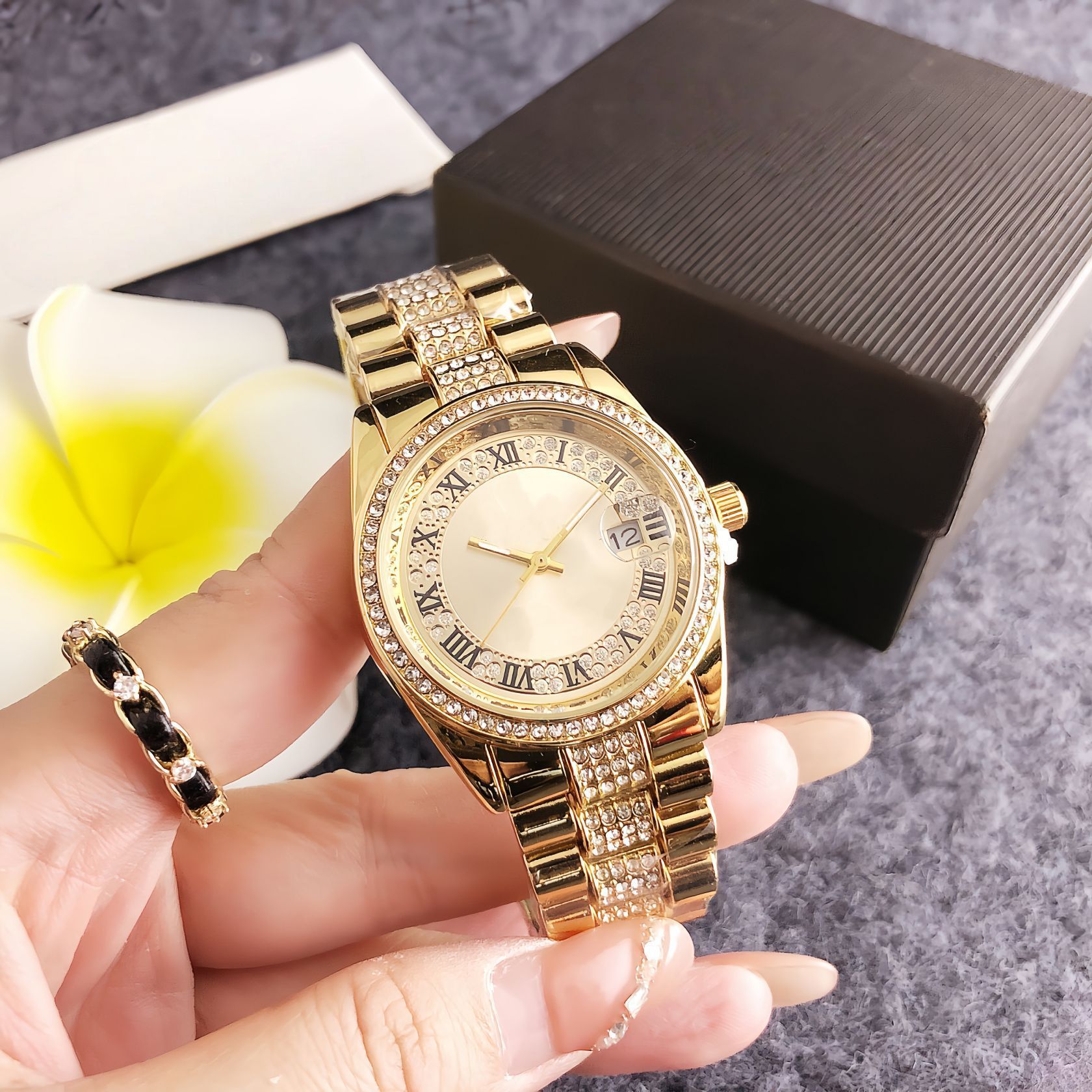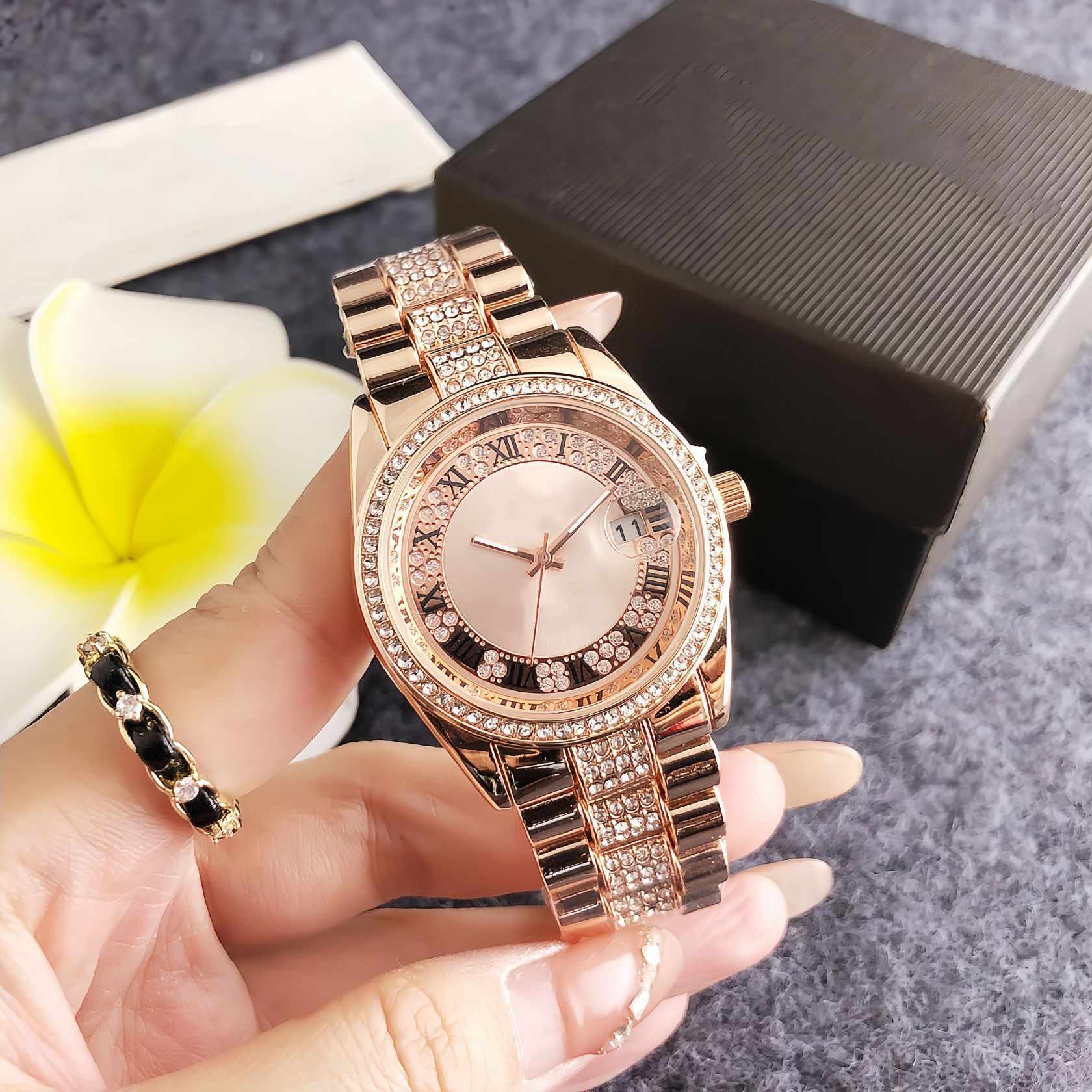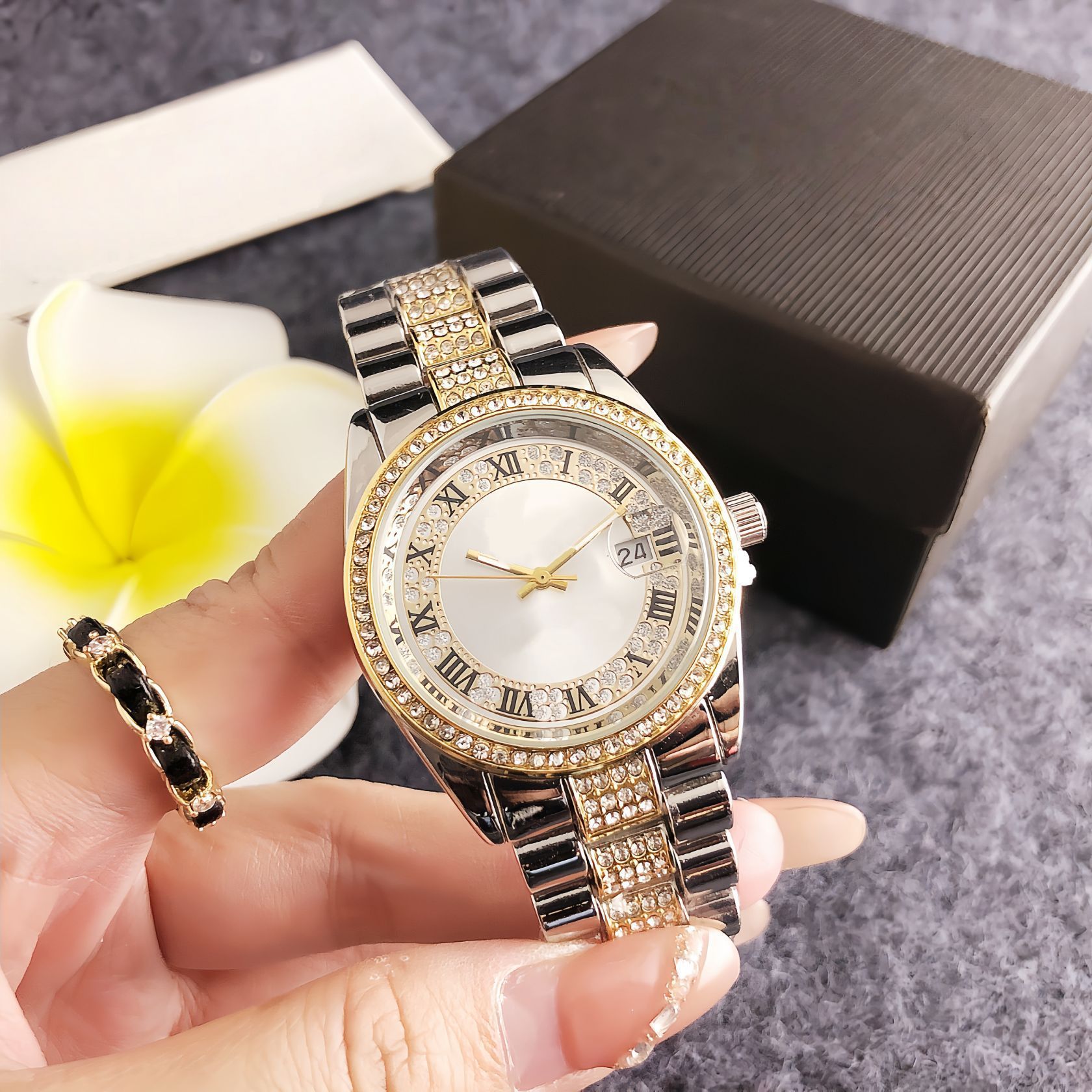 luxo温婉款间金罗马纹女表 双圈钻钢带腕表现货直批 定制标志手表