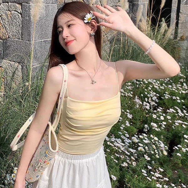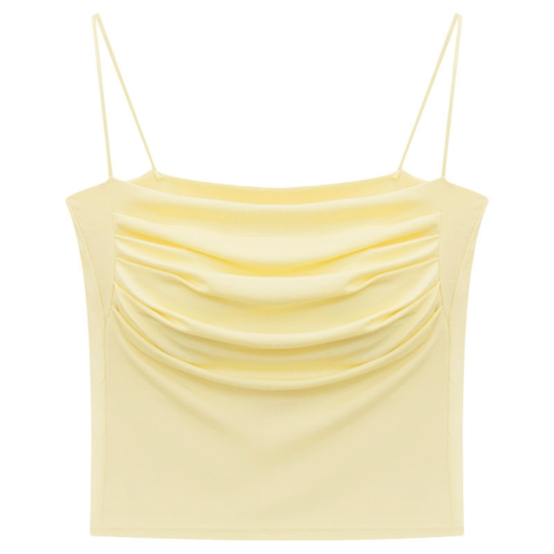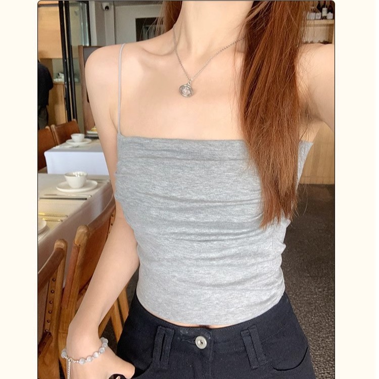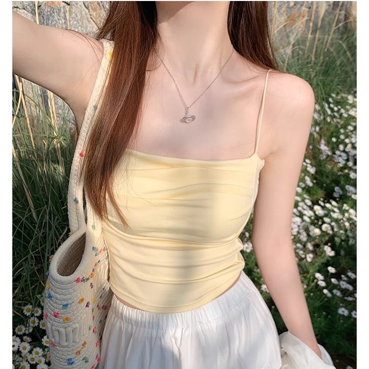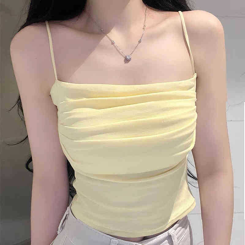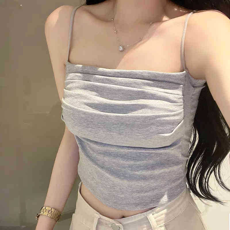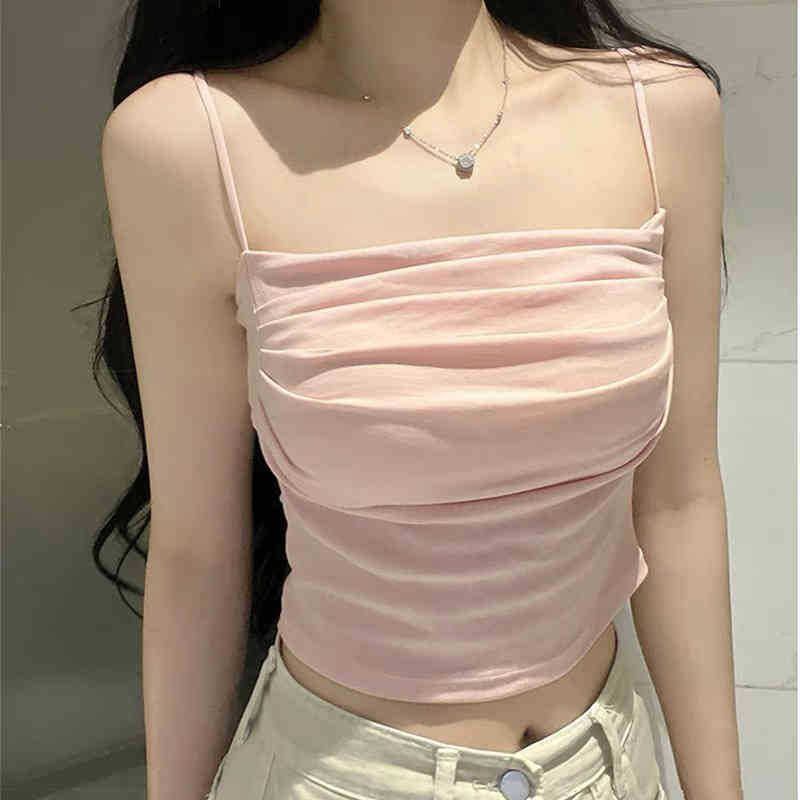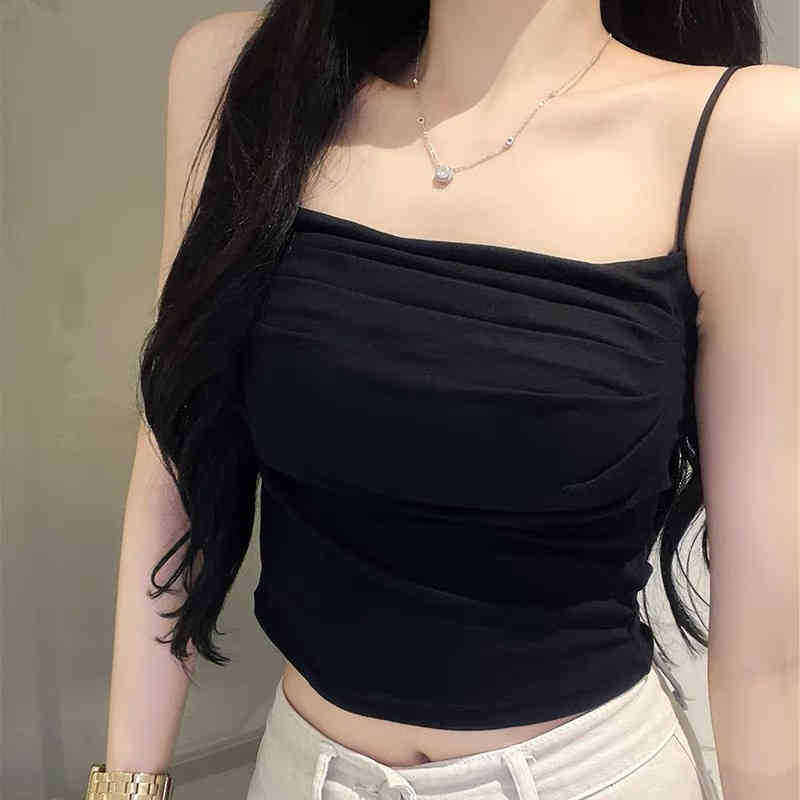韩版纯欲辣妹一字领吊带美背背心带胸垫裹胸褶皱显瘦打底抹胸上衣