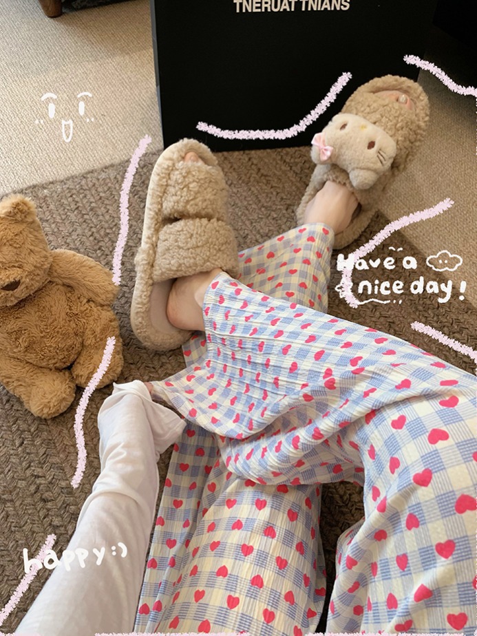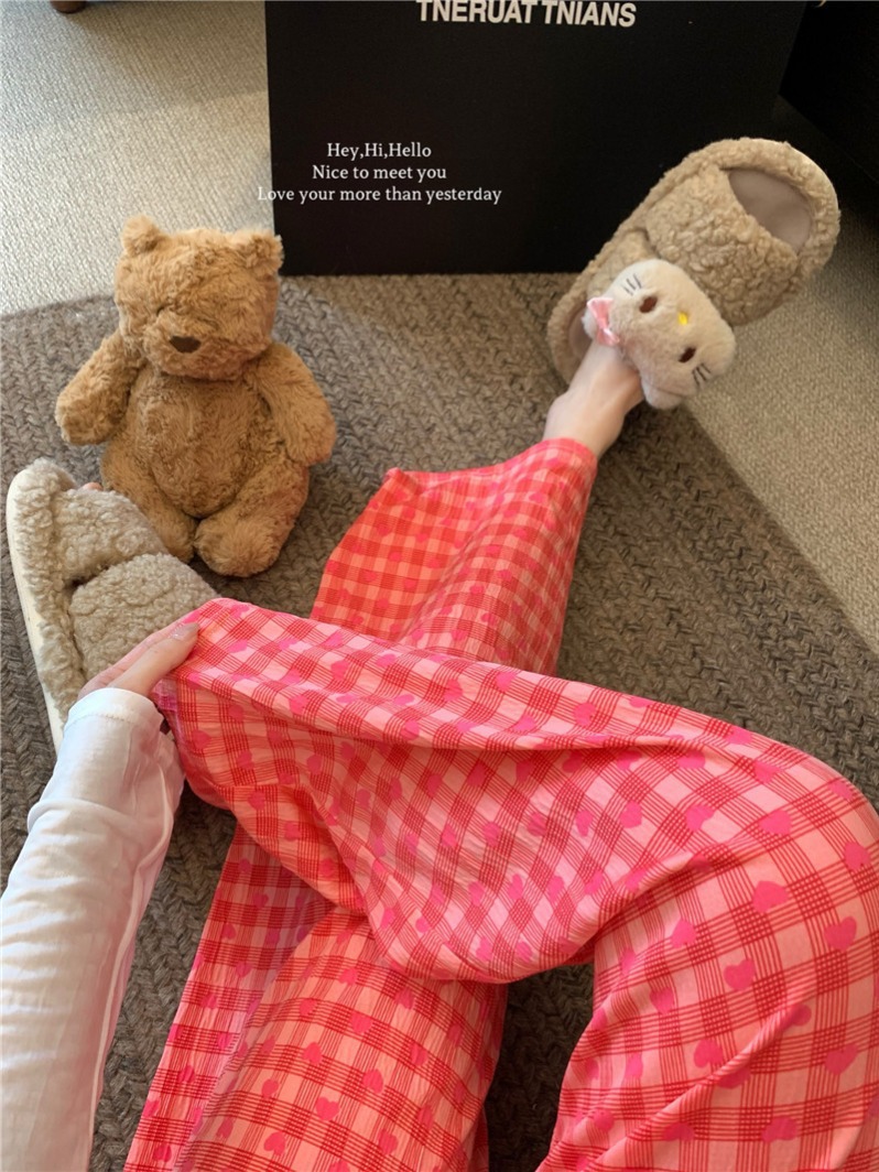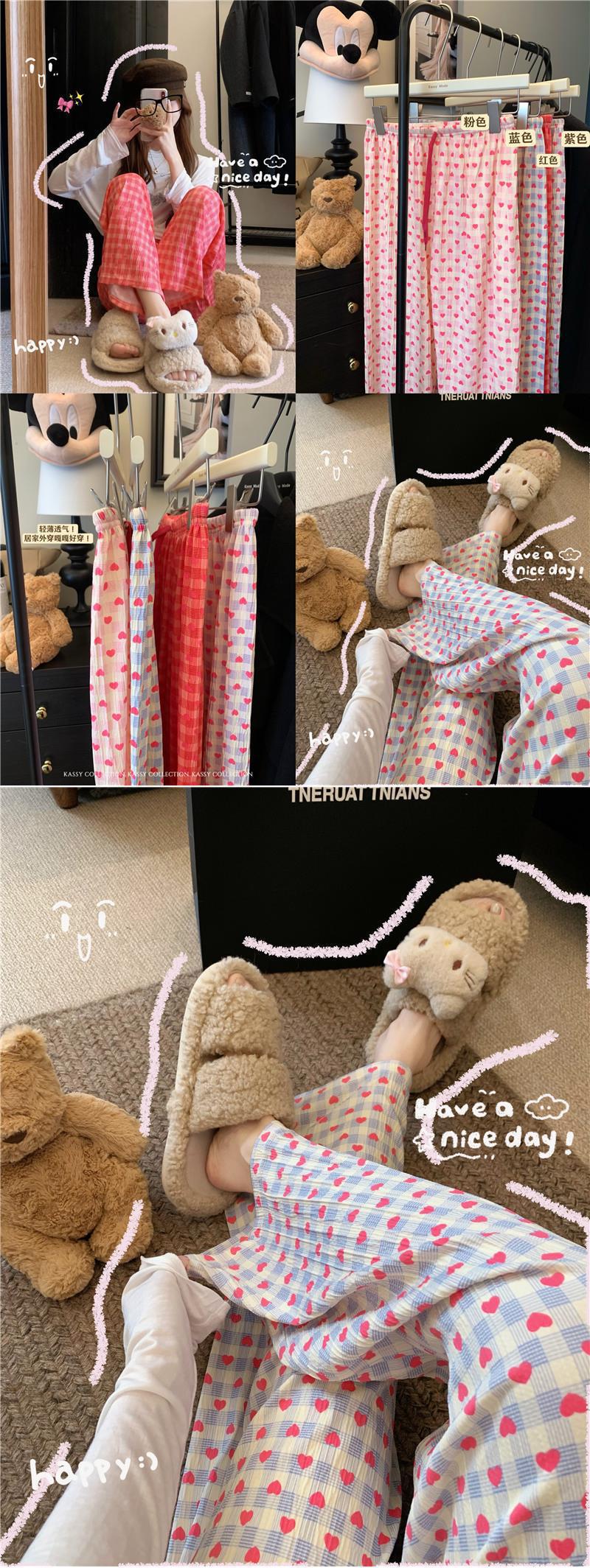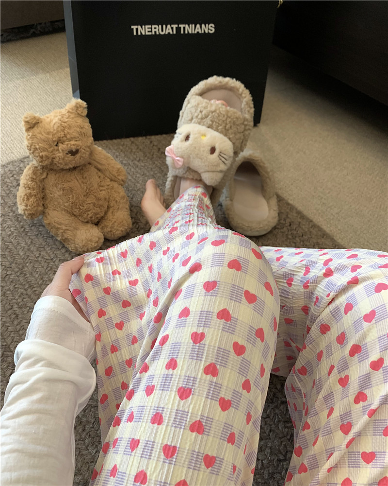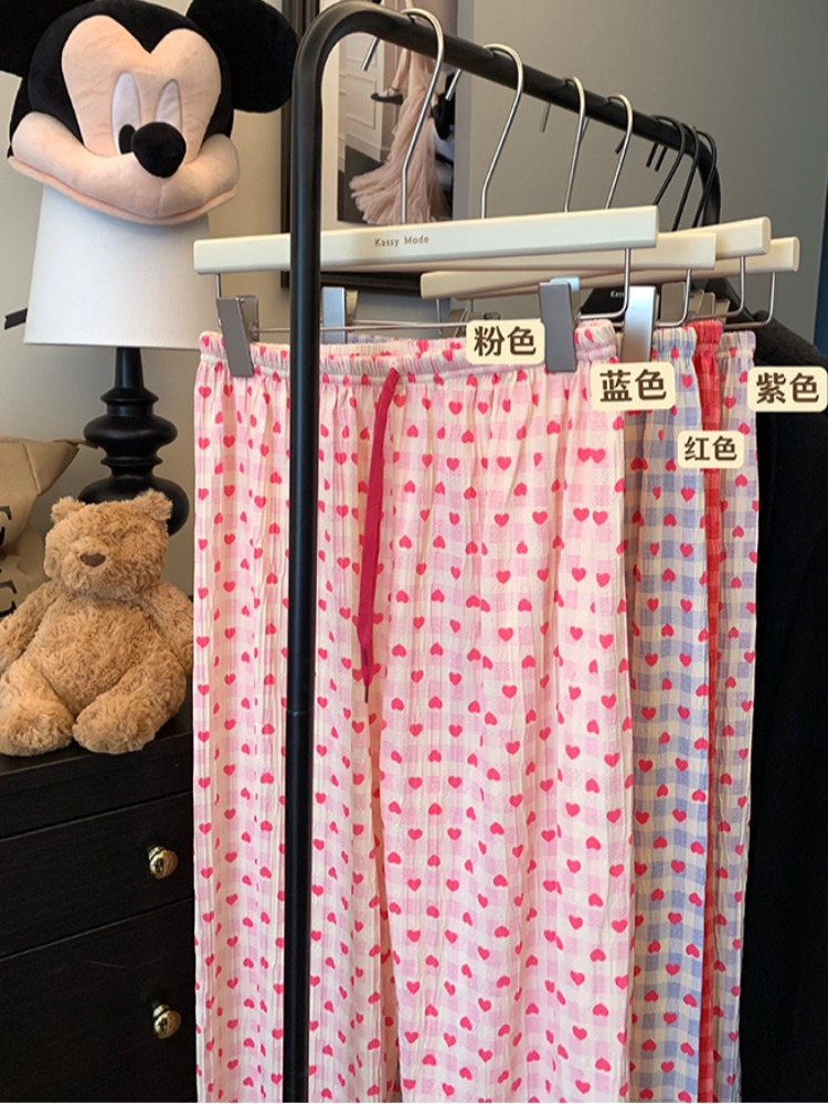 可爱印花睡裤女慵懒风高腰显瘦爱心格子阔腿裤居家外穿遛弯休闲裤