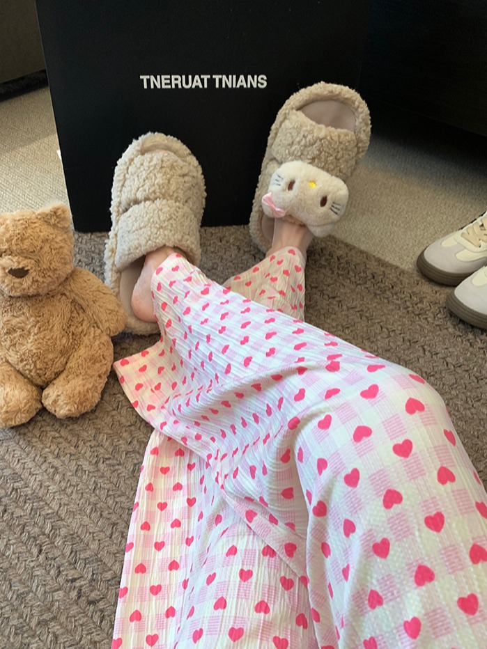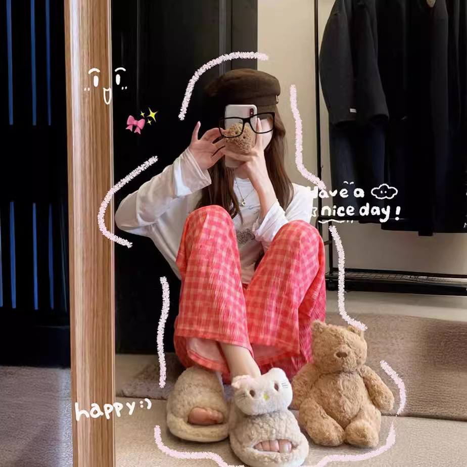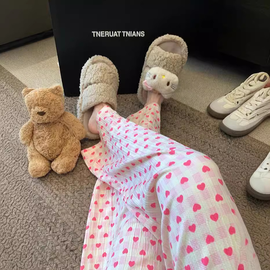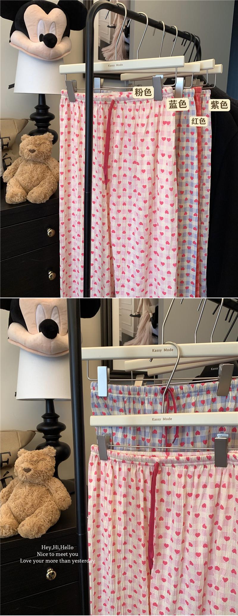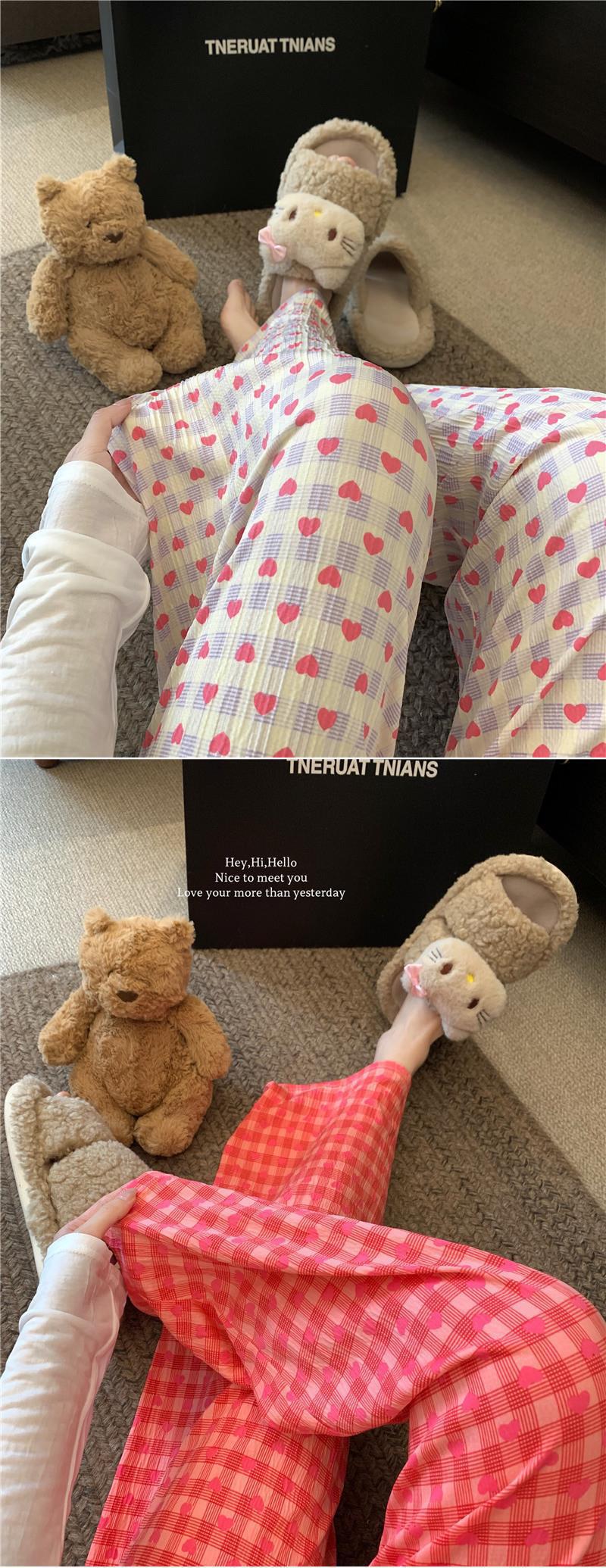 可爱印花睡裤女慵懒风高腰显瘦爱心格子阔腿裤居家外穿遛弯休闲裤
