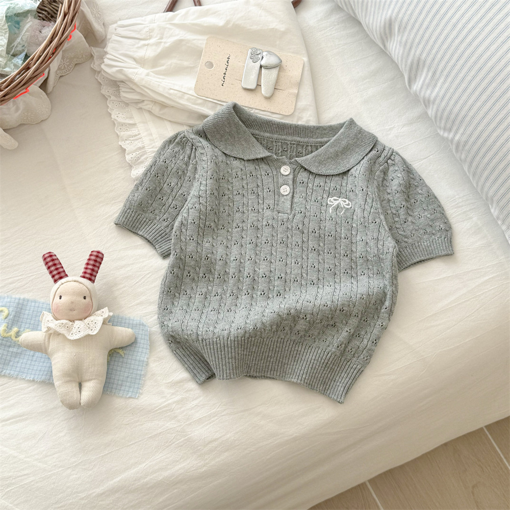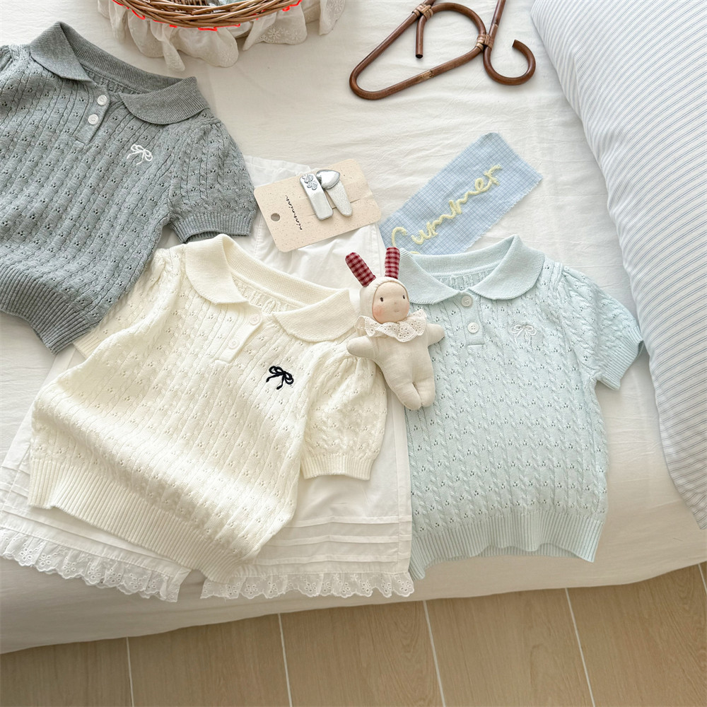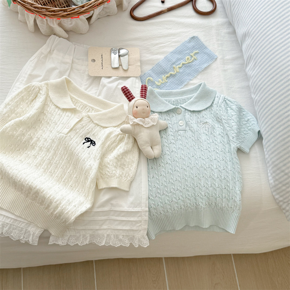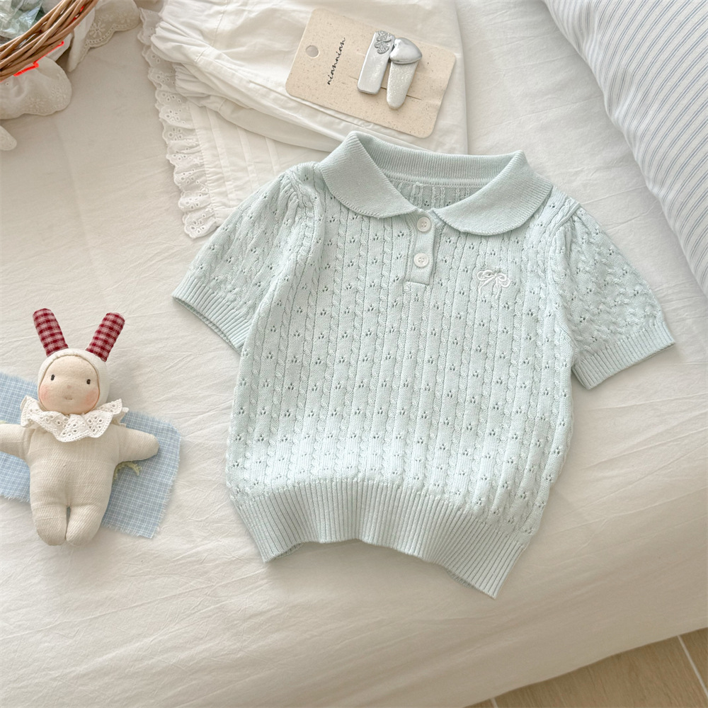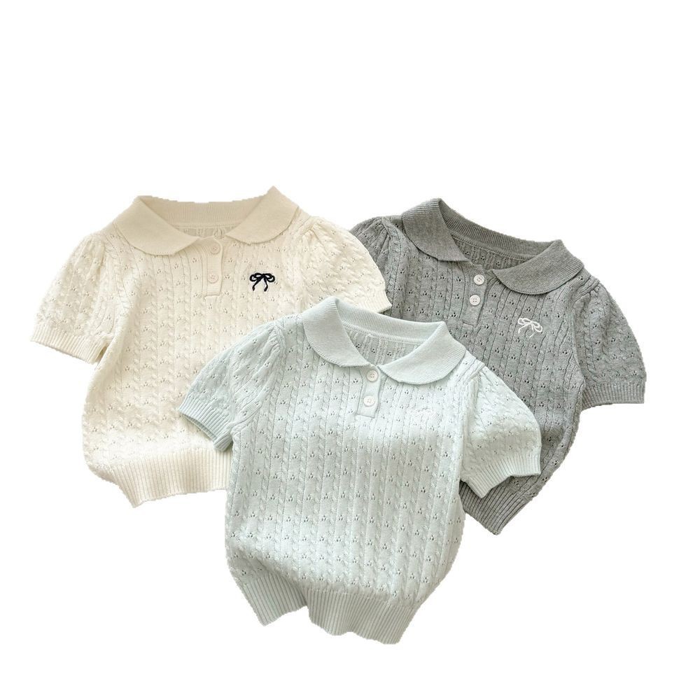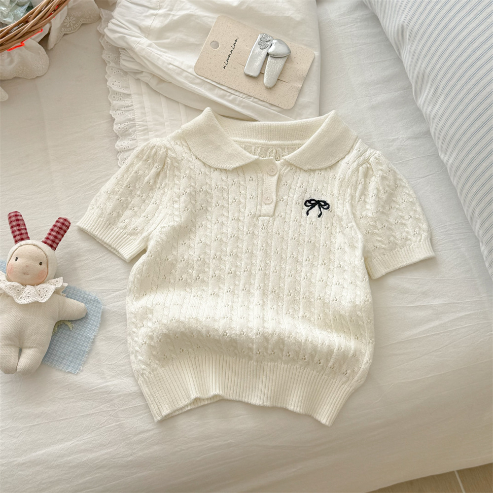 甜小司新款夏装韩版女童装蝴蝶结翻领短袖洋气时髦超好看针织衫潮