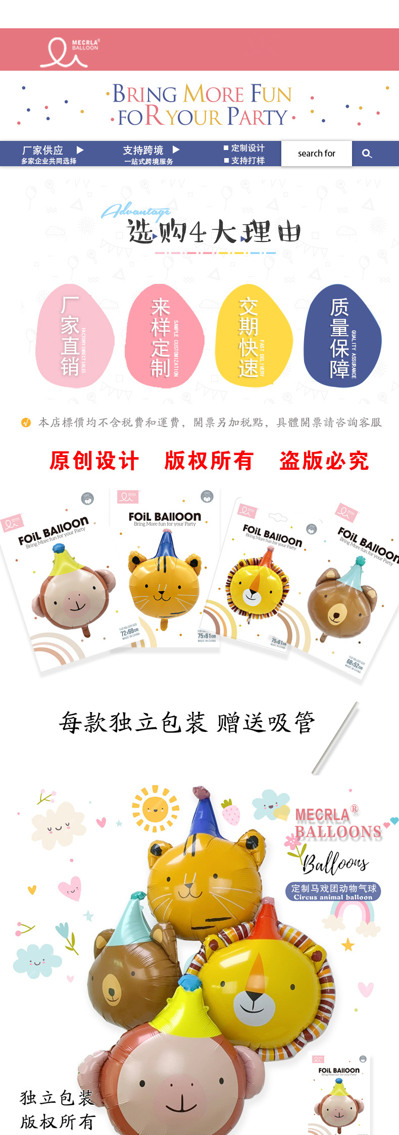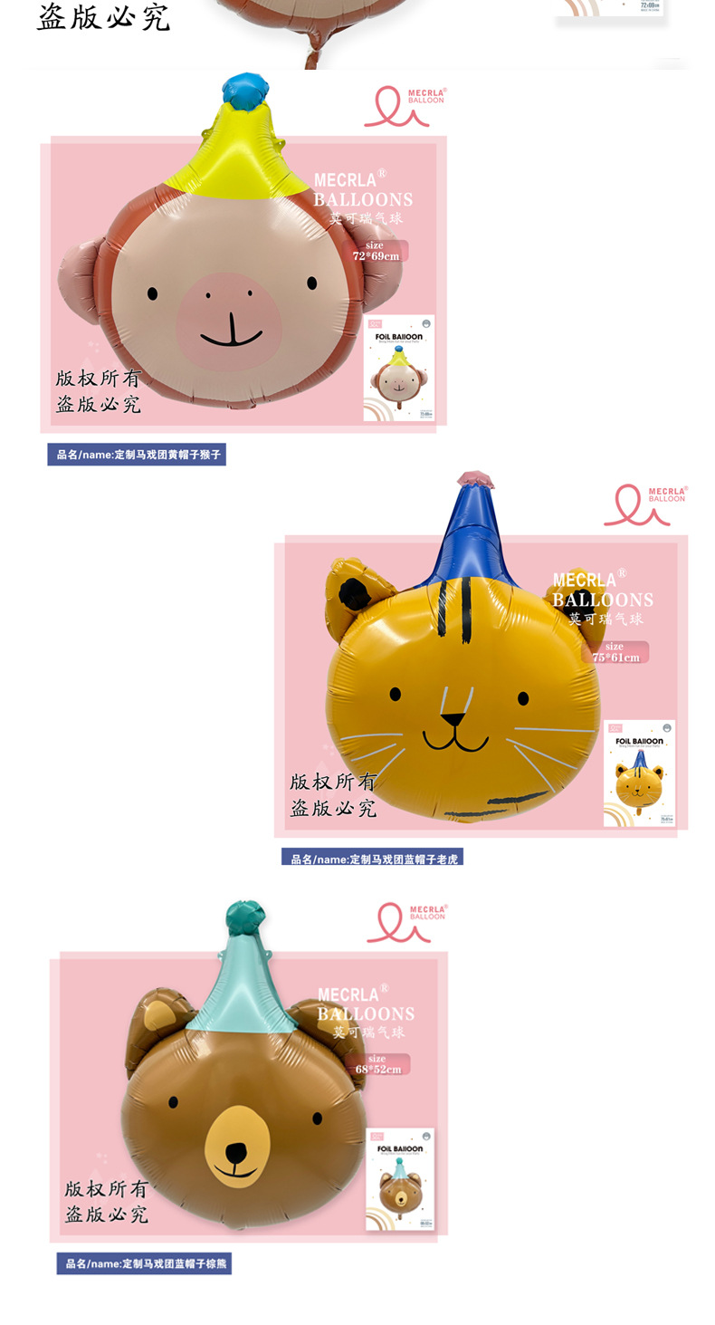 新款马戏团帽子卡通动物主题熊狮子猴子老虎生日派对道具铝膜气球