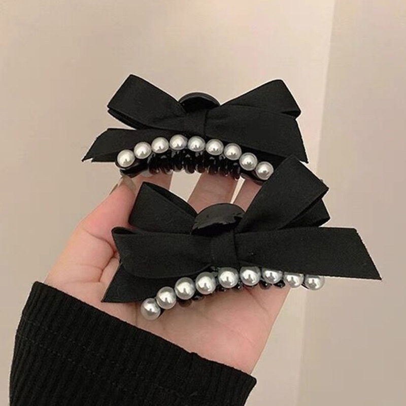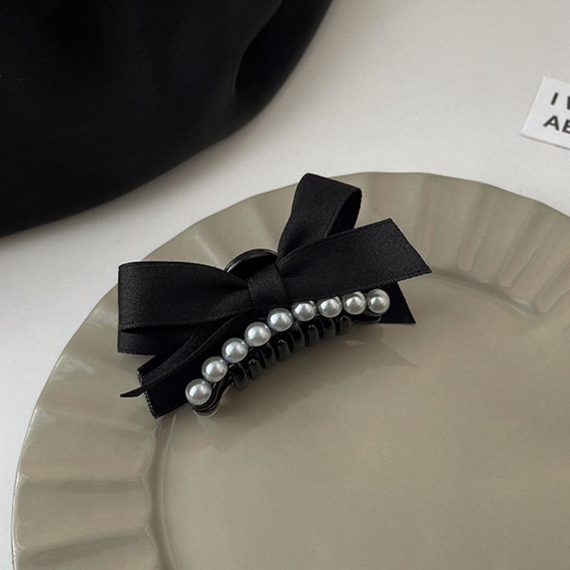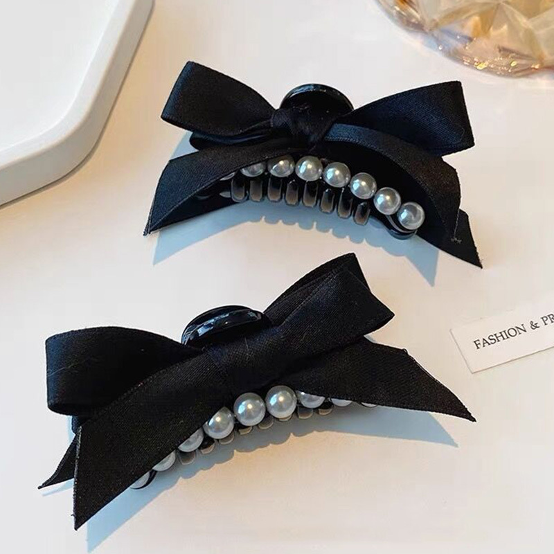 法式赫本风黑色珍珠蝴蝶结抓夹发夹气质设计感鲨鱼夹时尚百搭发饰
