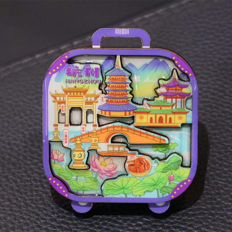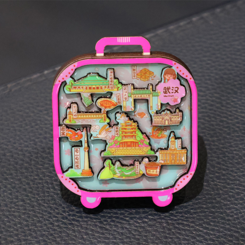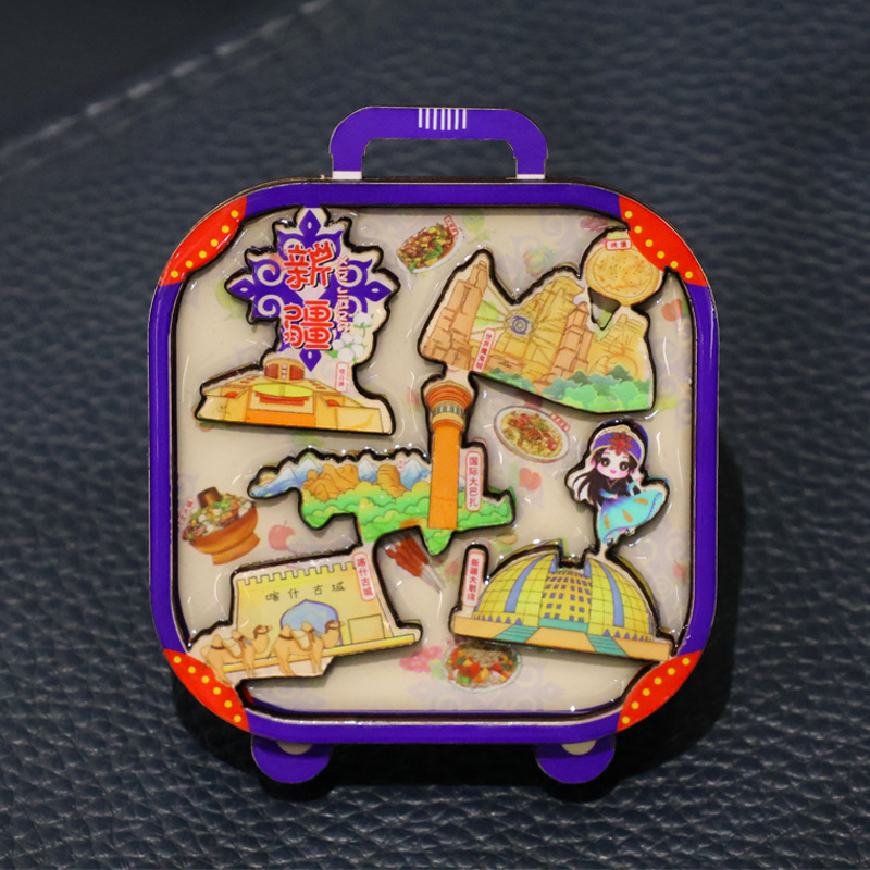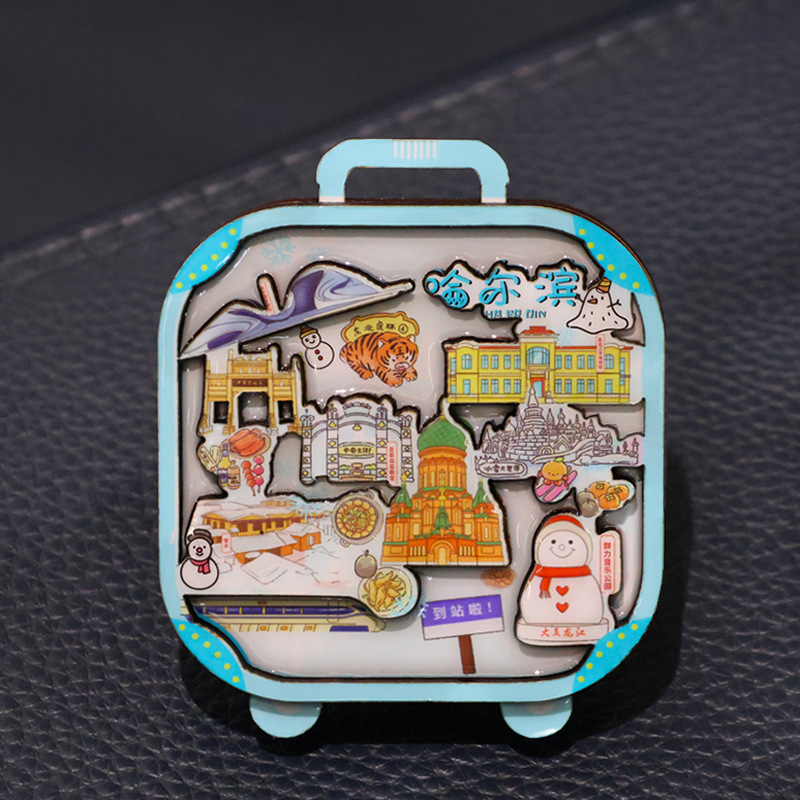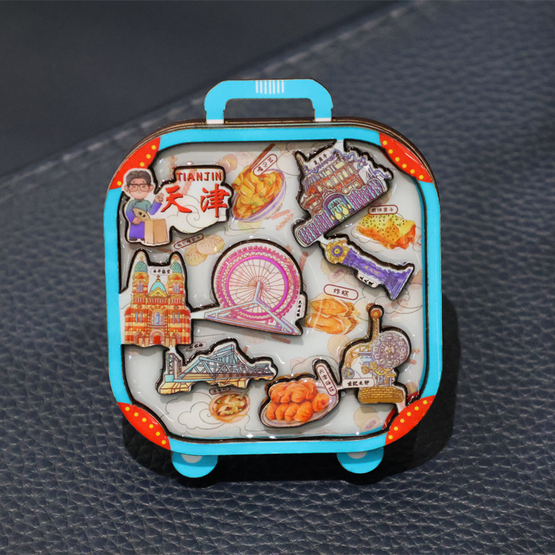 原创设计定制可拉动立体创意滴胶木质行李箱冰箱贴文创城市冰箱贴